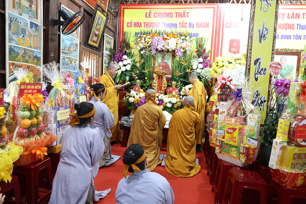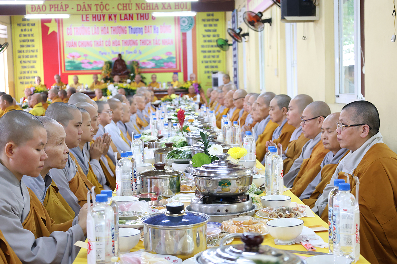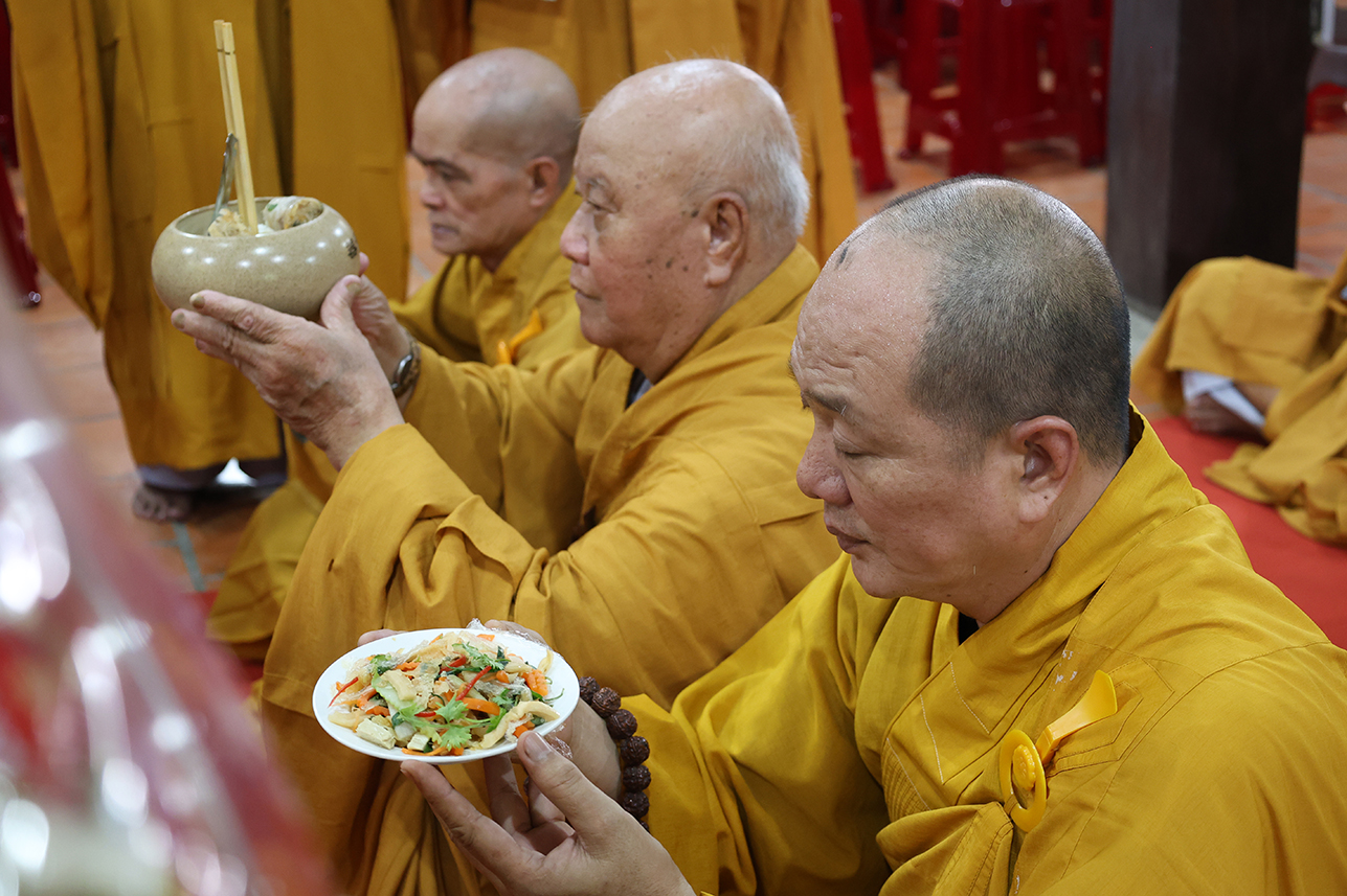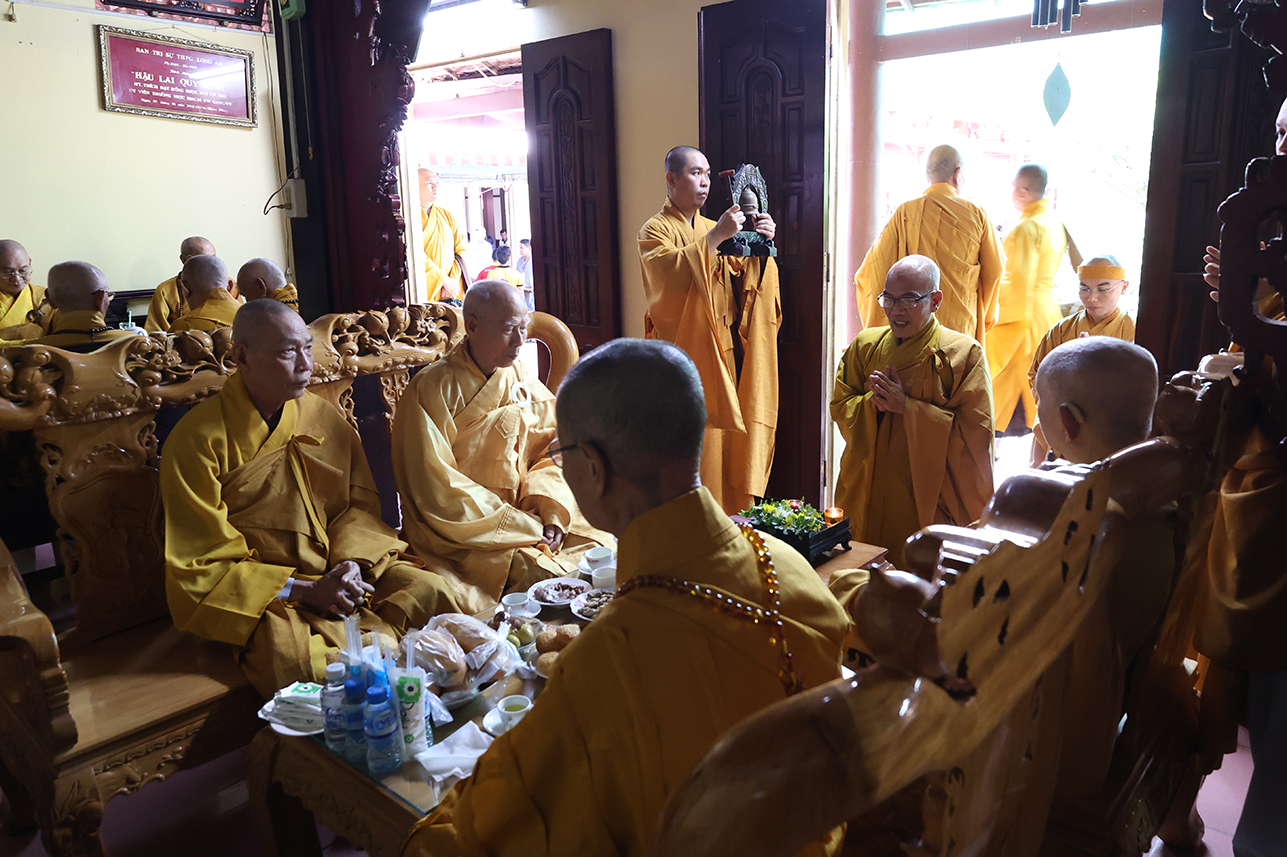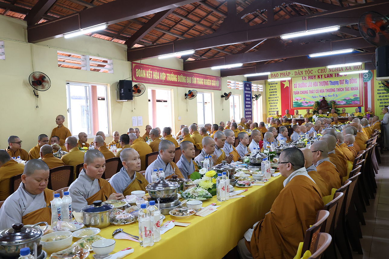 Nghi thức tưởng niệm hoàn mãn, Ban cung nghinh cung thỉnh chư Tôn đức Tăng Ni thân lâm trai đường. Tại đây, trong sự chứng minh của chư Tôn đức, Đại đức Tắc Hòa dâng lời tác bạch cúng dường.