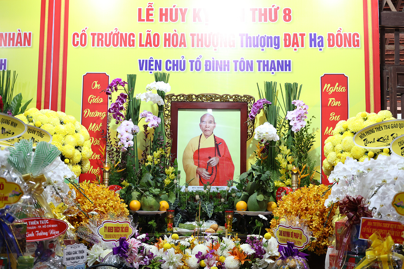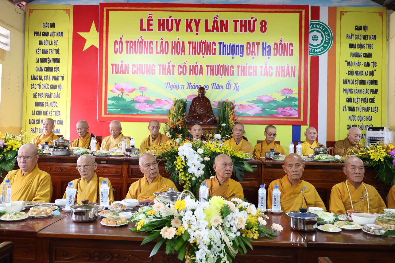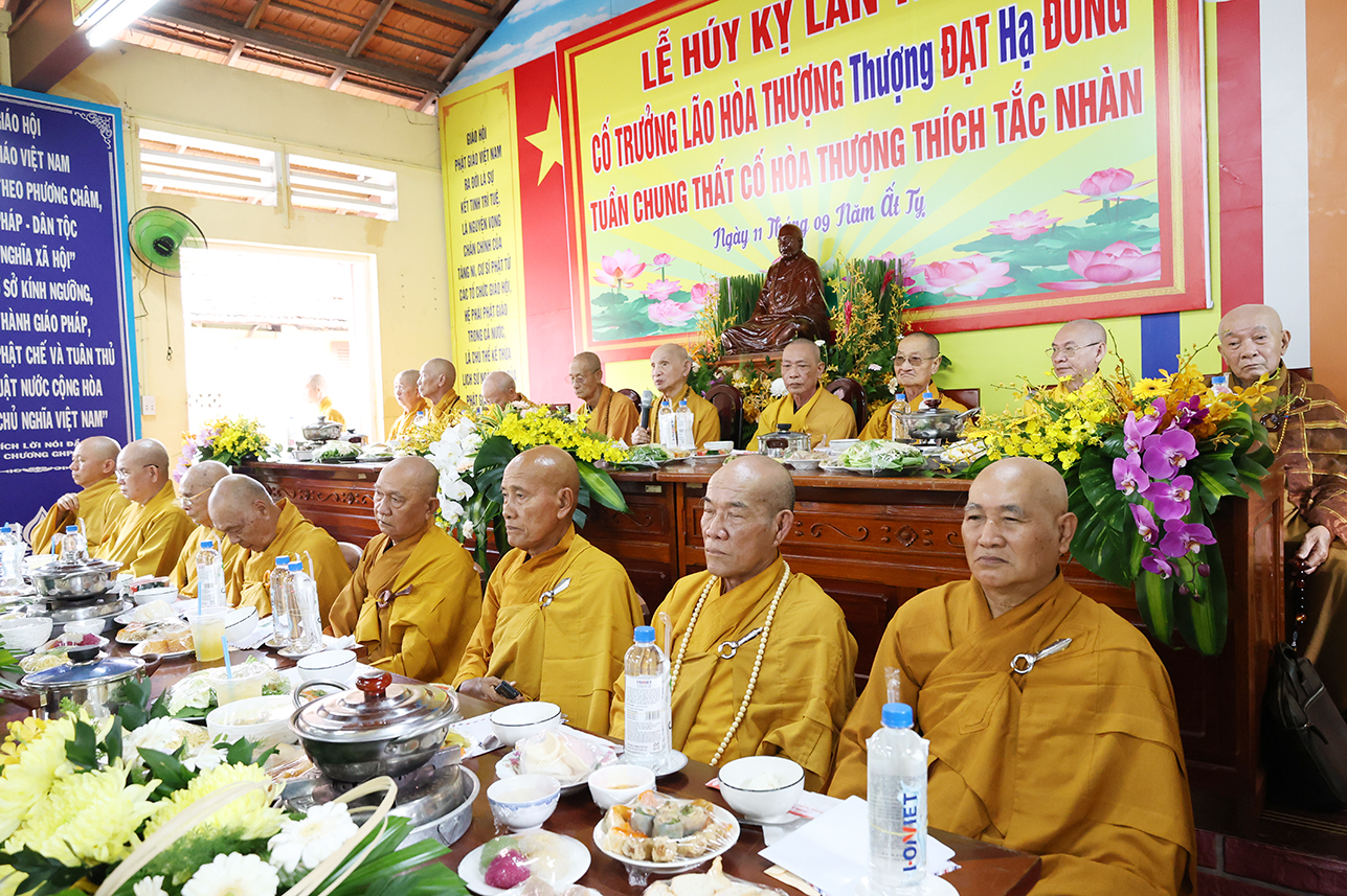 Đáp lời cung thỉnh của Ban Tổ chức, Trưởng lão Hòa thượng Thích Giác Hạnh – Chứng minh Ban Trị sự Phật giáo huyện Cần Đước (cũ) đương vi chứng minh ban đạo từ. Hòa thượng ôn tồn nhắc lại kỷ niệm một thời từng đến Tôn Thạnh kết thiện duyên cùng Trưởng lão thượng Đạt hạ Đồng. Với tình pháp lữ Linh Sơn, Hòa thượng hết lời ca ngợi công hạnh của Trưởng lão, một vị chân tu hòa nhã đôn hậu, giới đức trang nghiêm, ngôn hành hợp nhất. Từng cử chỉ, hành động và lời nói của Ngài đều thể hiện tinh thần từ bi vô ngã đáng để hậu học noi gương. Ảnh hưởng đạo phong tuyệt vời ấy, Hòa thượng Thích Tắc Nhàn cũng là một trong những môn hạ ưu tú, chất phác hiền hòa, nhiều năm cống hiến phụng sự, cần mẫn trợ duyên bên cạnh Ân sư, đến nay lại duyên trùng duyên hội ngộ cùng có chung một ngày lễ niệm.