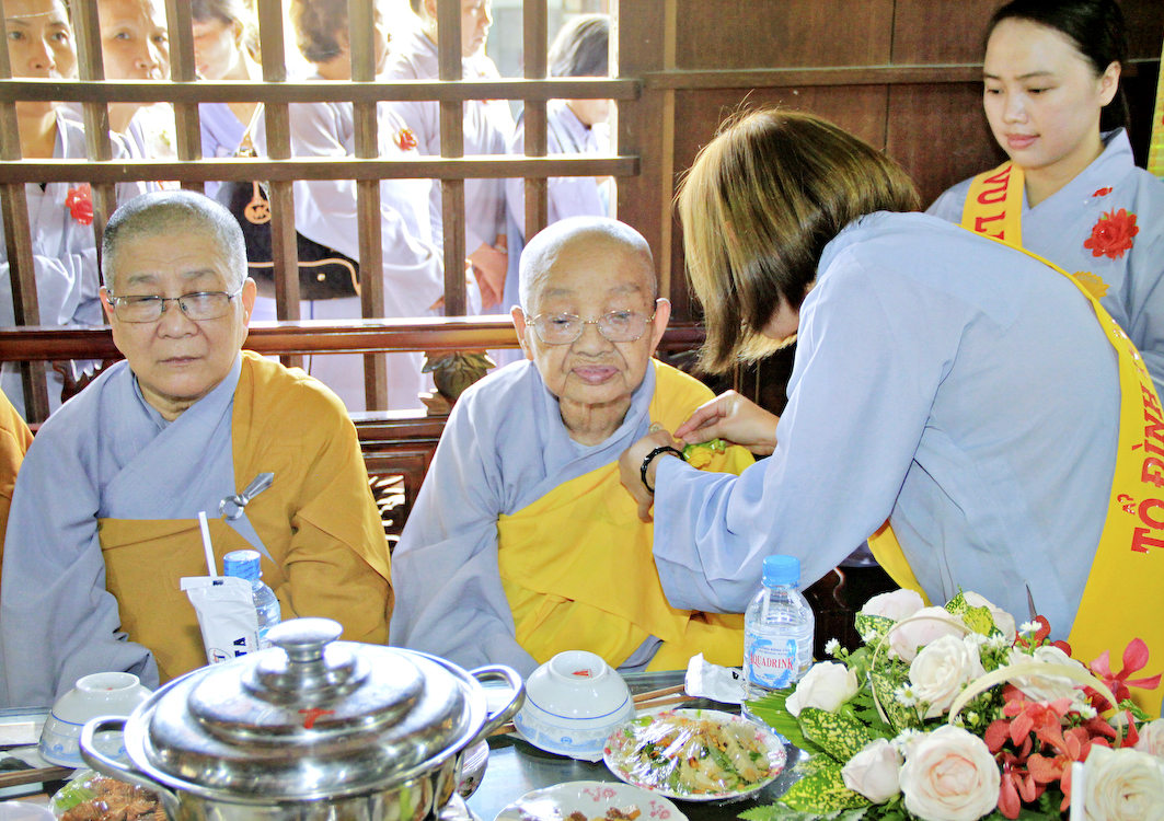 Giờ lành đã đến, pháp sự hợp thời, theo lời dẫn thỉnh của ĐĐ. Thích Tắc Hòa, các Phật tử kính cài hoa hồng kính mừng khánh tuế chư Tôn đức chứng minh, và thực hiện các nghi thức tác bạch cúng dường, nhiễu hành dâng pháp y.