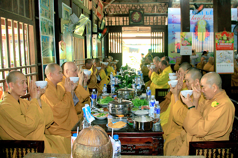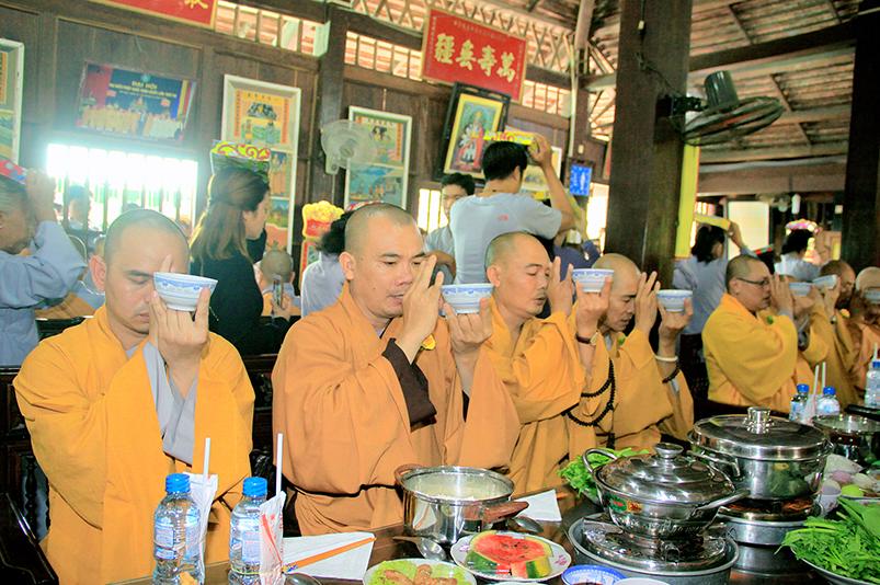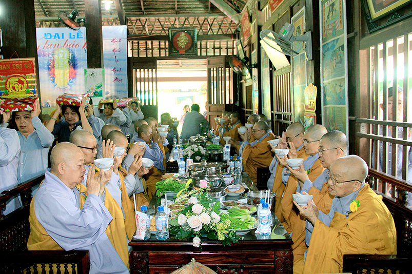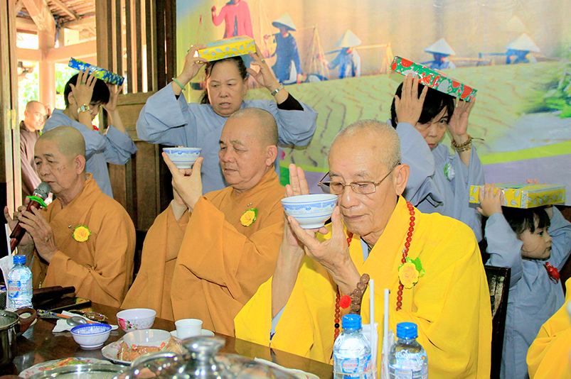 Trong không gian trang trọng của trai đường, trước sự chứng minh của chư Tôn thiền đức, Đại đức Thích Tắc Hòa đãi lao Hòa thượng Trụ trì Thích Tắc Phi cùng chư Tôn đức Tăng Ni tại Tổ đình kính dâng lời tác bạch hoài niệm Vu Lan.