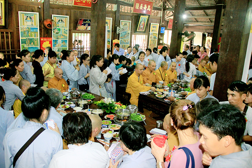 Trong phần nghi thức trai đường, các Phật tử nhiễu hành dâng pháp y cúng dường chư Tôn đức (140 vị); sau khi buổi lễ hoàn thành, cung tiễn chư Tôn đức hồi quy trú xứ, Ban kinh sư tiếp tục chuẩn bị đăng đàn Chẩn tế Đại thí Vô giá hội.