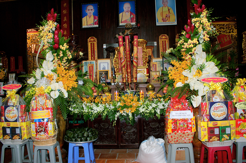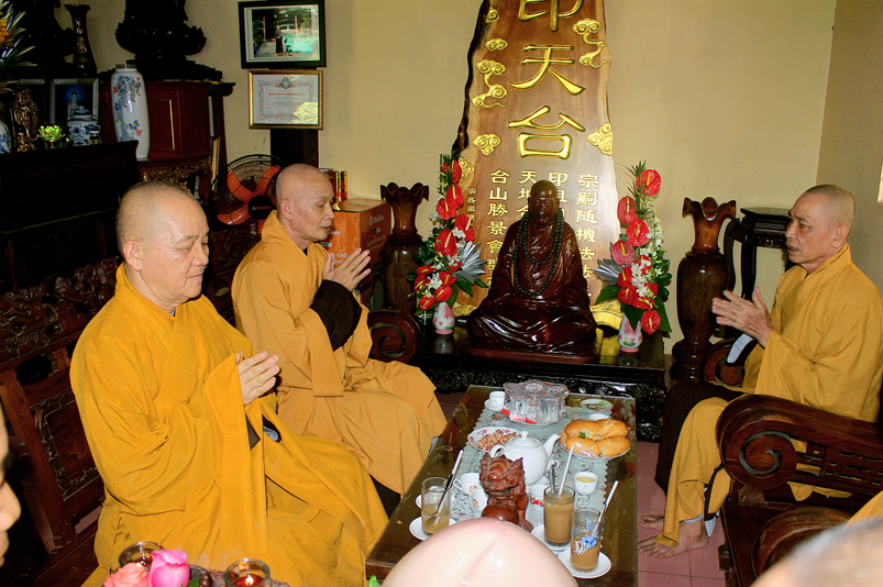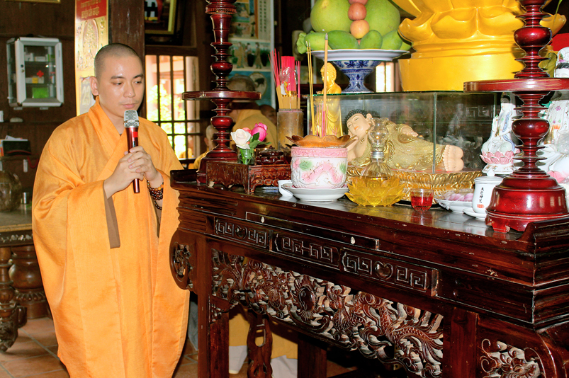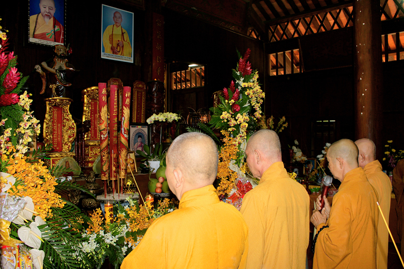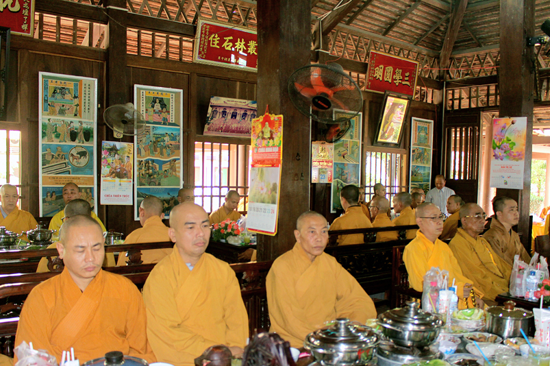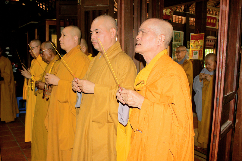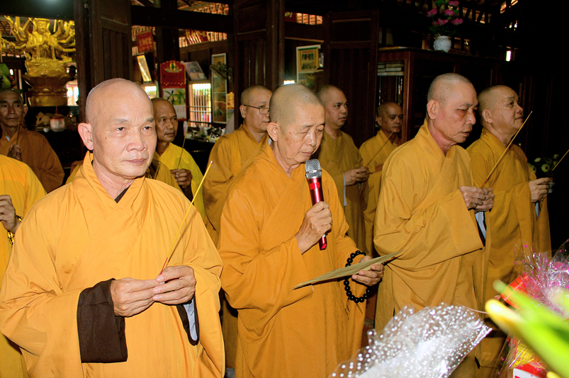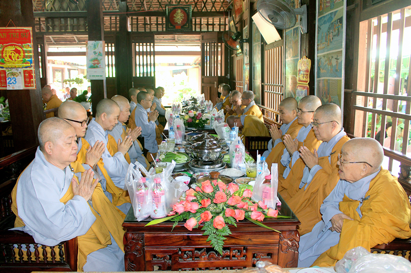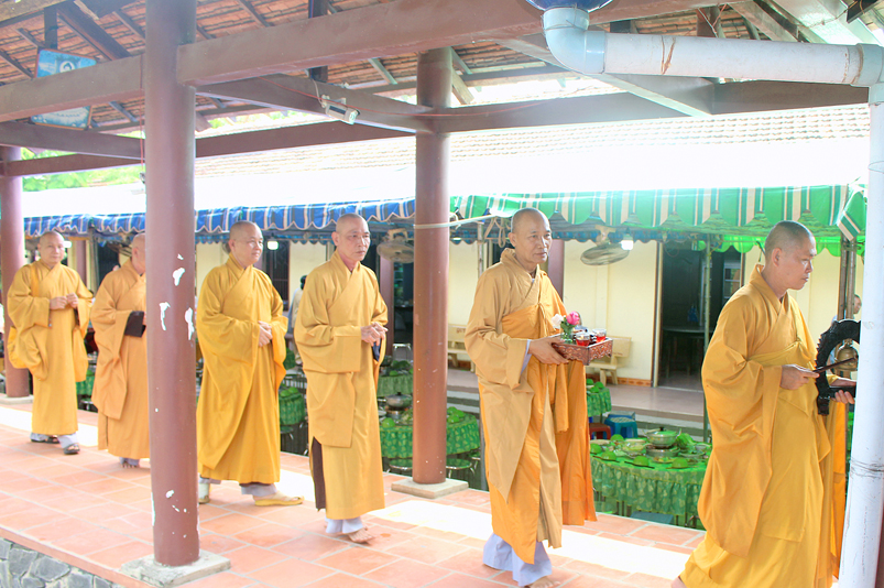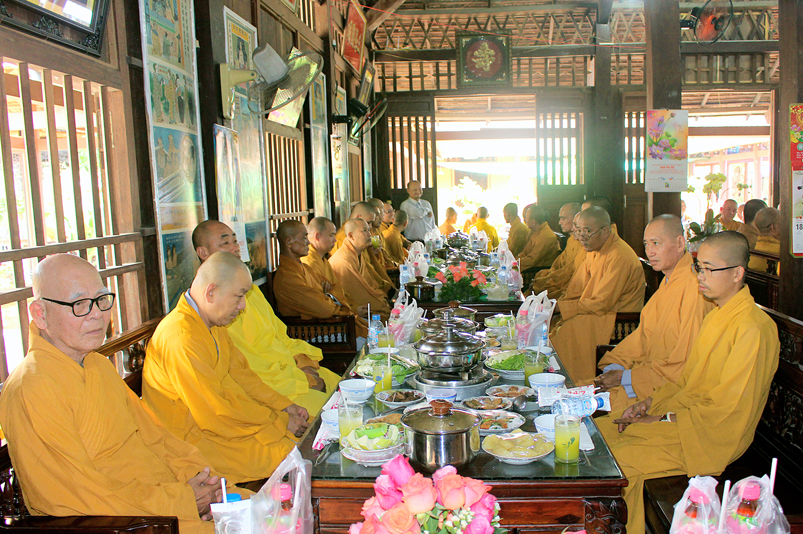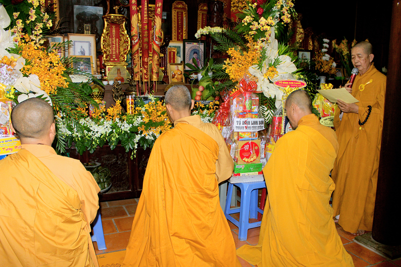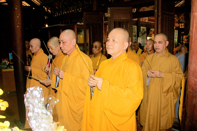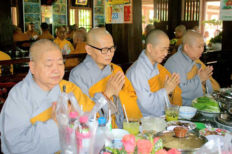 Đến 10g, Ban Nghi lễ cung thỉnh chư Tôn đức Giáo phẩm: HT. Thích Thiện Huệ – CMBTS GHPGVN tỉnh Long An; HT. Thích Minh Thiện – Ủy viên HĐTS, Phó Trưởng ban HPTW, Trưởng Ban Trị sự GHPGVN tỉnh Long An cùng chư Tôn đức Thường trực Ban Trị sự Phật giáo tỉnh Long An, chư Tôn đức Thường trực Ban Trị sự Phật giáo huyện Cần Giuộc, chư Tăng Ni thân lâm Tổ đường dâng hương tưởng niệm Tổ sư; tiếp đó cung thỉnh quý Ngài chứng dự trai đường.