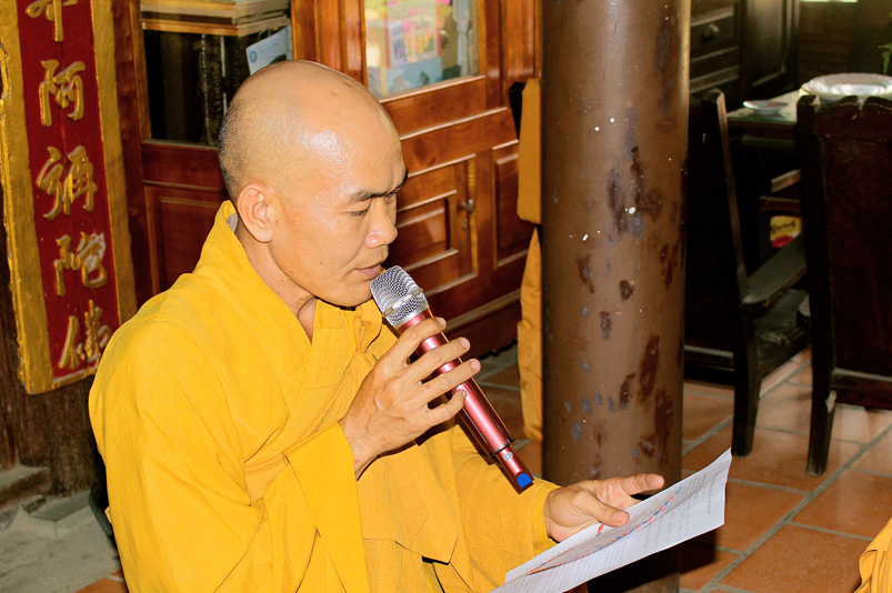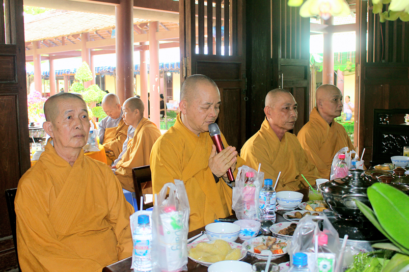 Trong không khí trang nghiêm, hoài niệm nghĩa trọng tình thâm đối với bậc Cổ đức khai sơn tạo tự, Đại đức Thích Tắc Hòa đãi lao chư Tôn đức Tăng Ni môn phong Thiên Thai Tổ đình Tôn Thạnh kính tuyên tiểu sử Tổ sư Viên Ngộ và dâng lời tác bạch cúng dường.