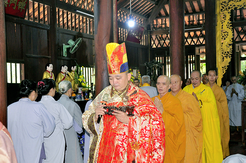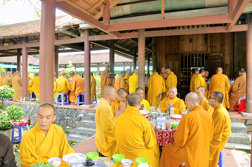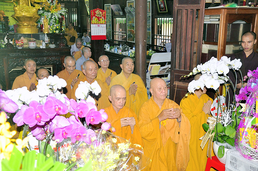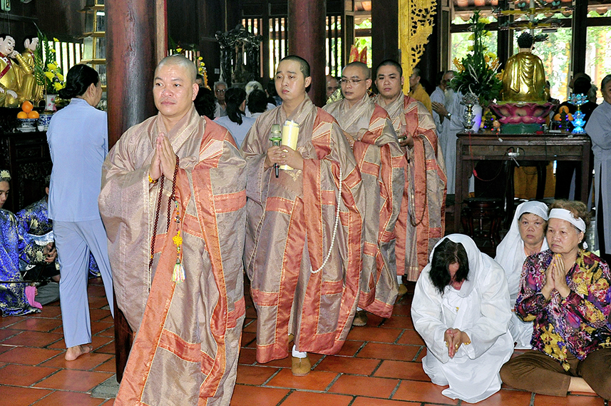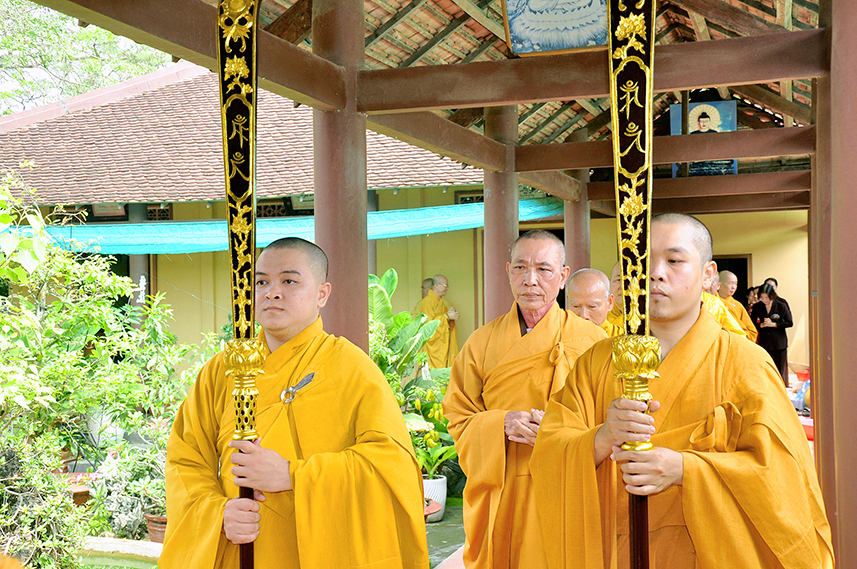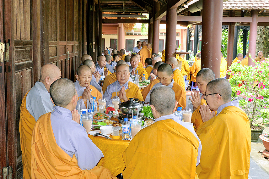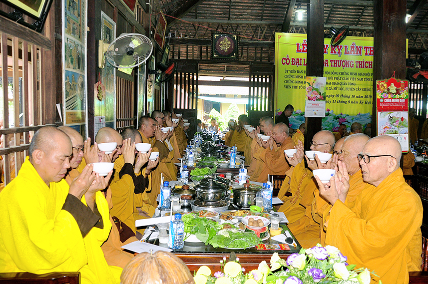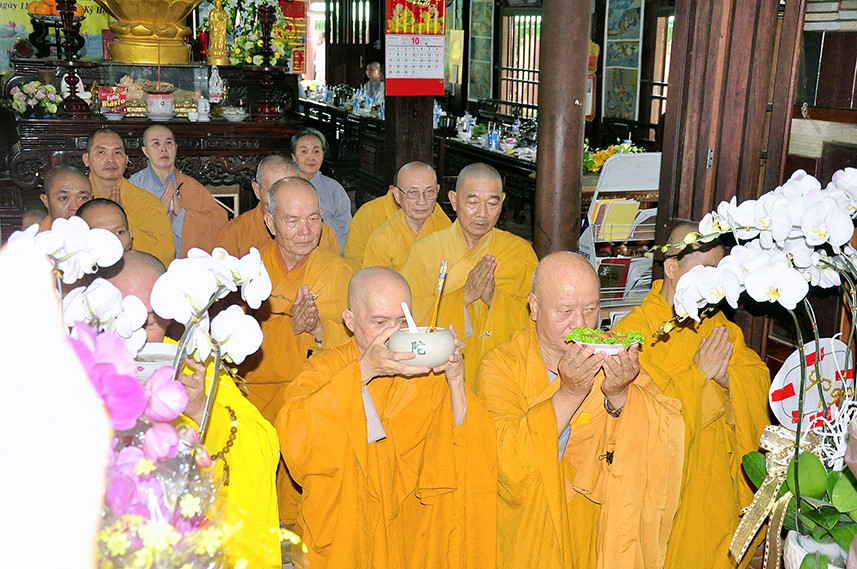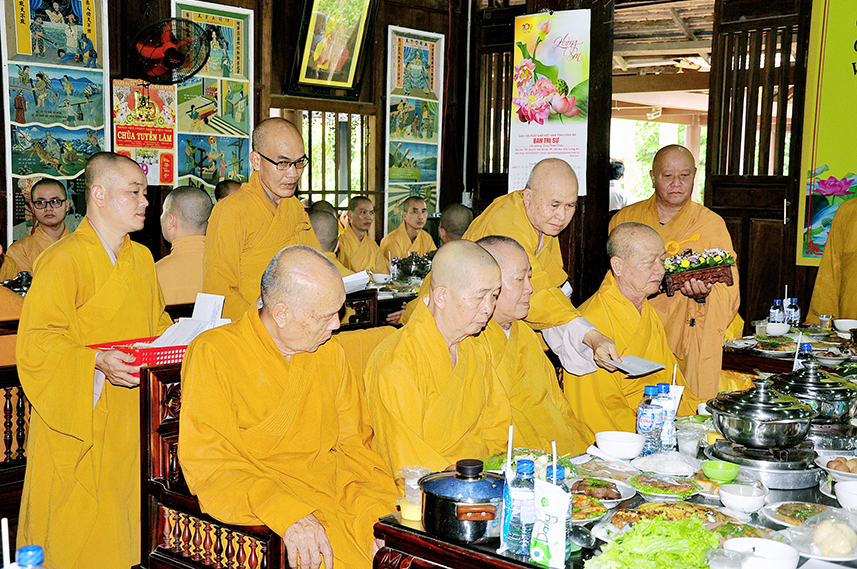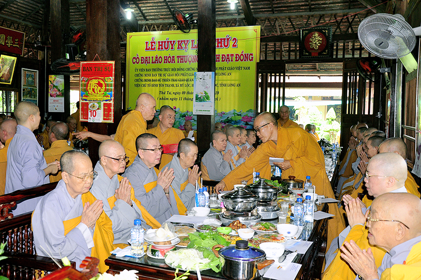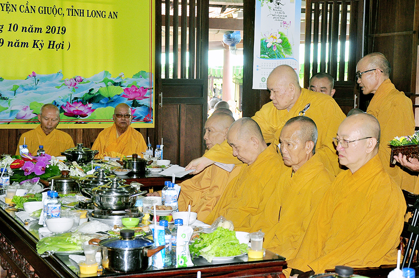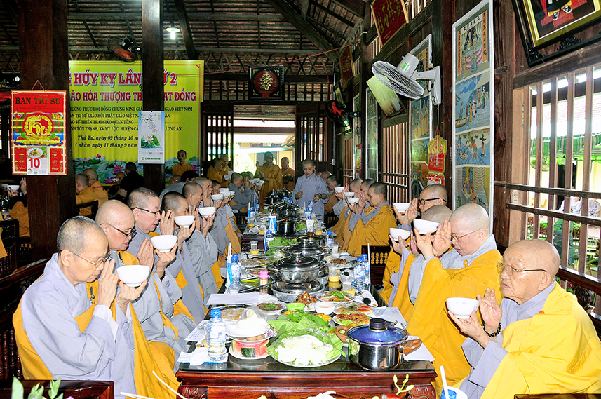 Tiếp theo là nghi thức trai đường, pháp sự chí thành, môn nhân phụng cúng. Đãi lao chư Tôn đức Tăng-già nhị bộ, Hòa thượng Thích Thiện Tài – Phó Ban Trị sự kiêm Trưởng Ban Nghi lễ Phật giáo tỉnh Long An chủ trì pháp lễ, khởi niệm cúng dường.