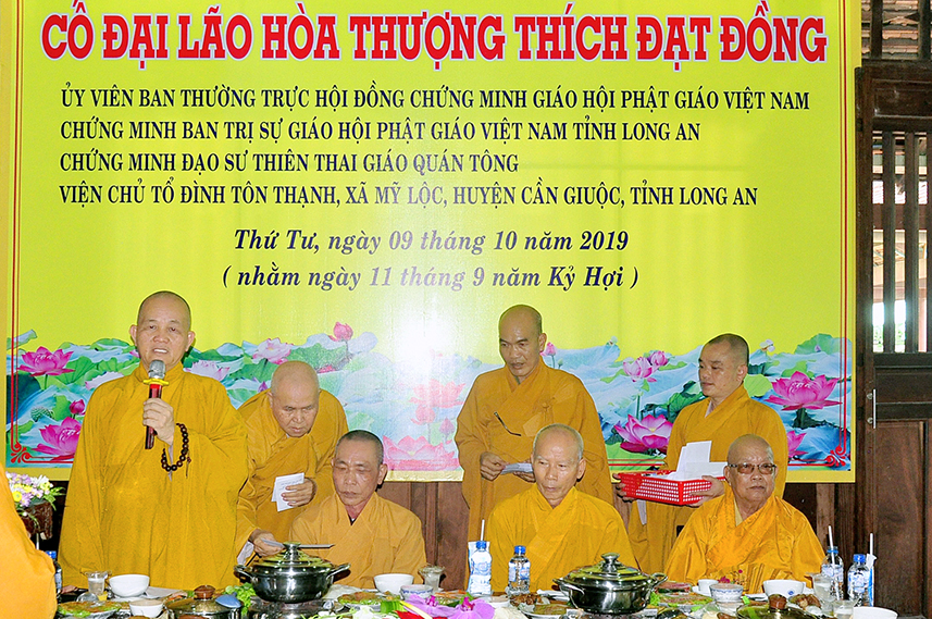 Sáng ngày 9/10/2019 (nhằm ngày 11/9/ năm Kỷ Hợi, môn nhân pháp quyến Thiên Thai thuộc chi Tổ đình Tôn Thạnh long trọng tổ chức Lễ Tưởng niệm Húy nhật lần thứ hai Tôn sư thượng Đạt hạ Đồng, nguyên Ủy viên Hội đồng chứng minh TW Giáo hội Phật giáo Việt Nam, Cố vấn chứng minh Ban Trị sự Phật giáo tỉnh Long An, CM Đạo sư Thiên Thai Giáo Quán Tông, Viện chủ Tổ đình Tôn Thạnh, Tổ đình Kim Cang, chùa Pháp Đàn v.v..