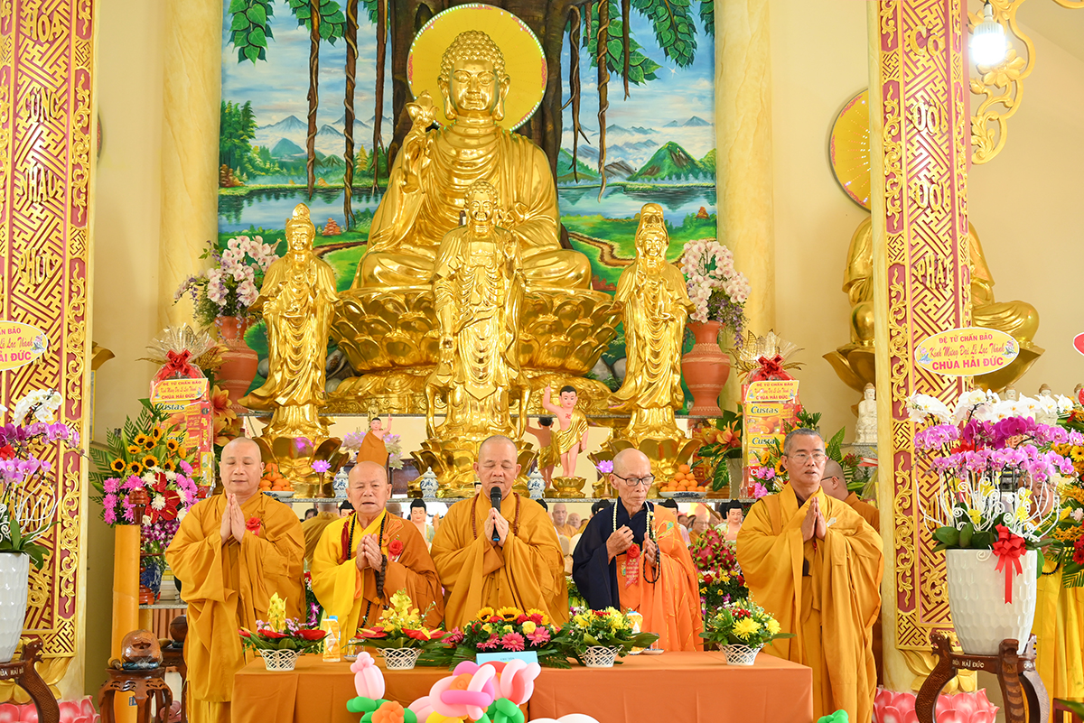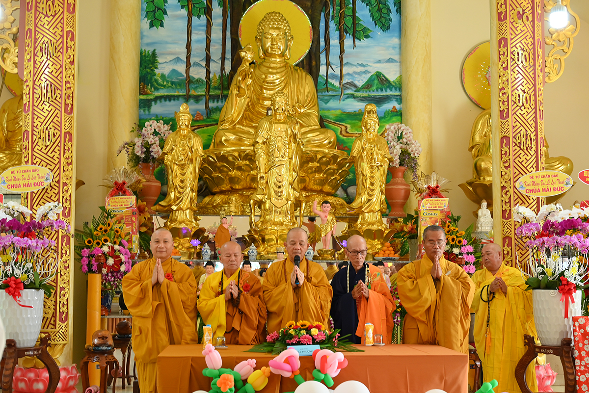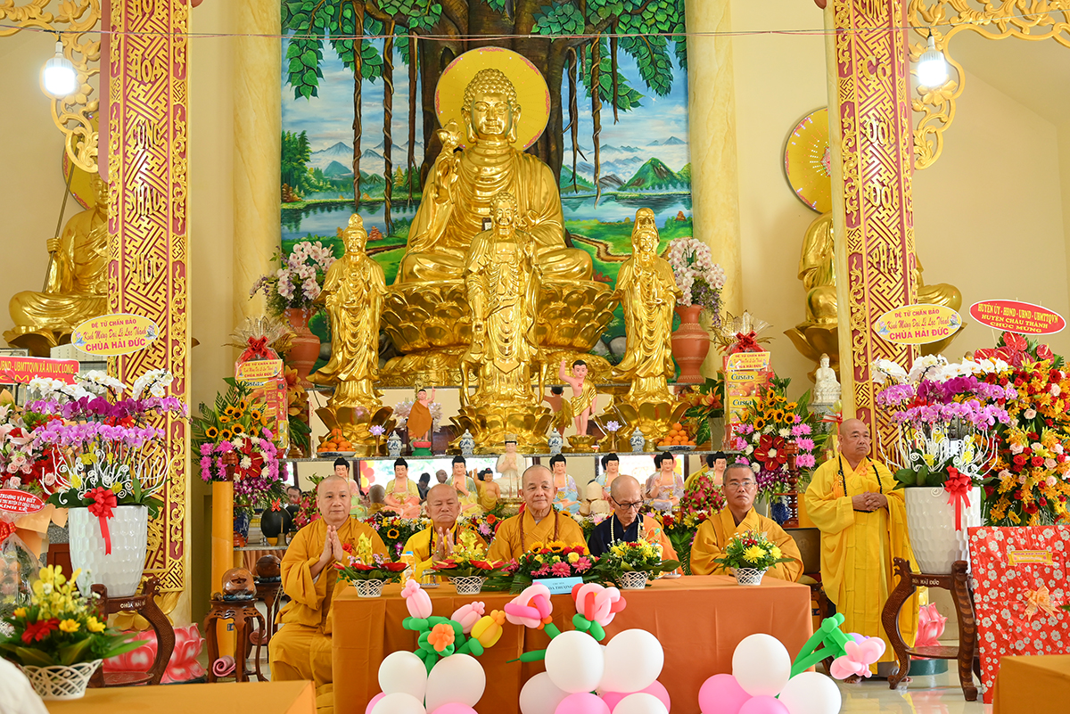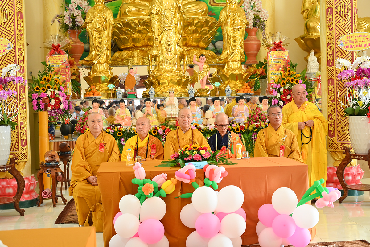 HT. Thích Minh Thiện- Uỷ viên HĐTSTW, Phó Ban Hoằng pháp trung ương, Trưởng Ban Trị sự GHPGVN tỉnh Long An ban lời đạo từ. Hoà thượng tán thán công đức Thượng Toạ trụ trì và quý Phật tử Chùa đã vượt qua những khó khăn trong quá trình xây dựng để cho Chùa Hải Đức được trang nghiêm. Đức Hoà thượng cũng nhắc lại 3 yếu tố quan trọng của một ngôi chùa với tinh thần Hộ quốc An dân. Thứ nhất ngôi chùa là nơi tôn thờ Tam Bảo, để tín đồ cung kính và học theo những lời dạy của đức Phật, cũng là nơi cho Tăng, Ni an tâm tu học nghiên tầm giáo lý của đức Phật để phát triển đạo lực và hướng dẫn tín đồ tu tập đúng chánh pháp. Thứ hai, ngôi chùa là nơi Tăng Ni đem tinh thần Phật học để hoằng truyền Chánh Pháp. Thứ ba, ngôi chùa là nơi mọi người tham quan, ngoạn cảnh, để thập phương bá tánh trở về gửi gắm niềm tin Tôn giáo đem lại lợi ích cho bản thân.