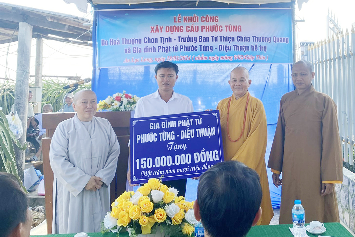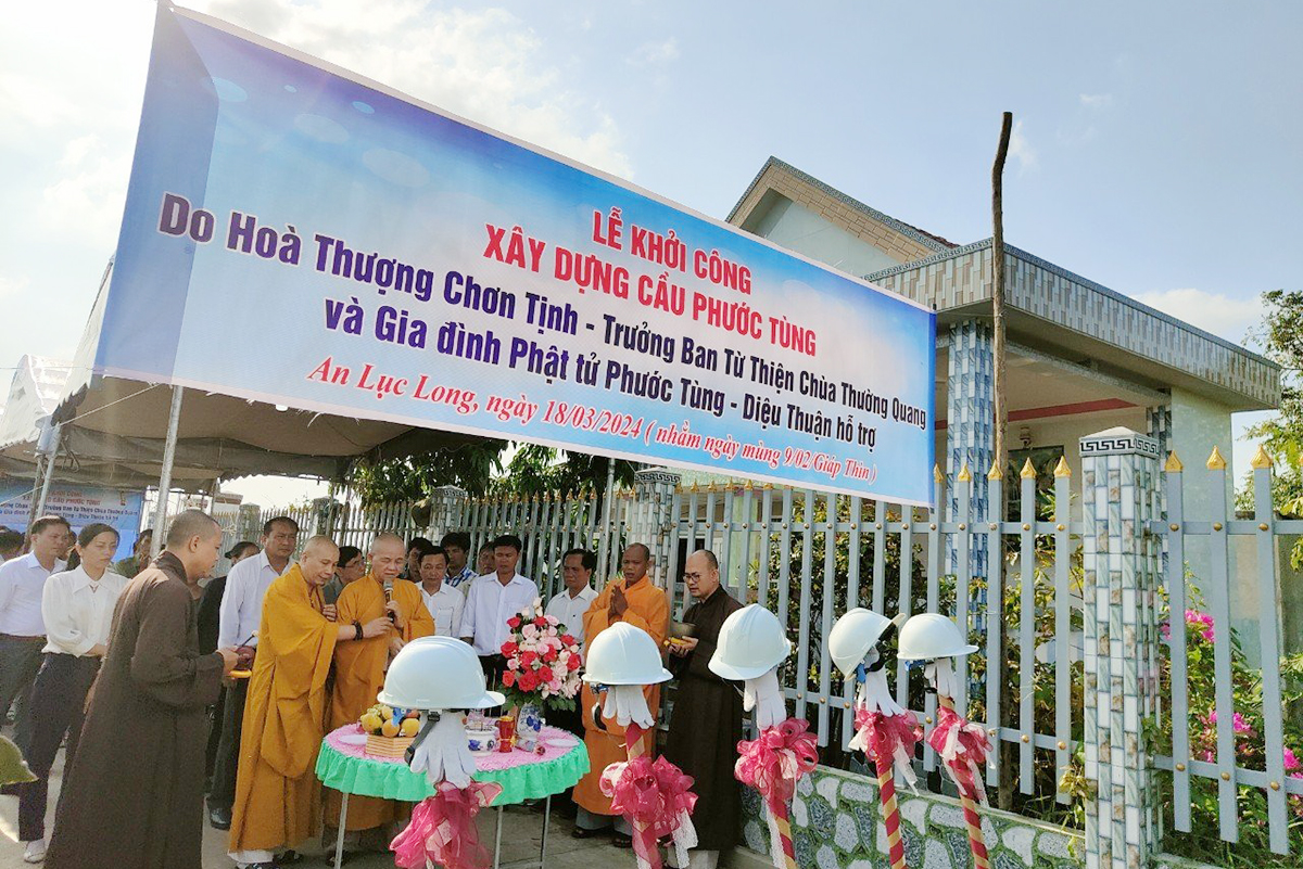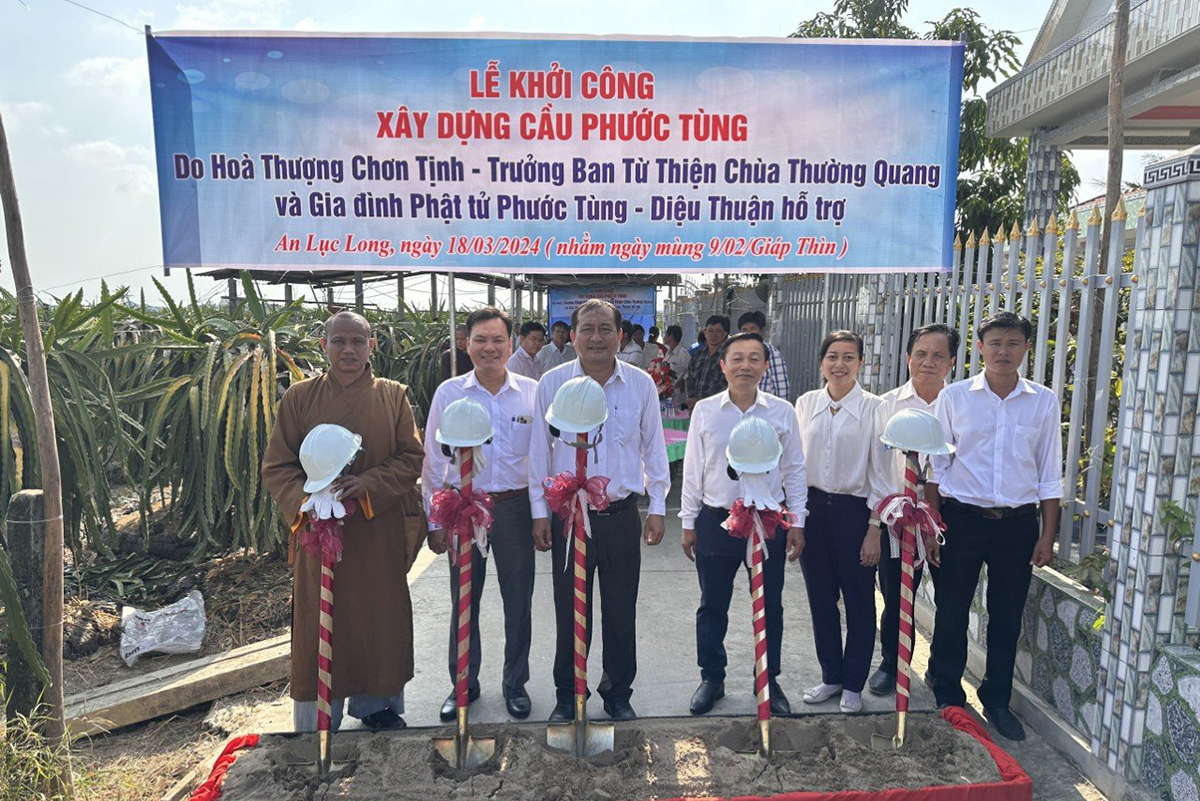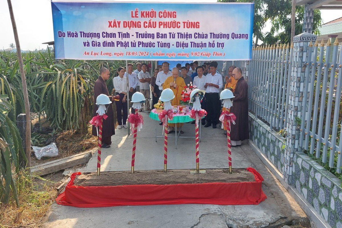 Ngày 18/3/2024 (nhằm mùng 9/2 Giáp Thìn) theo lời kêu gọi của Hòa thượng Thích Minh Thiện, trưởng ban Ban trị sự GHPGVN tỉnh Long An, Hòa thượng Thích Chơn Tịnh, Phó ban Từ thiện Báo Giác Ngộ, Trưởng Ban Từ thiện Chùa Thường Quang, Q8, TpHCM cùng với gia đình Phật tử Phước Tùng – Diệu Thuận đã phát tâm xây dựng cầu nông thôn nối liền giữa 2 xã An Lục Long và Dương Xuân Hội, thuộc huyện Châu Thành, tỉnh Long An. Giúp người dân thông thương và đi lại an toàn.