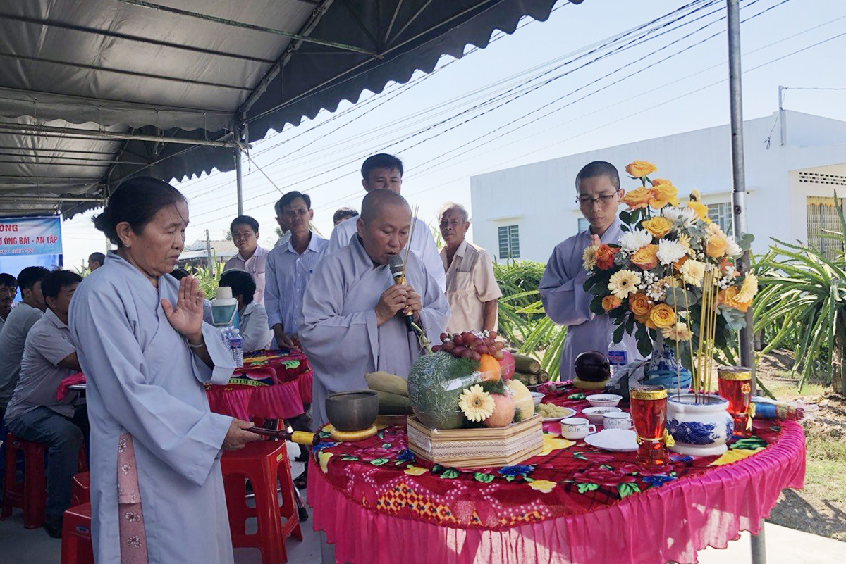 Trước buổi lễ là Nghi thức sái tịnh tụng Kinh của Tăng Ni do Hòa thượng Thích Minh Thiện chủ lễ và tất cả đại biểu khách quý đều trang nghiêm lắng lòng cầu nguyện cho việc xây dựng sớm hoàn tất tốt đẹp, phục vụ cho đại đa số đồng bào qua lại trên tuyến đường huyết mạch của nông thôn.
