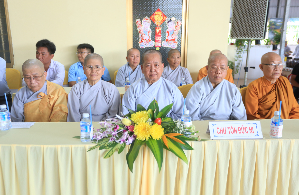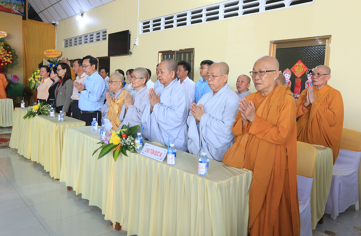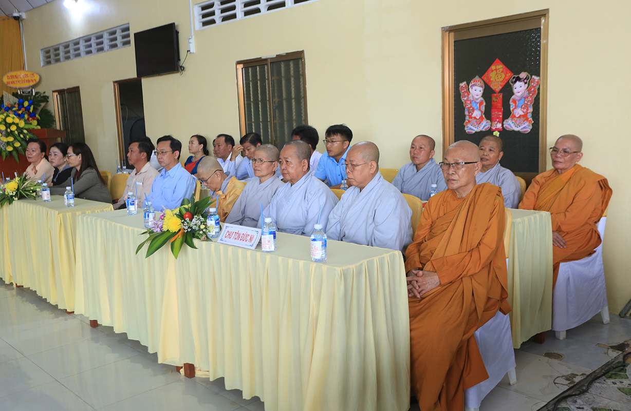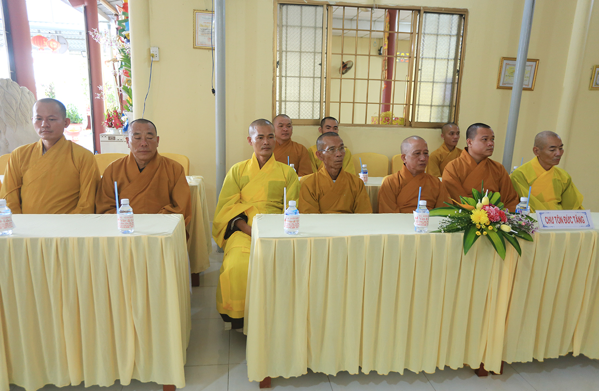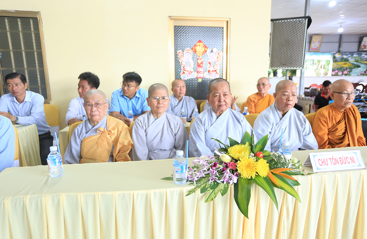 Quang lâm chứng minh buổi lễ có sự hiện diện của: TLHT. Thích Thiện Huệ – Thành viên Hội đồng Chứng minh TƯ, Chứng minh BTS GHPGVN tỉnh Long An; HT. Thích Minh Thiện – UV HĐTS, Phó Trưởng Ban Hoằng pháp TƯ, Trưởng BTS GHPGVN tỉnh Long An; HT. Thích Tắc Phi – Phó Trưởng BTS GHPGVN tỉnh; TT. Thích Quảng Tâm – UV HĐTS, Phó Trưởng Ban TTXH TƯ, Phó Trưởng BTS GHPGVN tỉnh; TT. Thích Lệ Trí – UV HĐTS, Phó Trưởng Ban Văn hoá TƯ, Phó Trưởng BTS GHPGVN tỉnh; TT. Thích Đức Hoàng – Phó Trưởng BTS GHPGVN tỉnh; ĐĐ. Thích Lệ Duyên – Phó Trưởng ban kiêm Chánh Thư ký BTS GHPGVN tỉnh, Trưởng BTS GHPGVN huyện Đức Hoà; cùng Chư Tôn đức thường trực BTS Phật giáo tỉnh Long An, các huyện thị thành; Chư Tôn đức Tăng Ni đồng về tham dự.