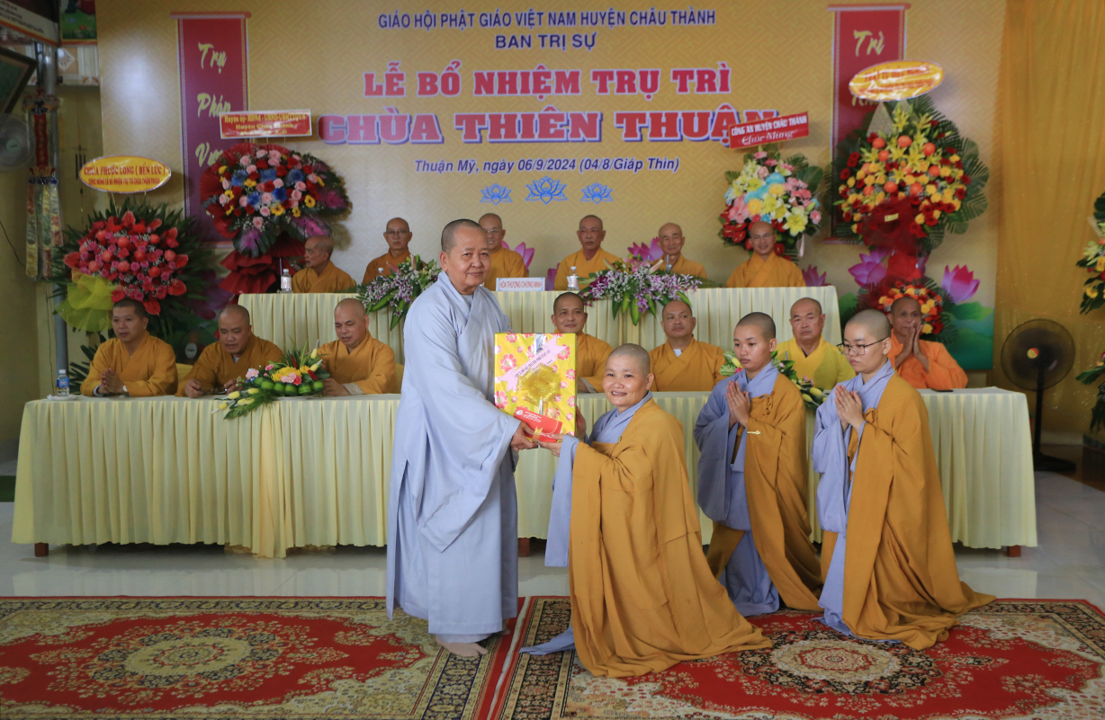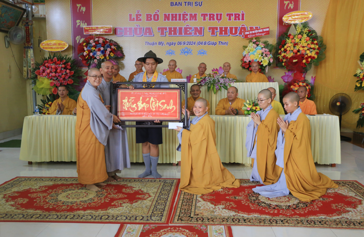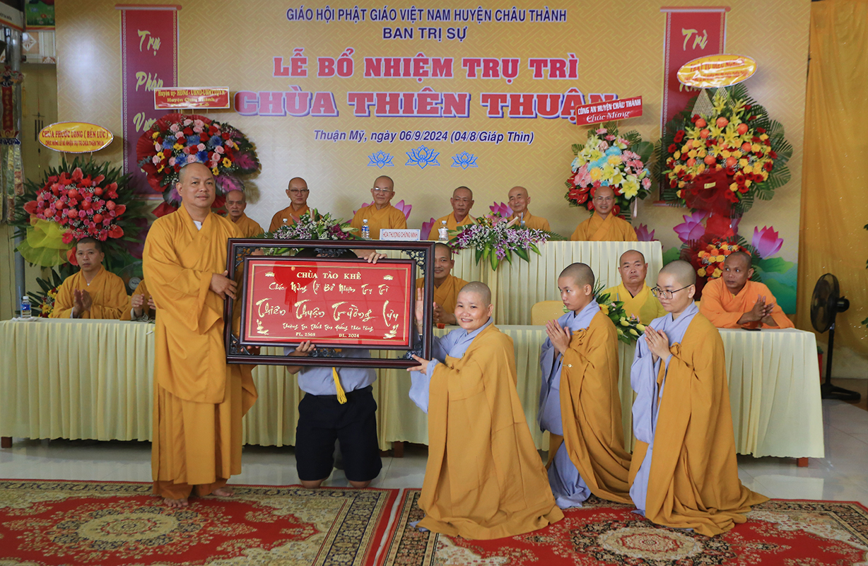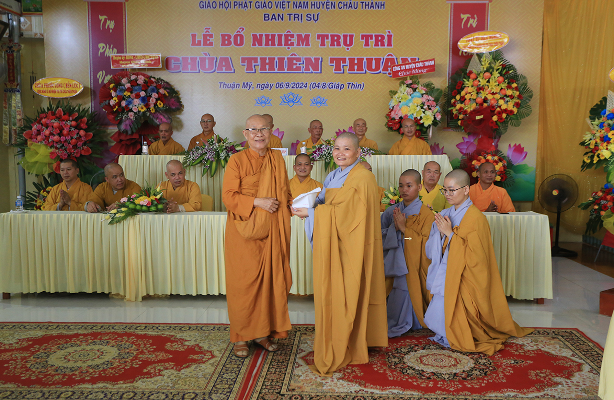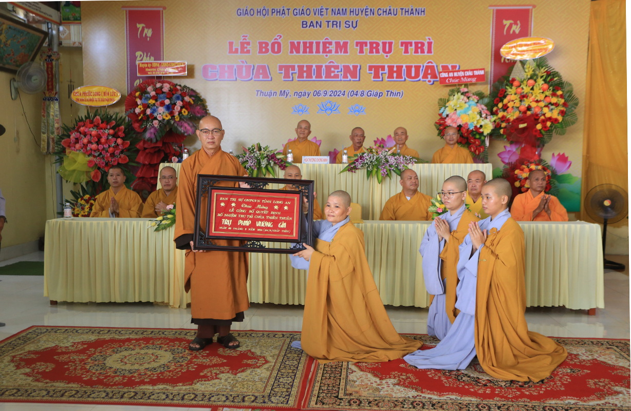 Sáng ngày 06/9/2024 (nhằm ngày 04/8/Giáp Thìn), tại chùa Thiên Thuận, xã Thuận Mỹ, huyện Châu Thành, tỉnh Long An đã trang nghiêm diễn ra Lễ công bố quyết định trụ trì và bổ nhiệm Sư cô Thích nữ An Hà làm trụ trì chùa.