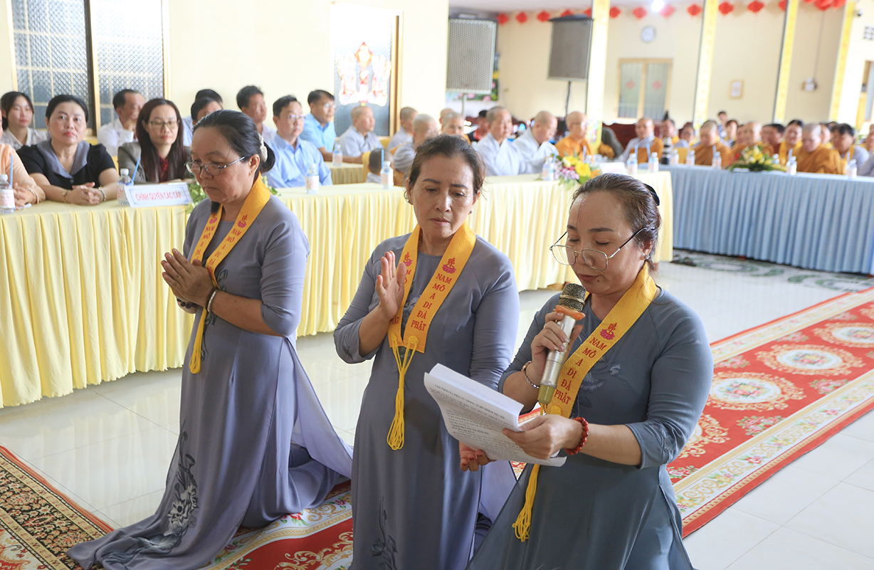 Đại diện Phật tử chùa Thiên Thuận dâng lời phát nguyện hộ trì Tam Bảo. Quý Phật tử đạo tràng đồng phát nguyện tinh tấn tu học, siêng năng hộ trì Tam Bảo, noi gương hạnh bậc Đại Tăng để chung tay góp sức phát triển nơi bổn tự.