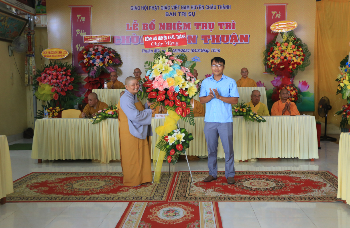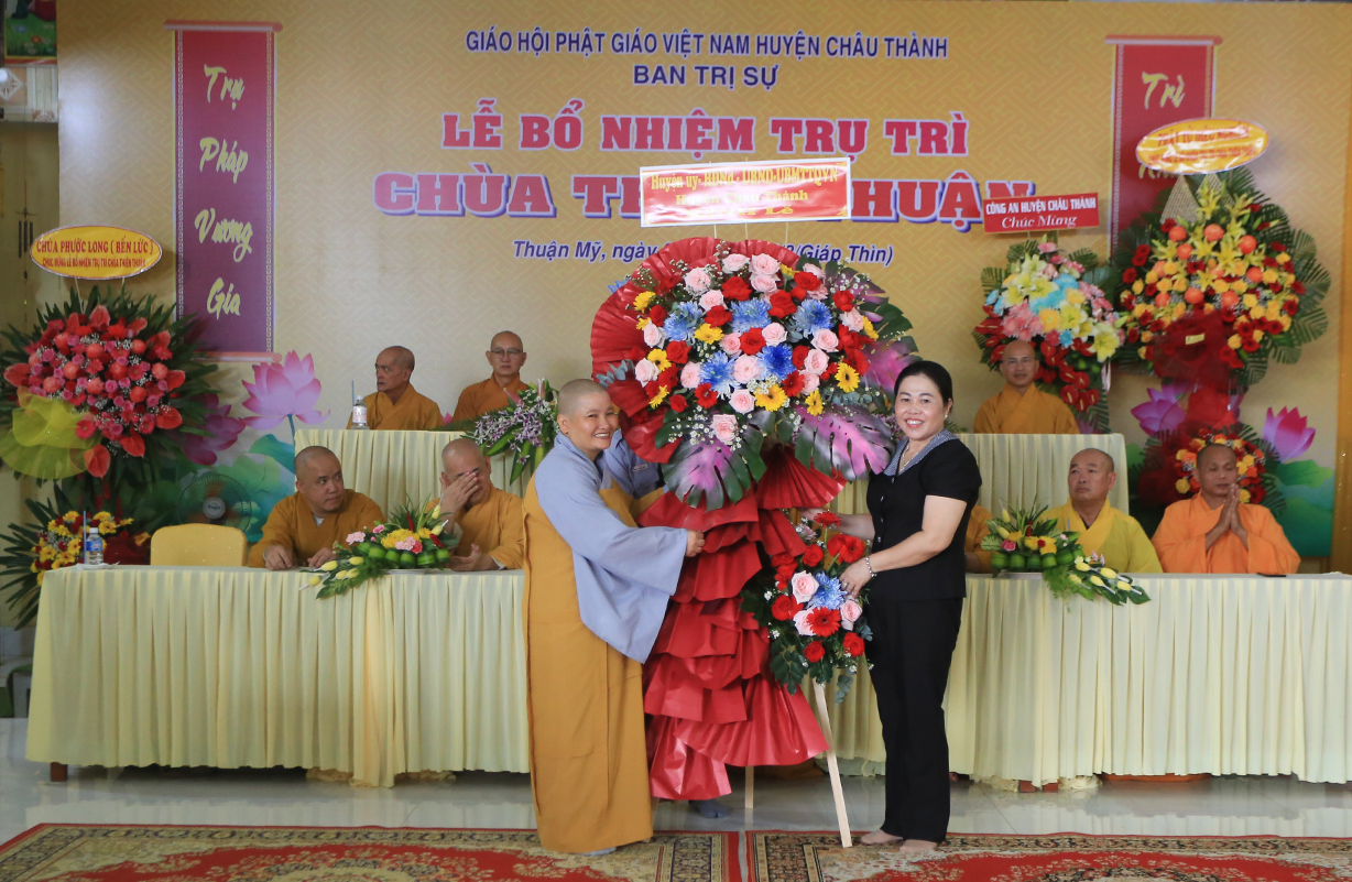 Buổi lễ sư cô tân trụ trì đã đón nhận những lẵng hoa, phần quà cao từ quý Chư tôn đức Tăng Ni lãnh đạo Phật giáo tỉnh Long An, Phật giáo huyện Châu Thành, Chính quyền các cấp và quý Phật tử.