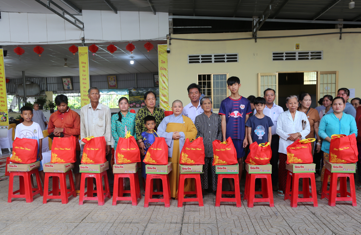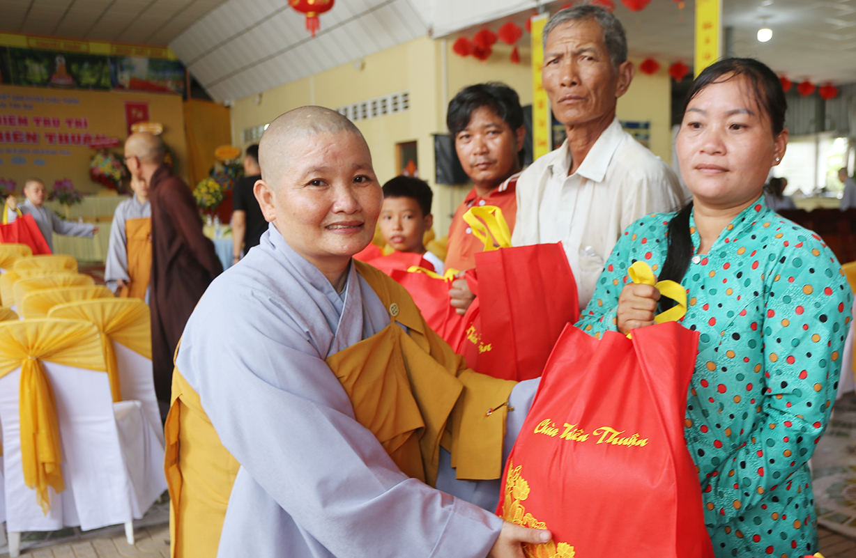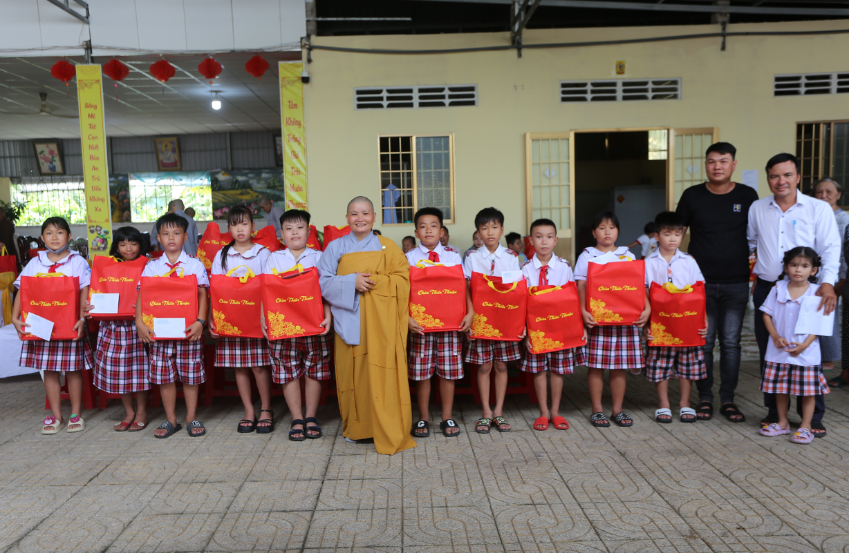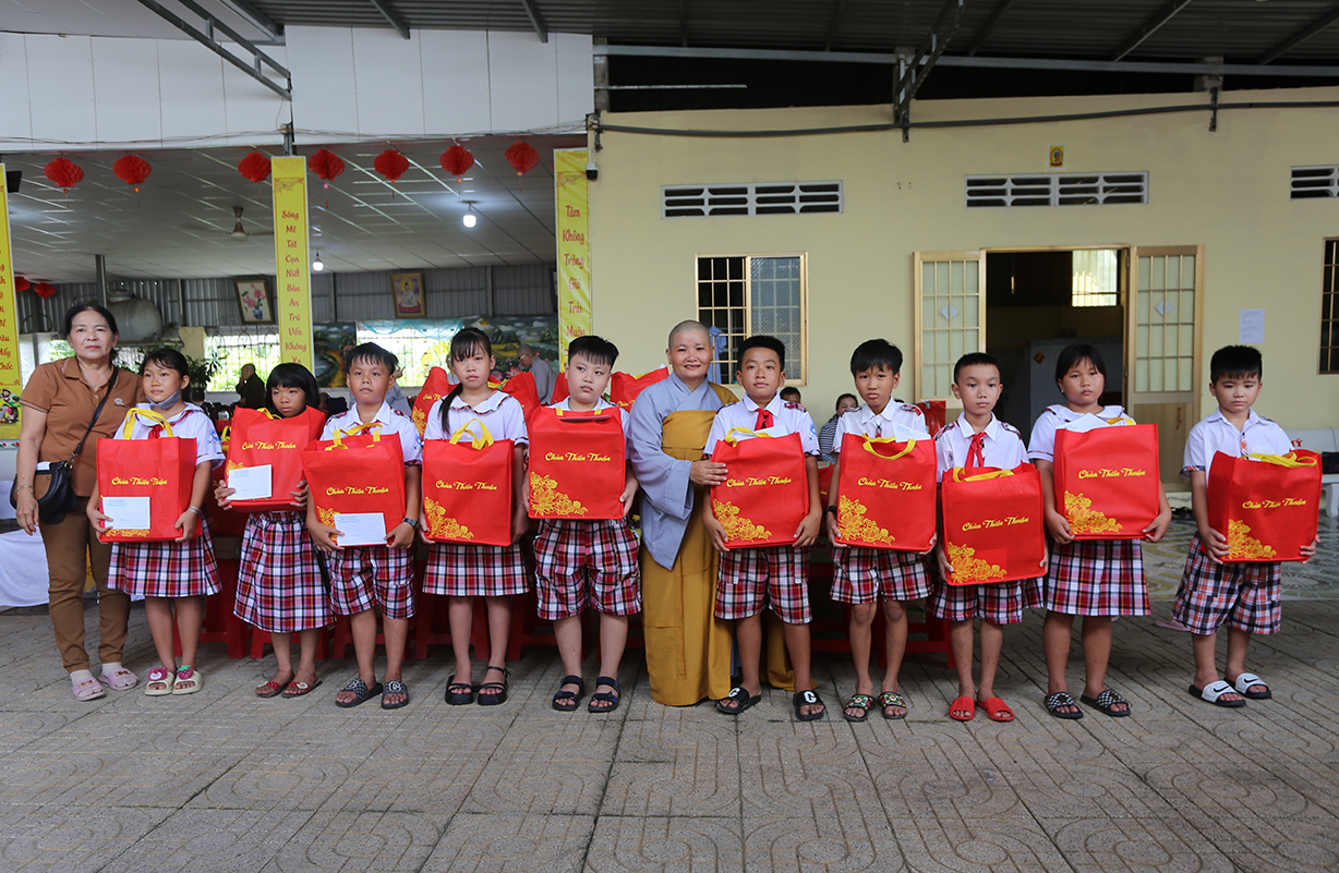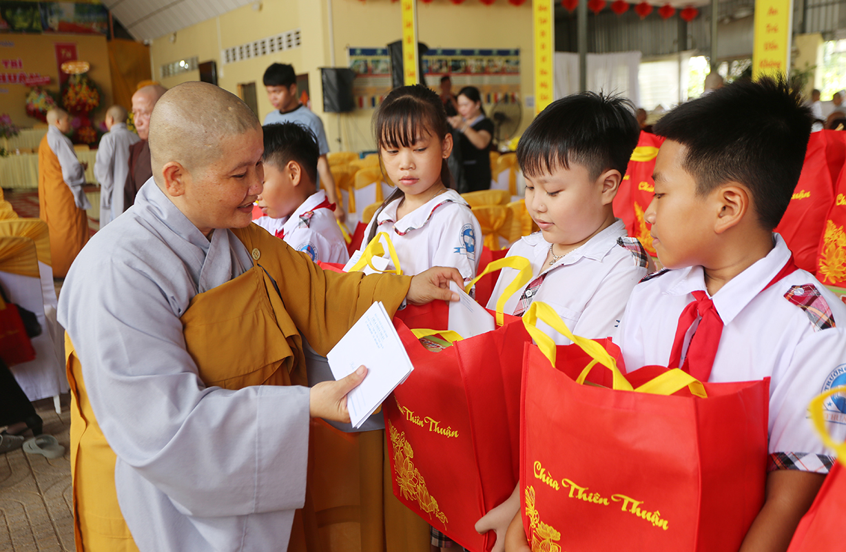 Dịp này, Sư cô Thích nữ An Hà- Trụ trì chùa phát 10 phần học bổng cho các em học sinh nghèo hiếu học và 100 phần quà cho bà con có hoàn cảnh khó khăn, mỗi phần quà trị giá 500 ngàn đồng.