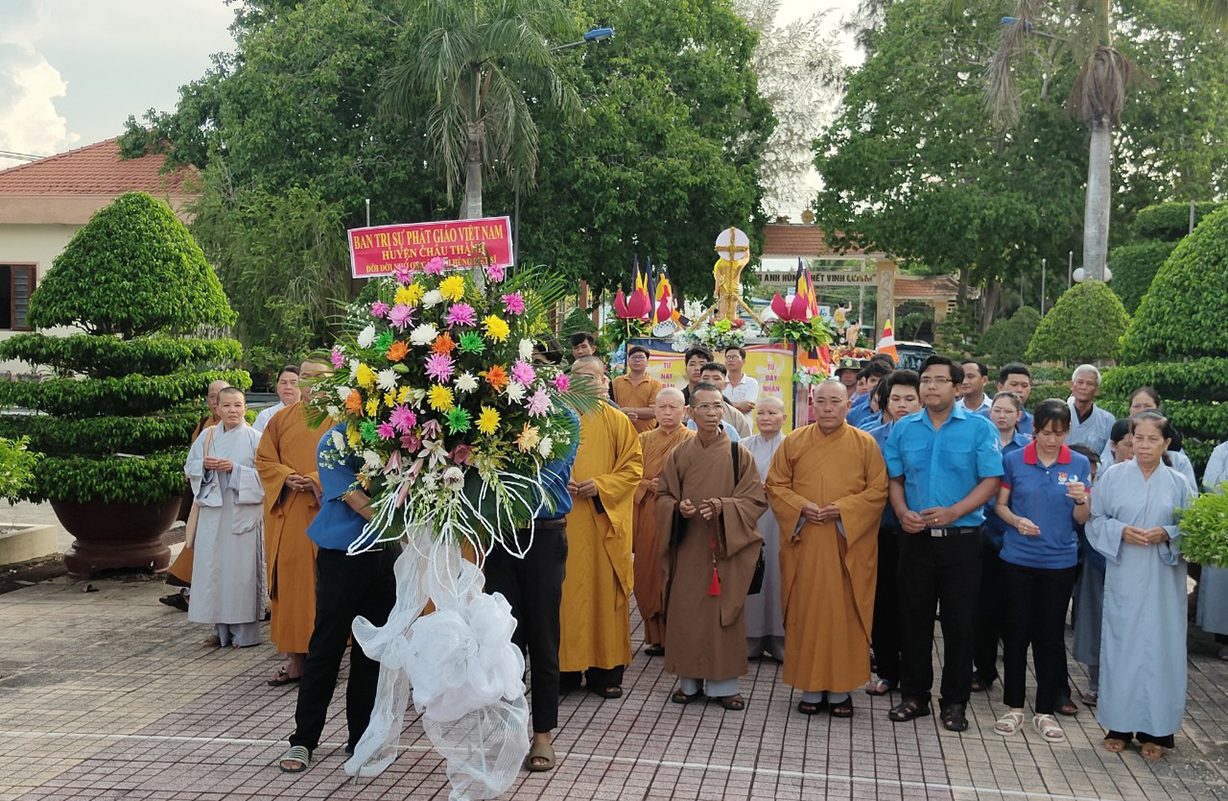 Từ sáng đã thấy hình bóng hàng Tu sĩ Phật giáo đến tại nghĩa trang để cắm hoa và bài trí cúng kính tại Đền thờ và ngay Đài Tổ Quốc Ghi Công. Đại đức Phó thường trực Thích Thiện Danh đại lao cho Đại đức Trưởng Ban Thích Huệ Quang sau khi kiểm tra công tác chuẩn bị Đại Lễ Phật Đản diễn ra vào ngày 13/4 âm lịch tại Lễ Đài chính của Phật giáo huyện đặt tại Chùa Thiên Long, đoàn xe Hoa Phật Đản cùng Tăng Ni Phật giáo huyện Châu Thành tiến về Nghĩa trang để Tăng Ni kịp thời thắp hương tưởng niệm đến các Anh Linh Liệt Sĩ đã ngã xuống cho đất nước nỡ hoa Độc Lập, kết quả Tự Do .