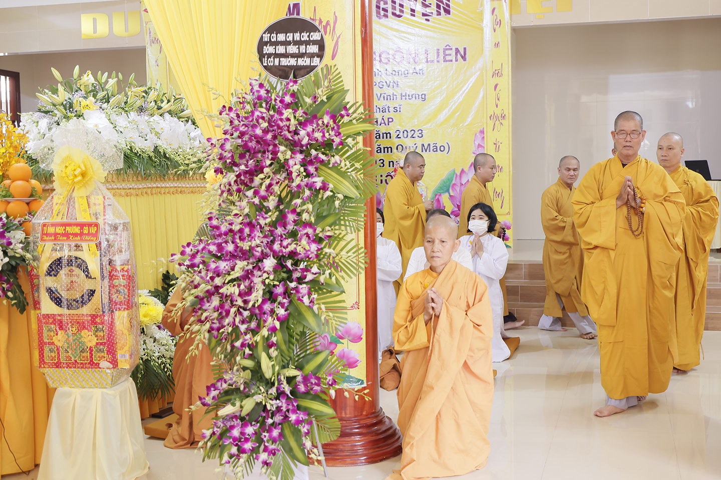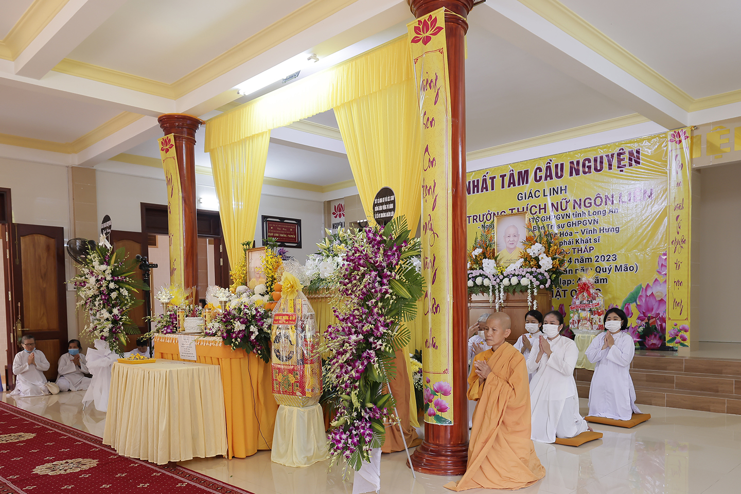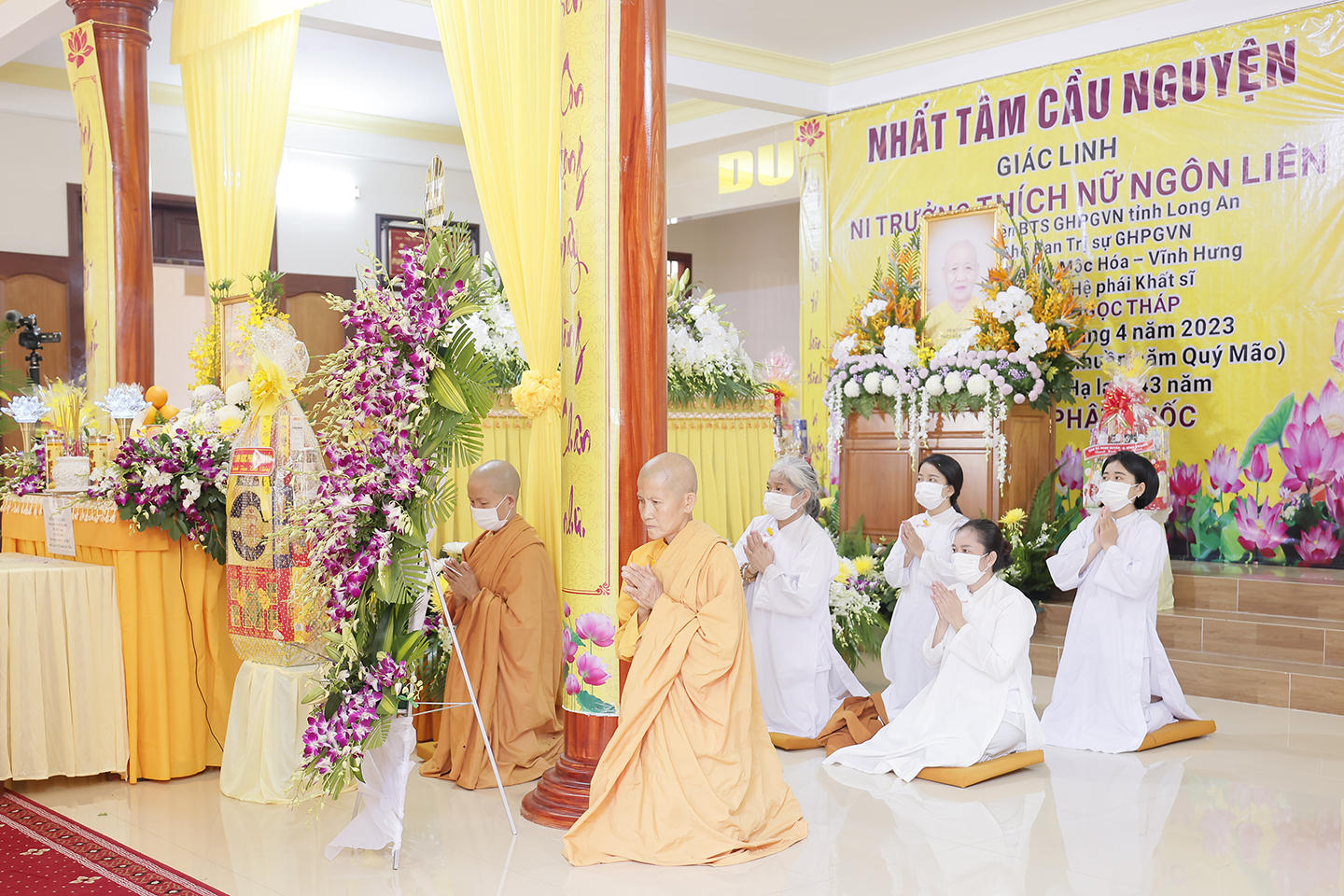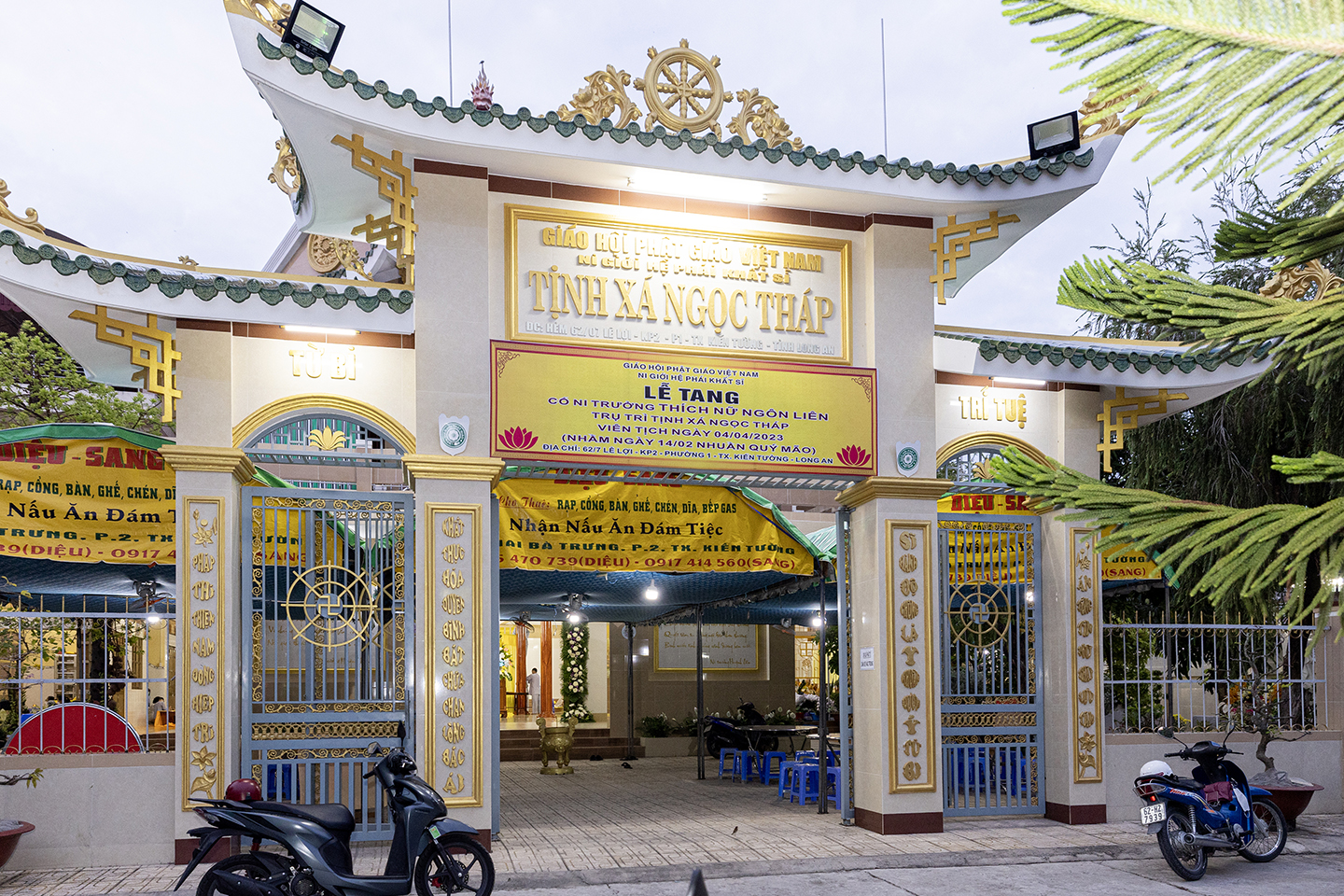 Ngày 5/4/2023 (15/02 Nhuần năm Quý Mão), chư Tôn đức Tăng Ni thường trực Ban Trị sự GHPGVN tỉnh Long An và các huyện thị: thị xã Kiến Tường, Tân Thạnh, Thạnh Hóa,…trở về Tịnh xá Ngọc Tháp viếng tang lễ cố Ni trưởng Ngôn Liên – Giáo phẩm NGHPKS, trụ trì Tịnh xá Ngọc Tháp.