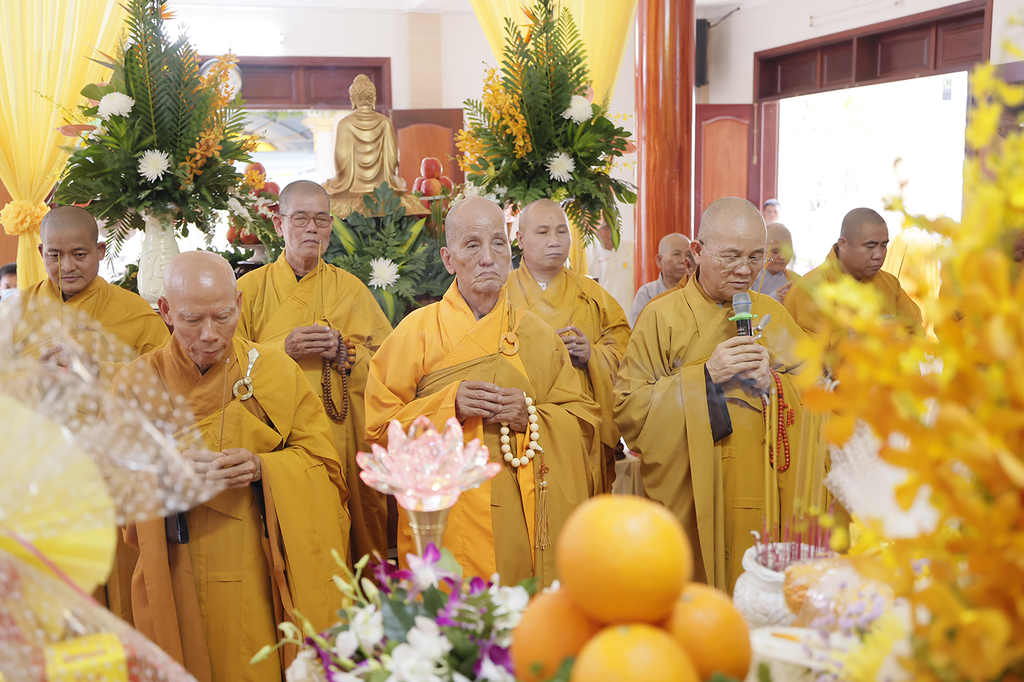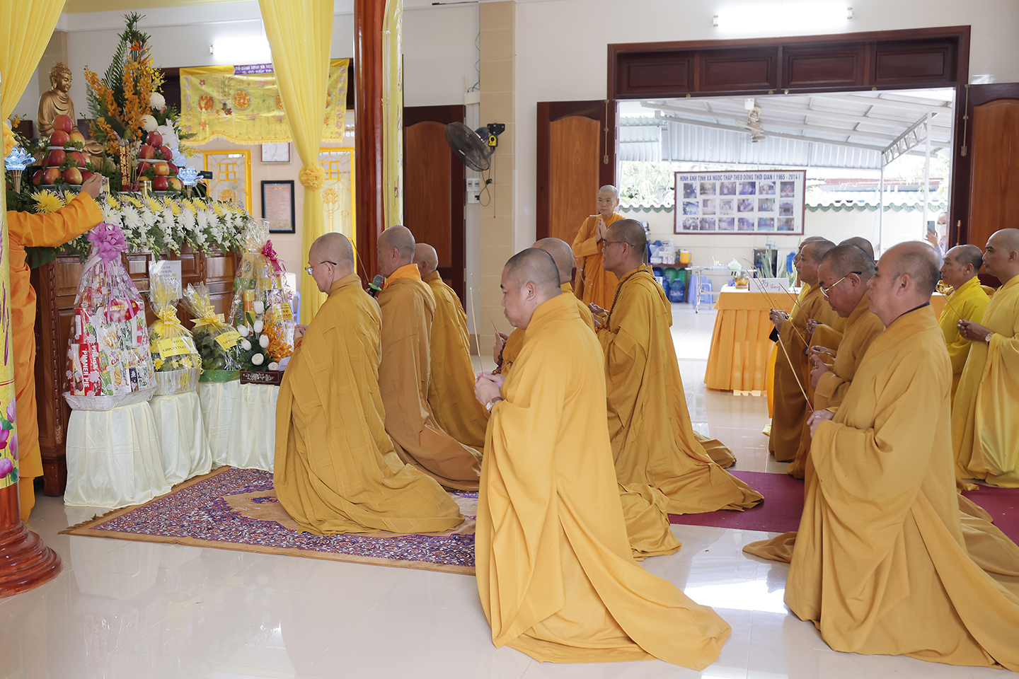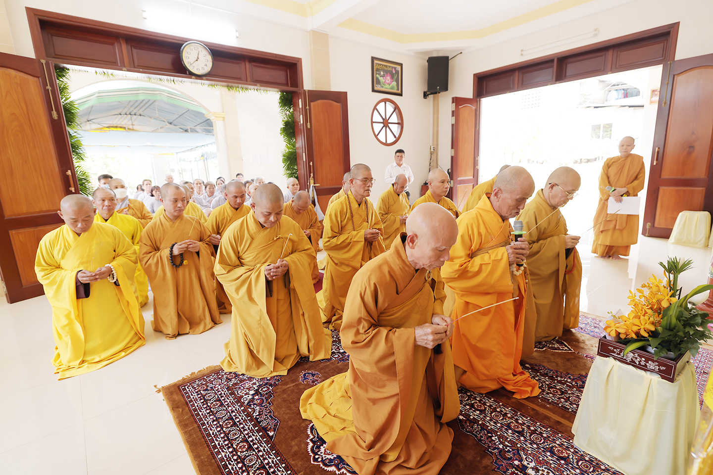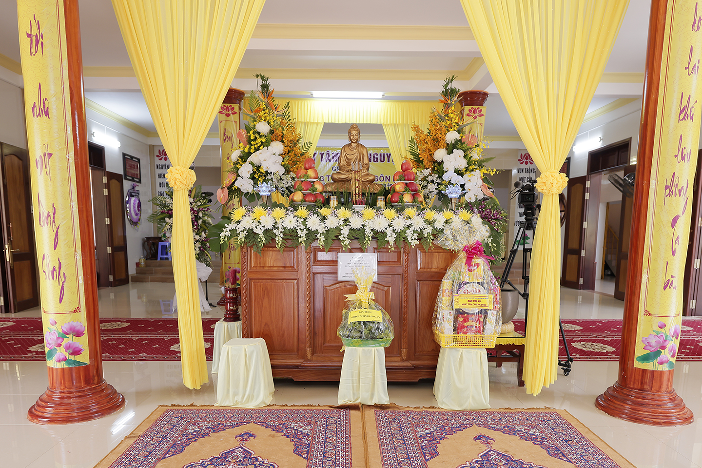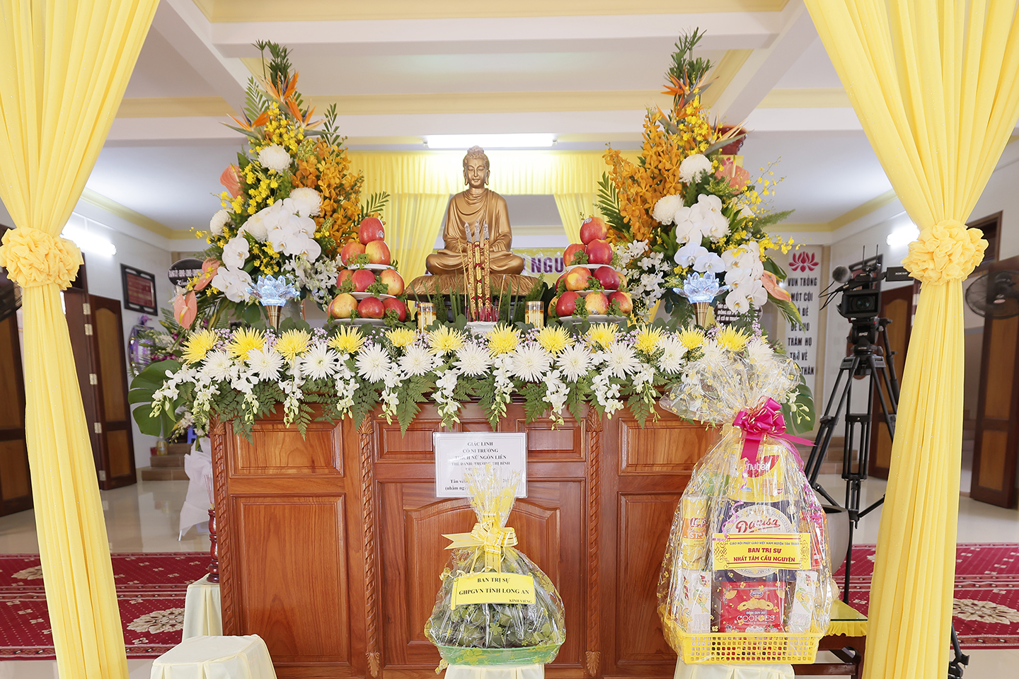 Tại Lễ đường, HT. Thích Huệ Hồng, HT. Thích Quảng Ý – Đồng Chứng minh BTS GHPGVN tỉnh, niêm hương bạch Phật, phúng tụng thời kinh, nhất tâm cầu nguyện giác linh cố Ni trưởng Cao đăng Phật quốc, sớm hội nhập ta bà, để tiếp tục hoằng pháp lợi sanh.