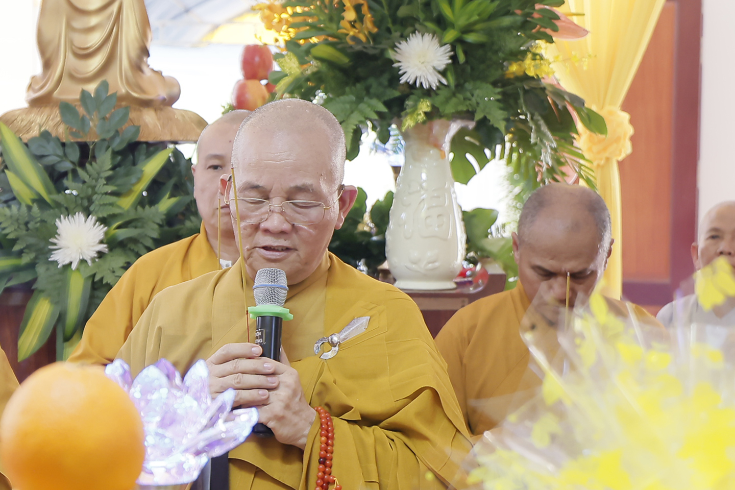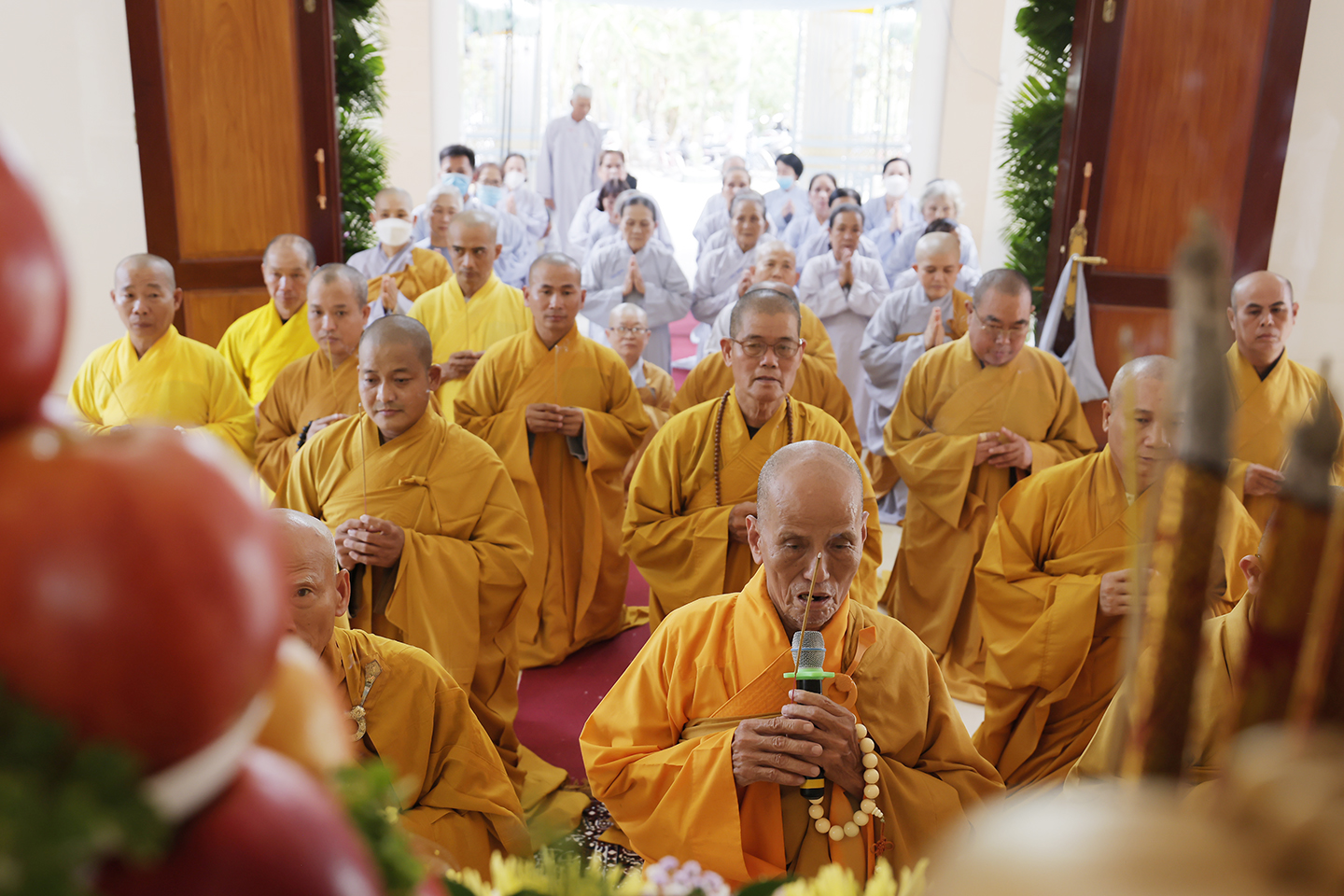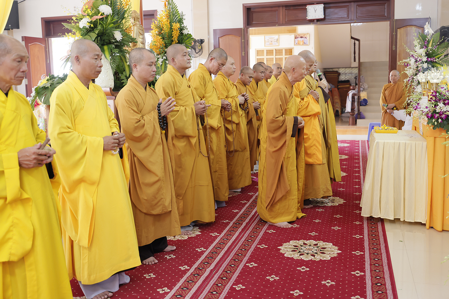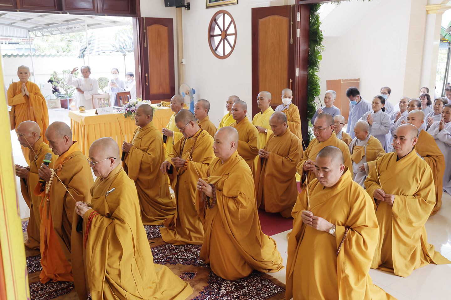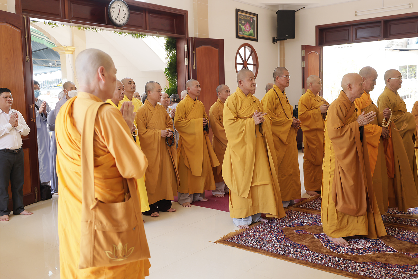 Tại Lễ đường, HT. Thích Huệ Hồng, HT. Thích Quảng Ý – Đồng Chứng minh BTS GHPGVN tỉnh, niêm hương bạch Phật, phúng tụng thời kinh, nhất tâm cầu nguyện giác linh cố Ni trưởng Cao đăng Phật quốc, sớm hội nhập ta bà, để tiếp tục hoằng pháp lợi sanh.