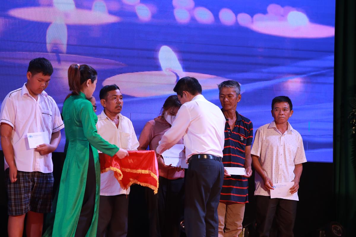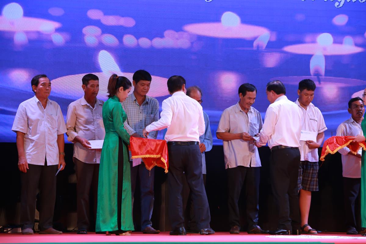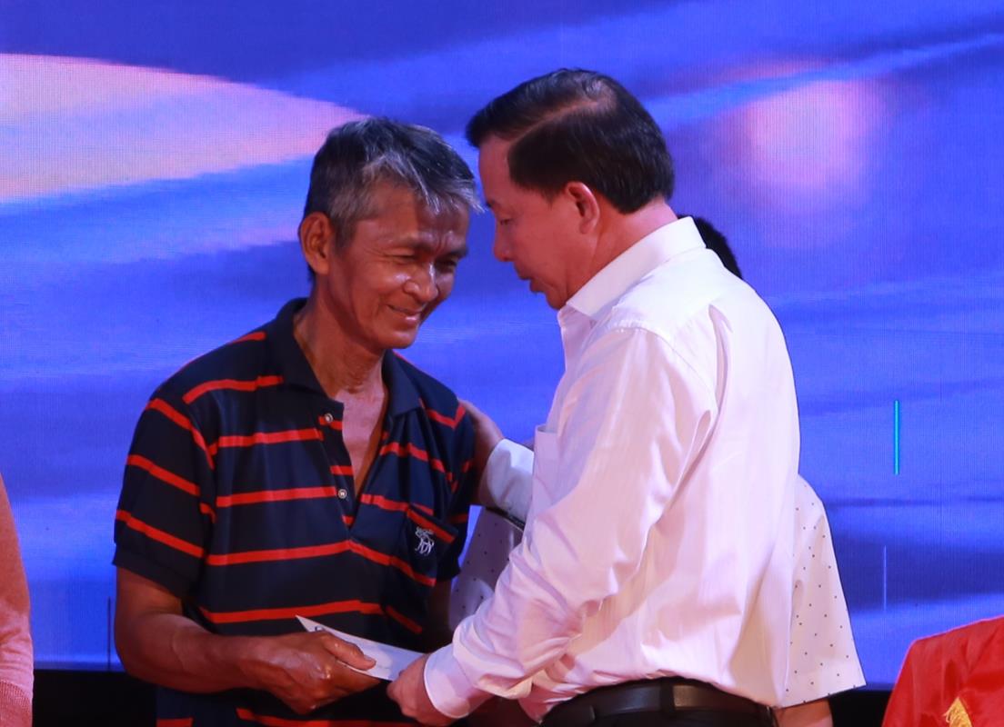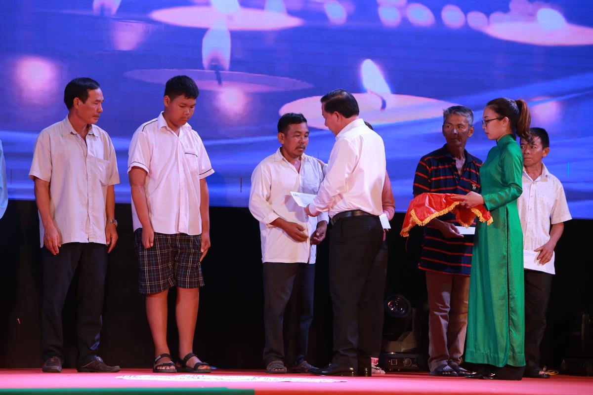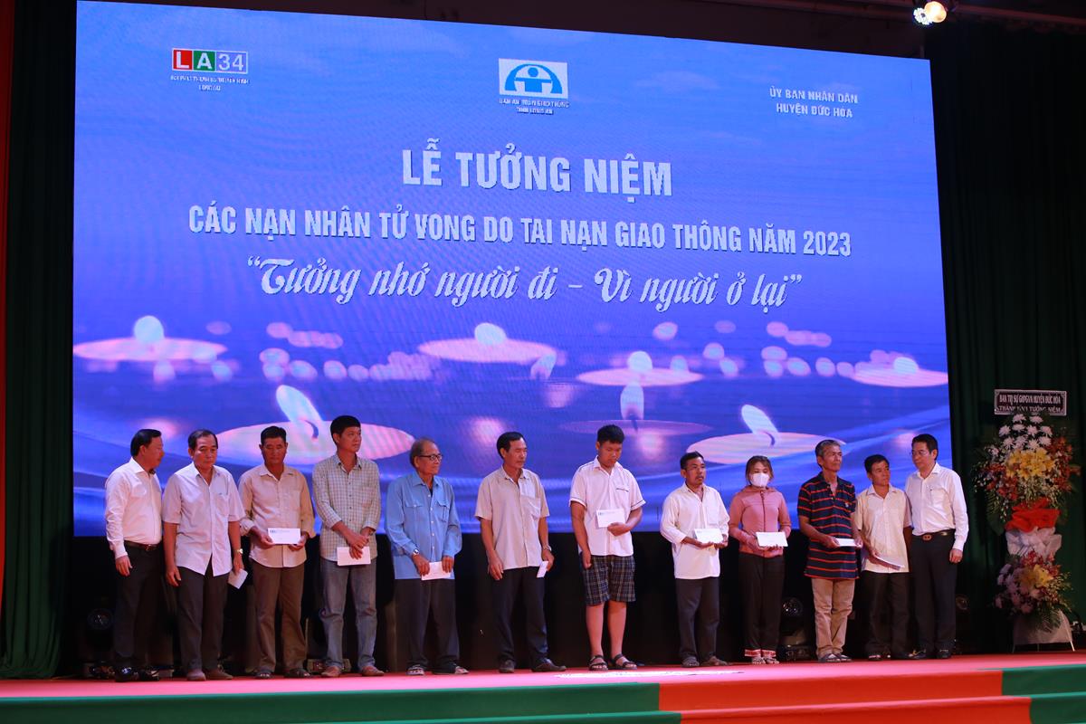 Chủ tịch UBND tỉnh, Trưởng ban An toàn giao thông tỉnh – Nguyễn Văn Út và Quyền Chủ tịch UBND huyện Đức Hòa – Lê Thành Phong trao quà cho các nạn nhân, gia đình nạn nhân tai nạn giao thông
