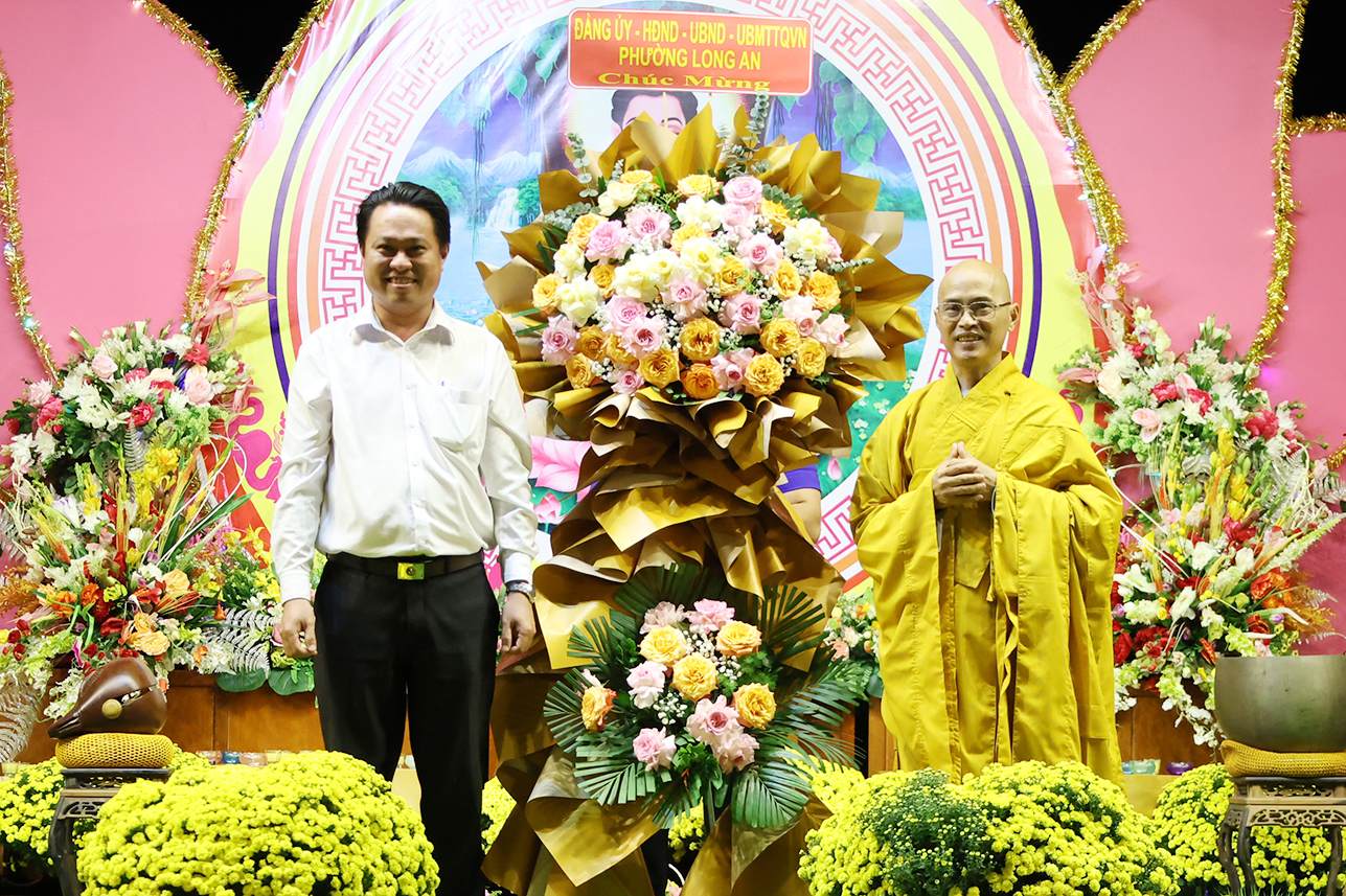 Buổi lễ đã đón nhận nhiều lẵng hoa và phần quà chúc mừng từ Ban Trị sự GHPGVN tỉnh Tây Ninh; Ban Hoằng pháp GHPGVN tỉnh Tây Ninh; Ban Hướng dẫn Phật tử GHPGVN tỉnh Tây Ninh; Ban Tôn giáo và Dân tộc tỉnh Tây Ninh; Đảng ủy – HĐND – UBND – UBMTTQVN phường Long An; Tập đoàn SunGroup; cùng các đơn vị, cá nhân.