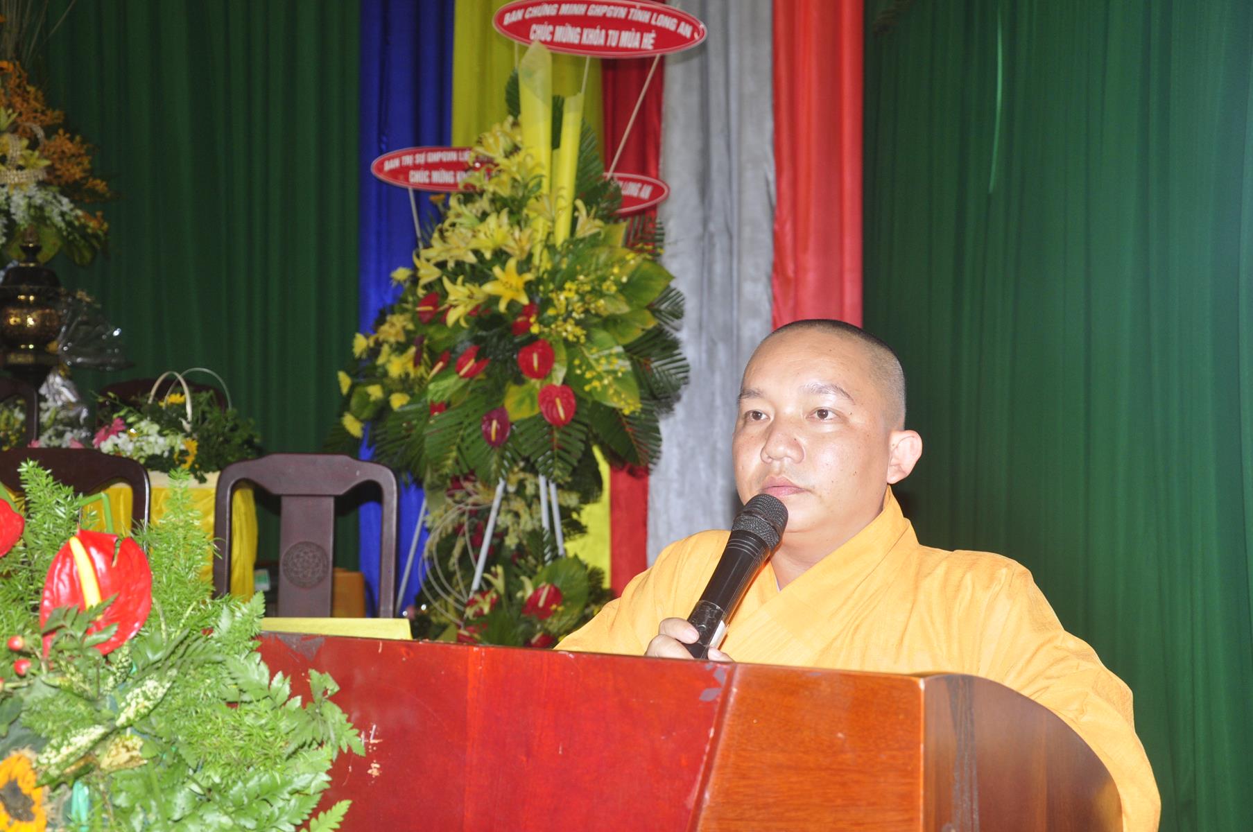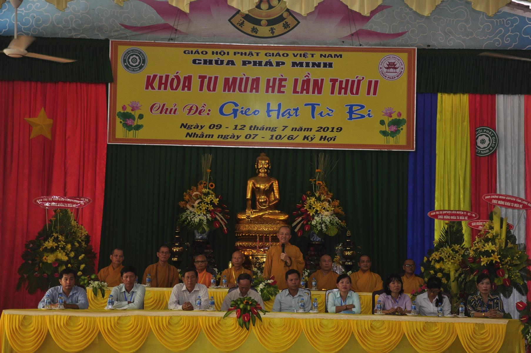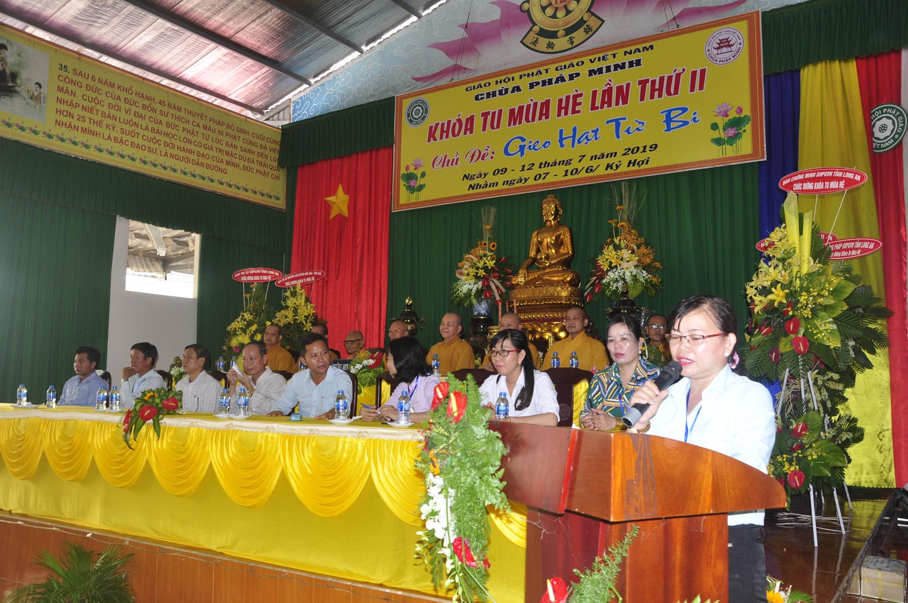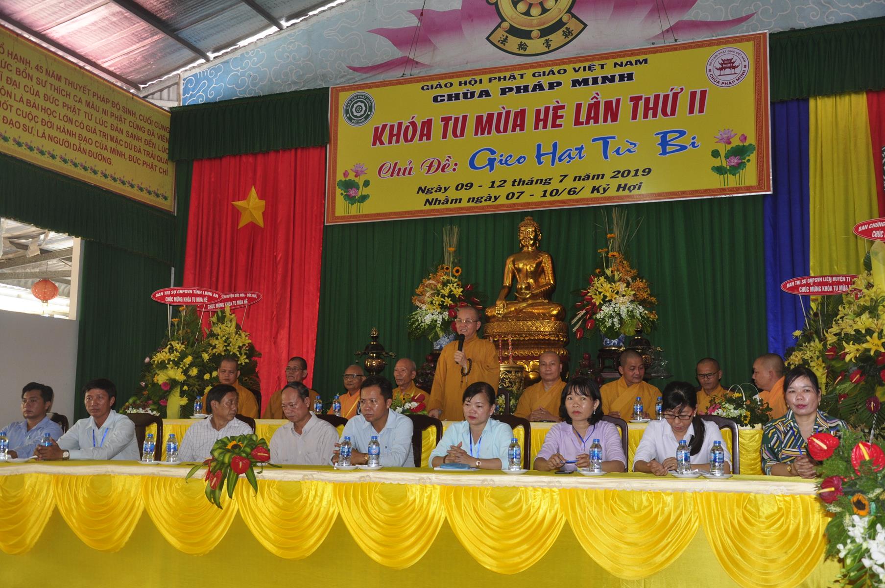 Sau nghi thức niệm Phật cầu gia bị, tuyên bố lý do, giới thiệu thành phần tham dự, Đại đức Thích Trí Huệ: Phó Trưởng ban Tổ chức báo cáo kết quả khóa tu. Đại đức cho biết, khóa tu mùa hè “Gieo hạt Từ Bi” diễn ra trong 4 ngày, từ ngày 9 đến 12 tháng 7 năm 2019 (nhằm ngày 07 đến 12/6/Kỷ Hợi), có gần 400 khóa sinh tham dự. Trong bốn ngày các em khóa sinh được học về lời dạy của Đức Phật, như về cuộc đời Đức Phật, kinh Thương Yêu, Kinh Phước Đức, tọa thiền, tụng kinh, thiền hành… tinh thần phụng sự Tam bảo, yêu quê hương Đất nước, hiếu kính với ông bà cha mẹ, sống tốt đời đẹp đạo mà còn được giáo dục những kỹ năng sống, phòng chống ma túy, các tệ nạn xã hội, kỹ năng thích ứng với xã hội hiện đại; vui chơi, sinh hoạt nhóm, đốt lửa trại, trò chơi lớn, phiên chợ quê hương, thắp nến tri ân công ơn cha mẹ, bếp ăn hiếu thảo, thăm viếng khu di tích căn cứ Giồng Dứa và nhất là các khóa sinh giao lưu với huyện đoàn huyện Đức Hòa.