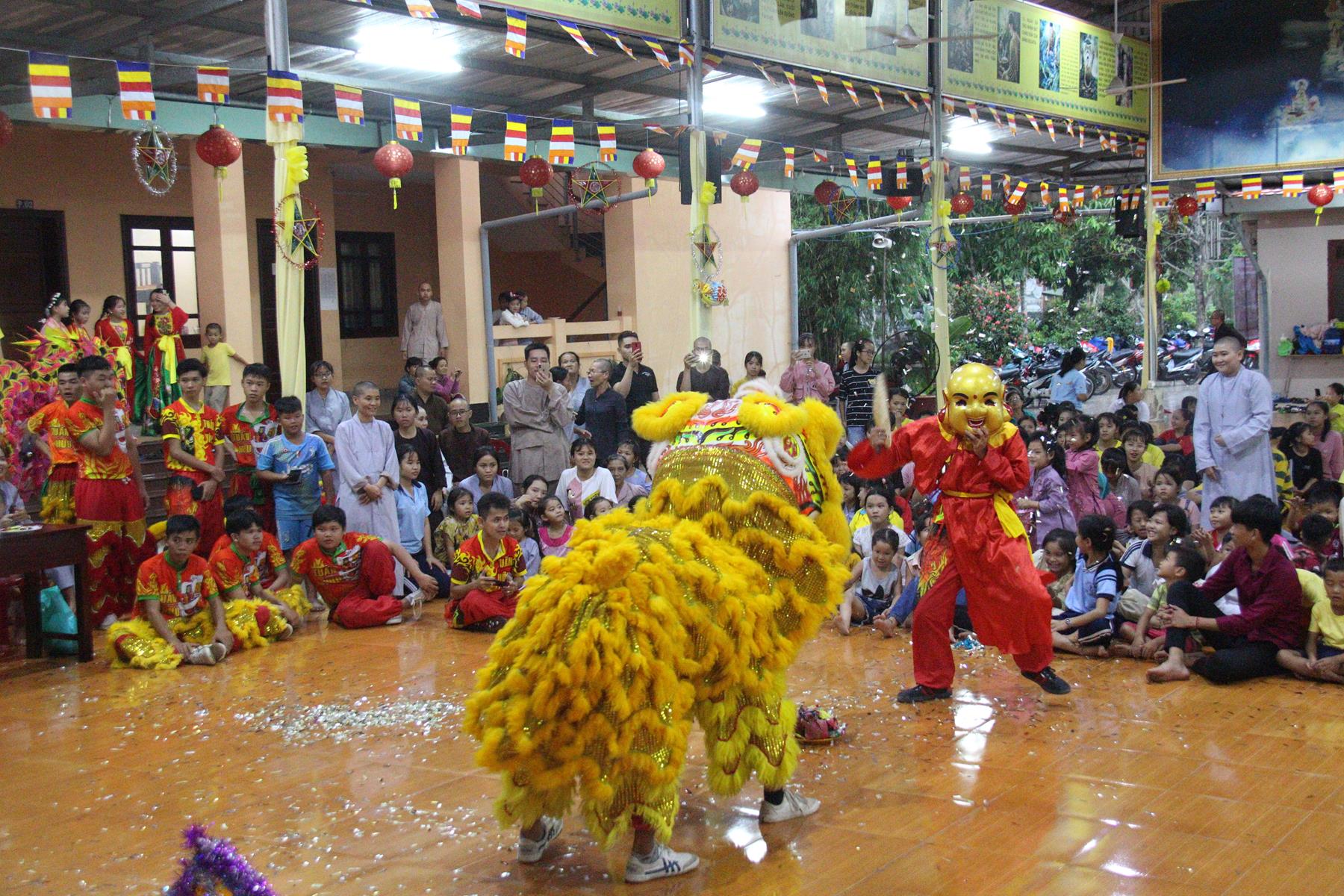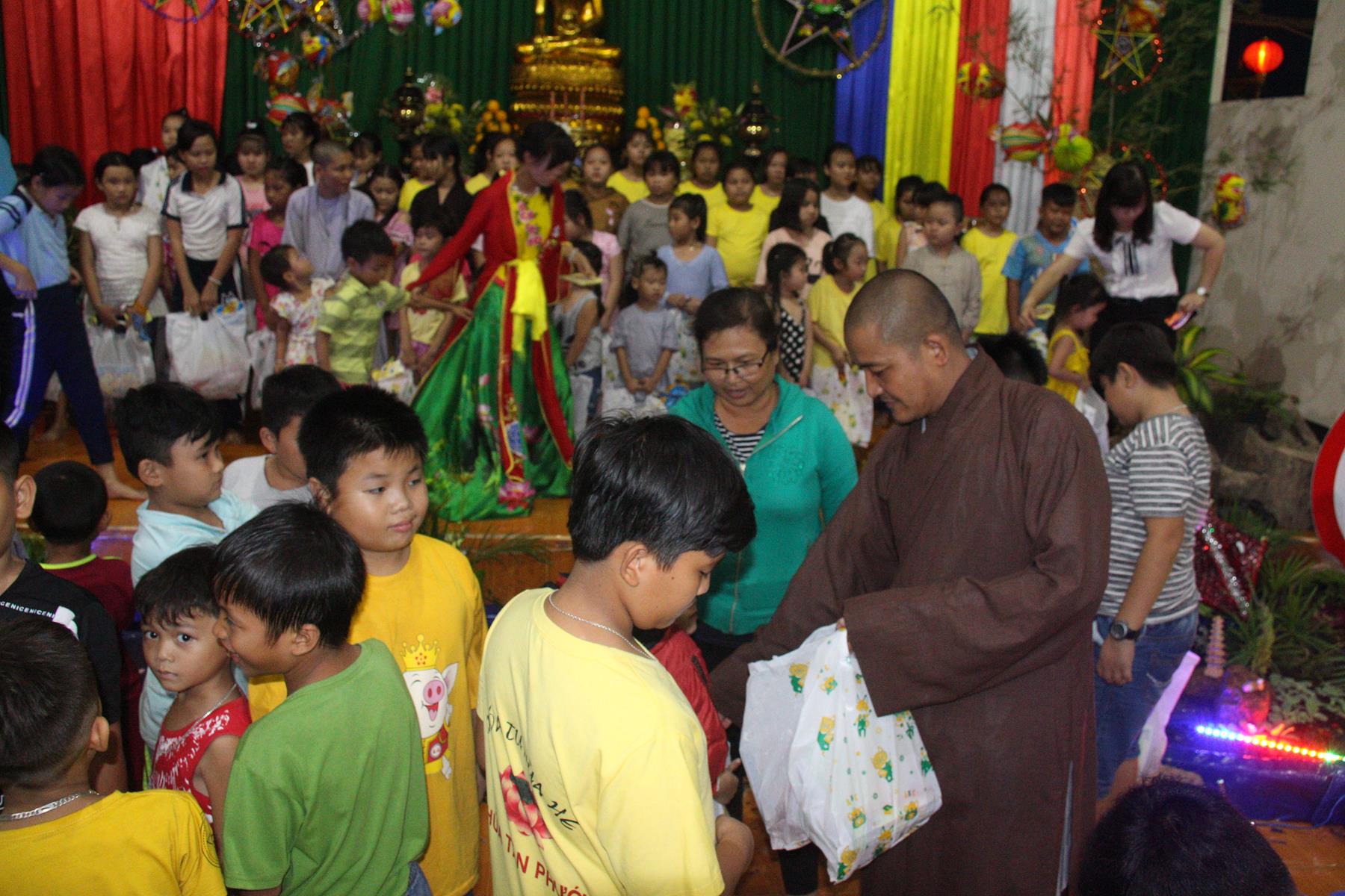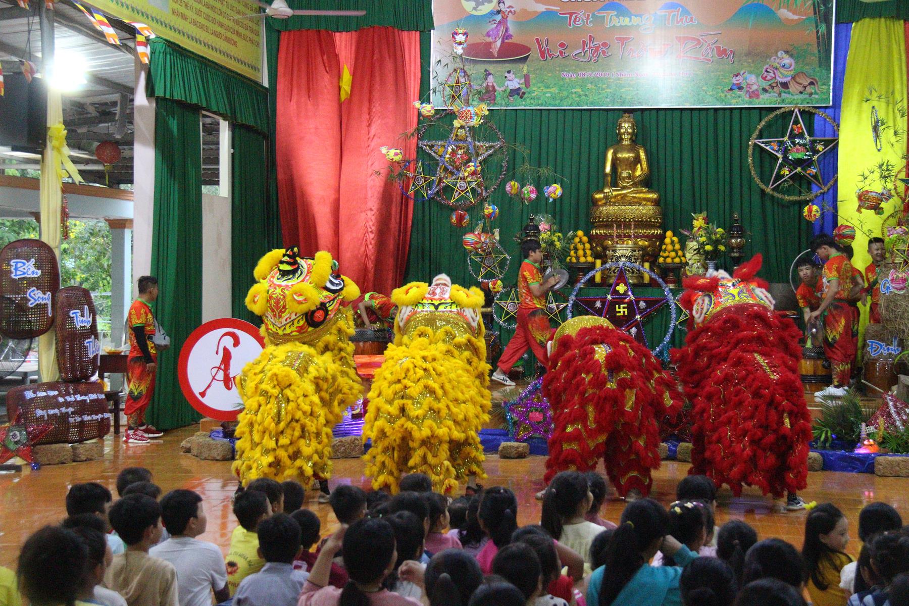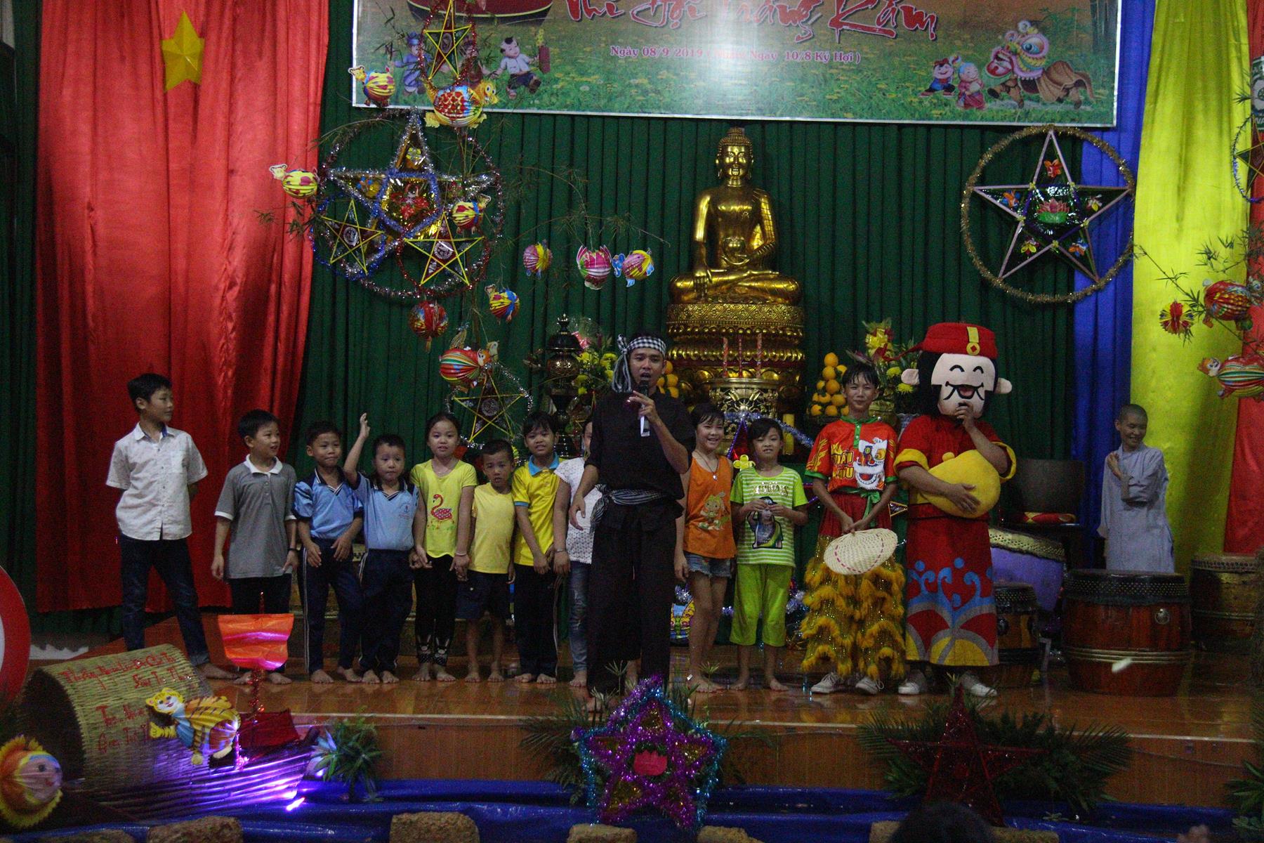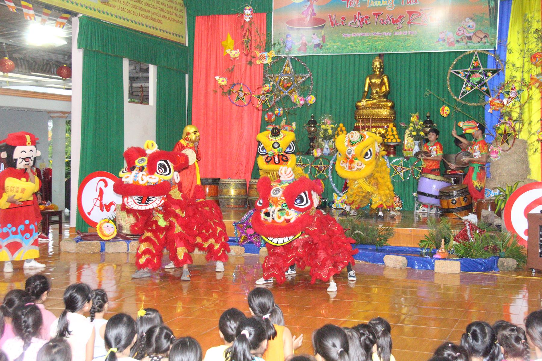 Buổi chiều các em được Đại đức Trưởng ban Tổ chức chia sẻ về Phật pháp và chơi các trò chơi dân gian hồn nhiên vô tư, được xem múa lân, được nghe kể chuyện về “Ông cuội chị Hằng” và biểu diễn văn nghệ do các em biểu diễn mang ý nghĩa ấm áp của sự đoàn viên và vui nhộn của trẻ thơ với những tràn pháo tay khích lệ, những tiếng cười rộn rã trong veo của các em tan vào hư không thật đáng được nâng niu, nuôi dưỡng và kết thúc ngày Hội trăng rằn là tiết mục vô cùng đặc sắc mà ai cũng mong đợi ăn buffet chay – nhận quà, chụp hình lưu niệm và ra về.