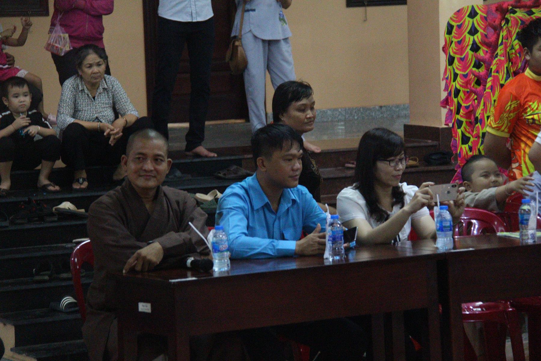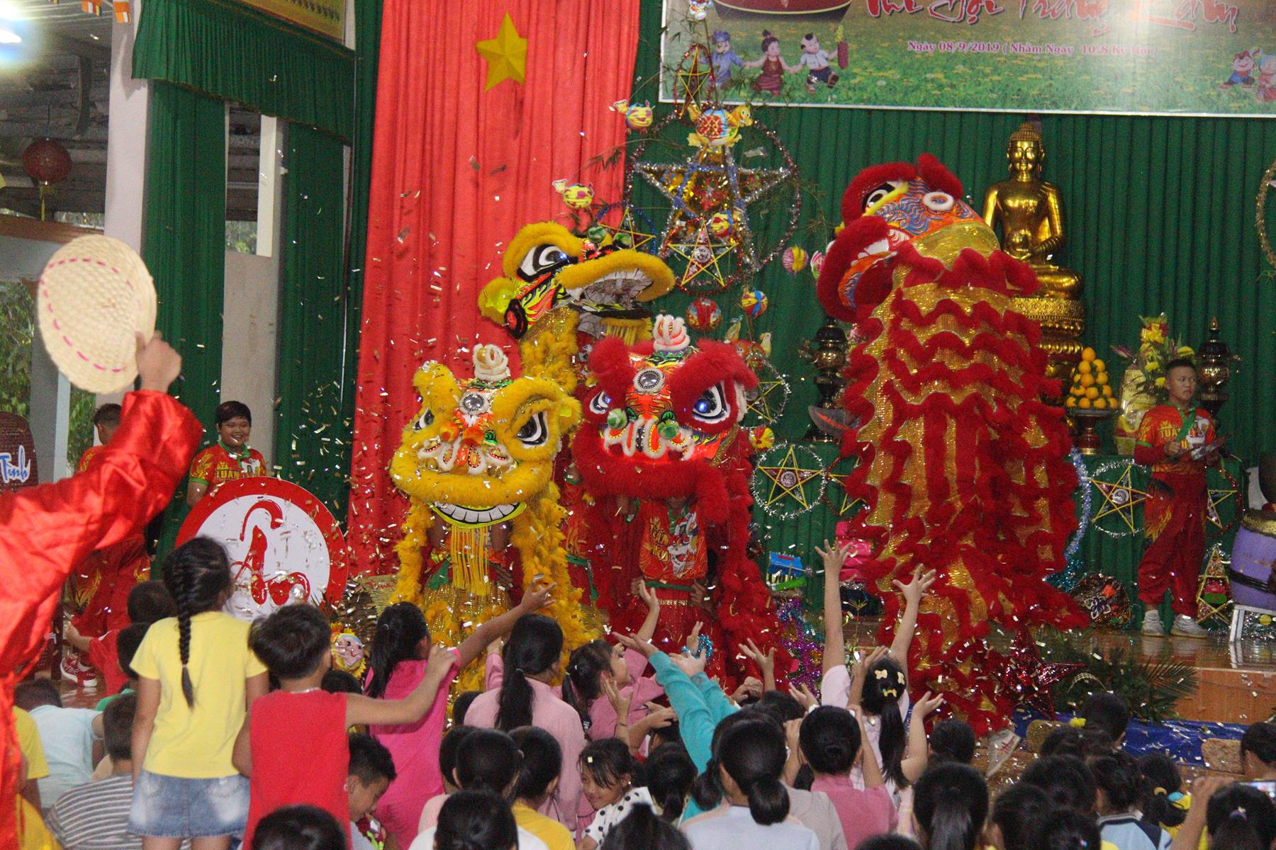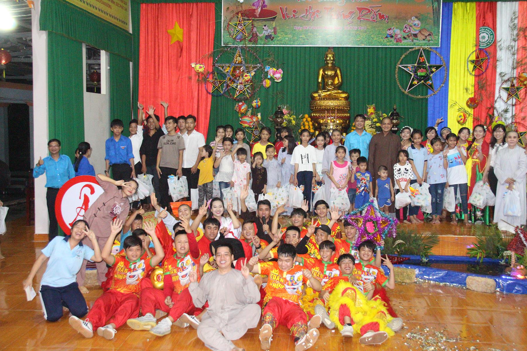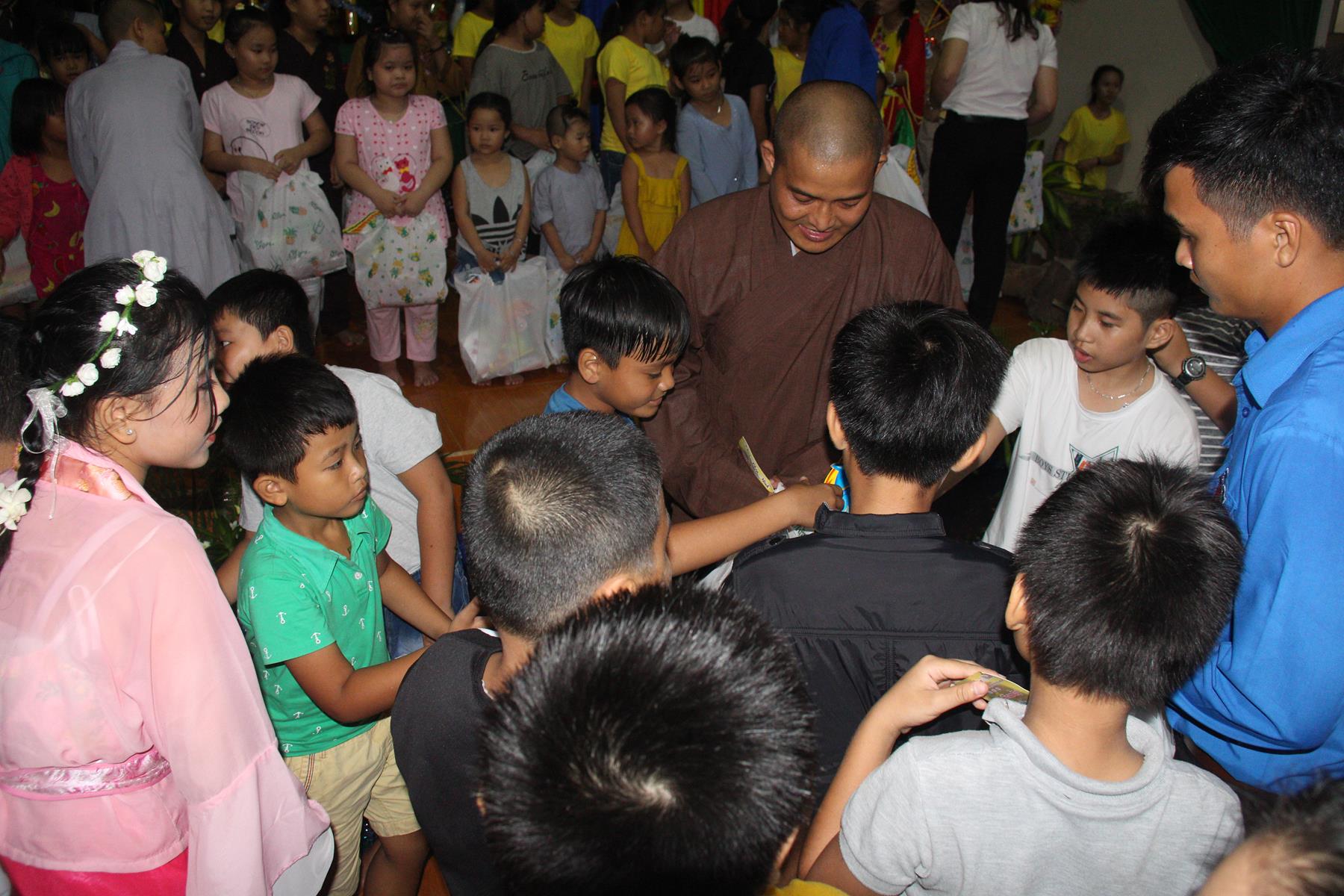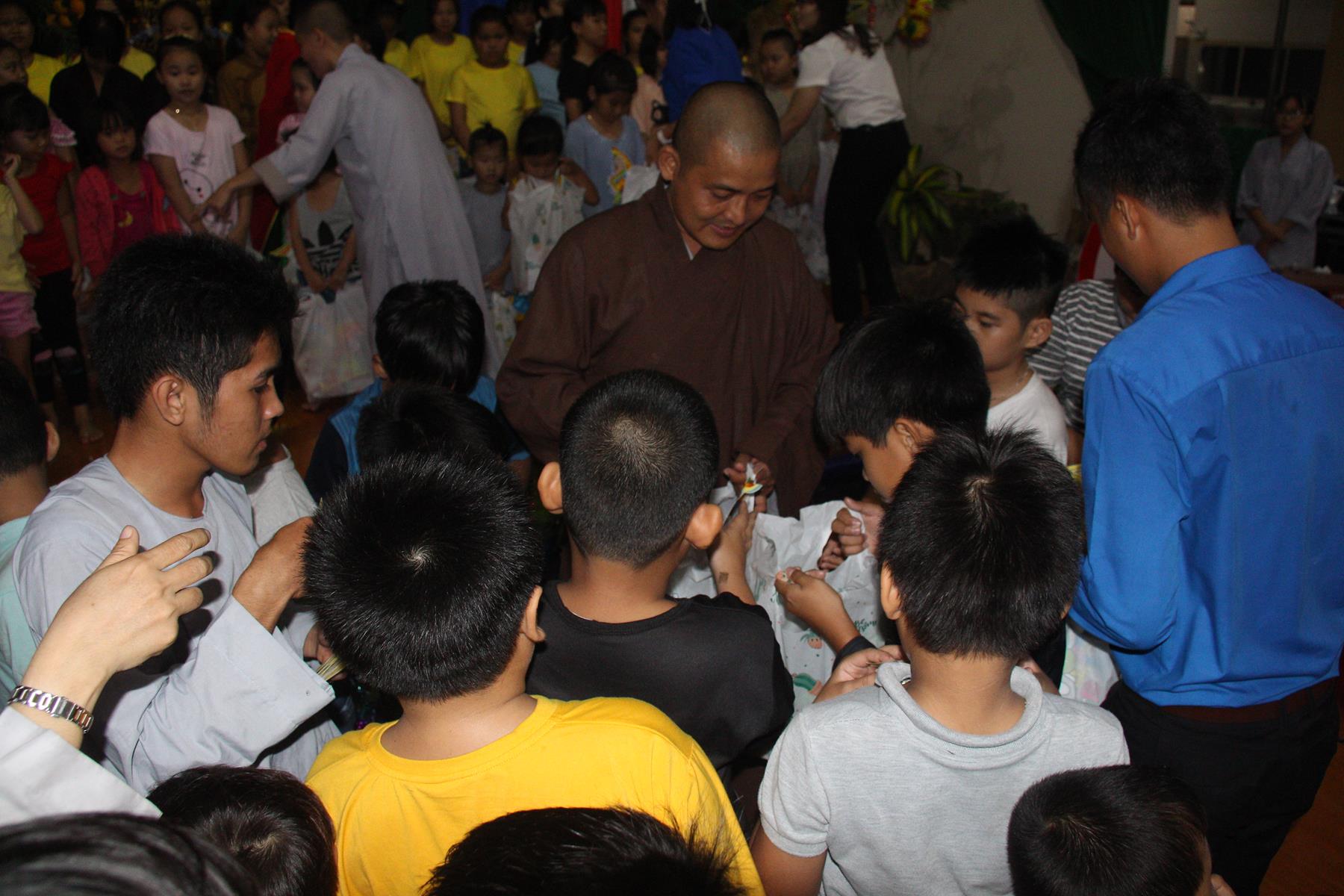 Buổi chiều các em được Đại đức Trưởng ban Tổ chức chia sẻ về Phật pháp và chơi các trò chơi dân gian hồn nhiên vô tư, được xem múa lân, được nghe kể chuyện về “Ông cuội chị Hằng” và biểu diễn văn nghệ do các em biểu diễn mang ý nghĩa ấm áp của sự đoàn viên và vui nhộn của trẻ thơ với những tràn pháo tay khích lệ, những tiếng cười rộn rã trong veo của các em tan vào hư không thật đáng được nâng niu, nuôi dưỡng và kết thúc ngày Hội trăng rằn là tiết mục vô cùng đặc sắc mà ai cũng mong đợi ăn buffet chay – nhận quà, chụp hình lưu niệm và ra về.