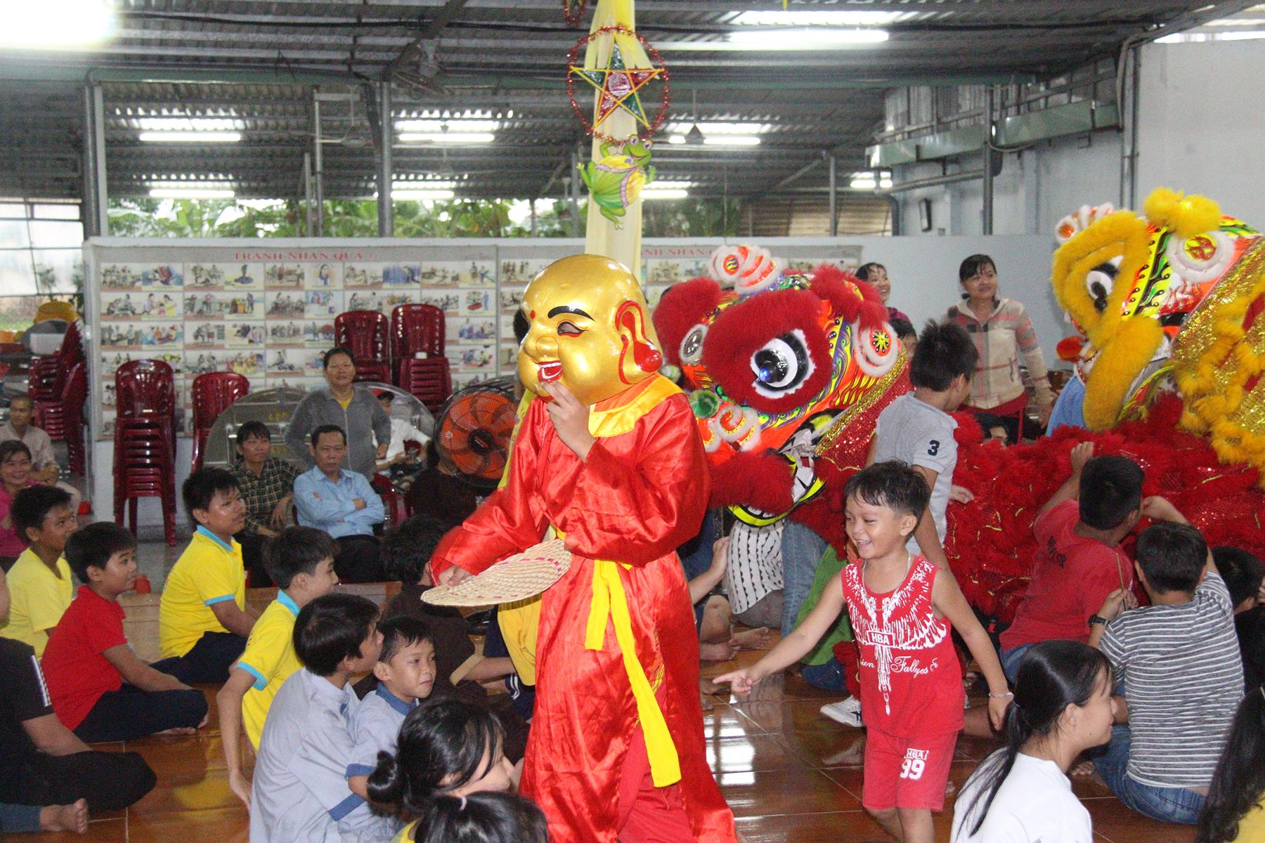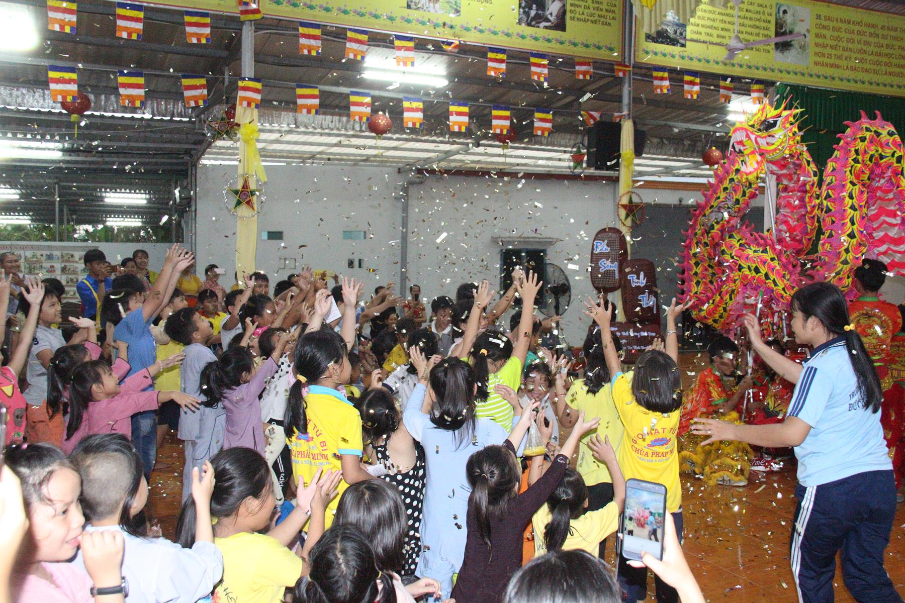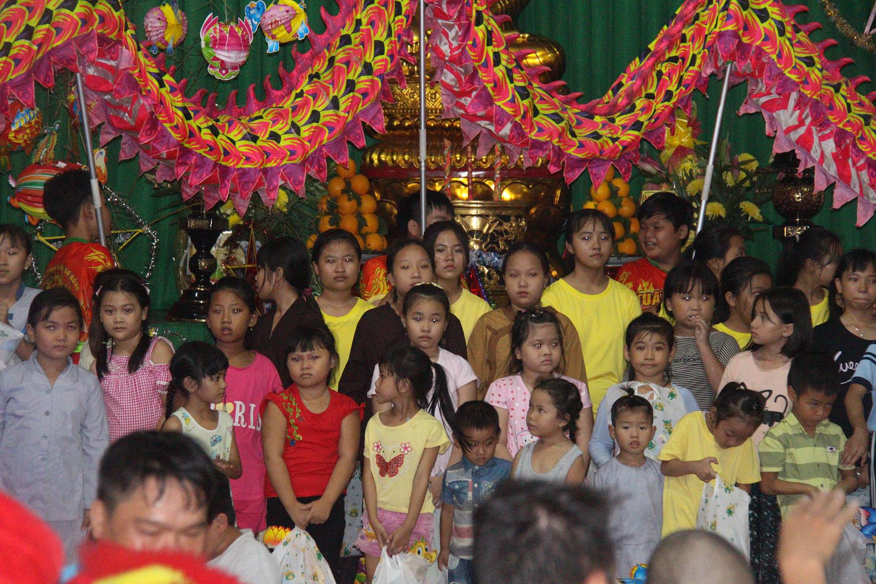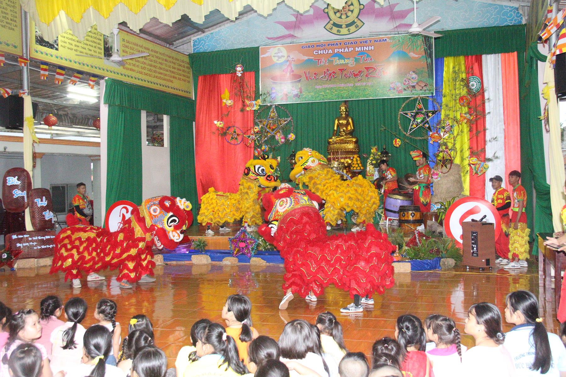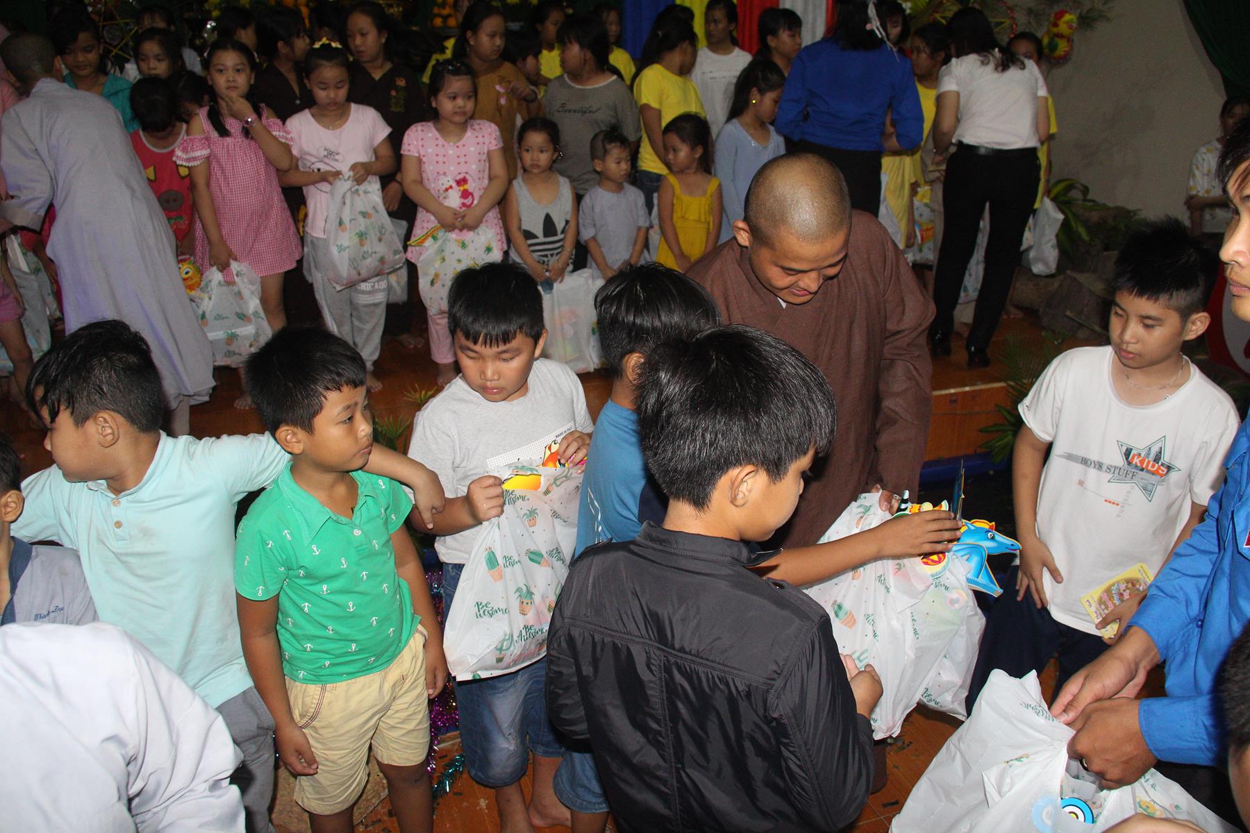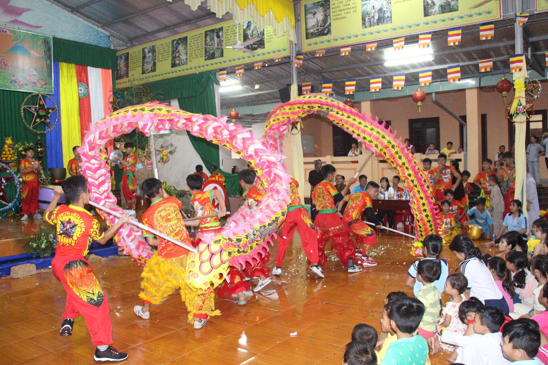 Buổi chiều các em được Đại đức Trưởng ban Tổ chức chia sẻ về Phật pháp và chơi các trò chơi dân gian hồn nhiên vô tư, được xem múa lân, được nghe kể chuyện về “Ông cuội chị Hằng” và biểu diễn văn nghệ do các em biểu diễn mang ý nghĩa ấm áp của sự đoàn viên và vui nhộn của trẻ thơ với những tràn pháo tay khích lệ, những tiếng cười rộn rã trong veo của các em tan vào hư không thật đáng được nâng niu, nuôi dưỡng và kết thúc ngày Hội trăng rằn là tiết mục vô cùng đặc sắc mà ai cũng mong đợi ăn buffet chay – nhận quà, chụp hình lưu niệm và ra về.