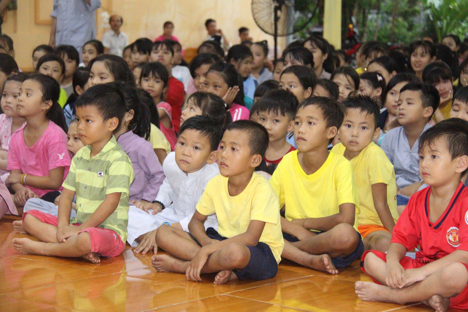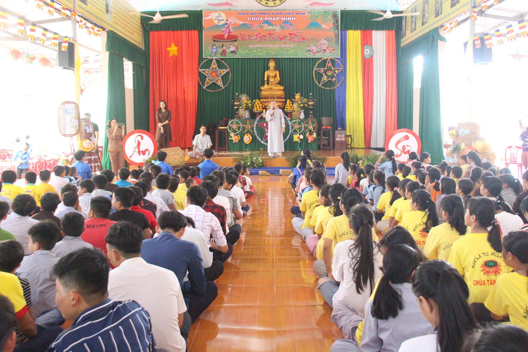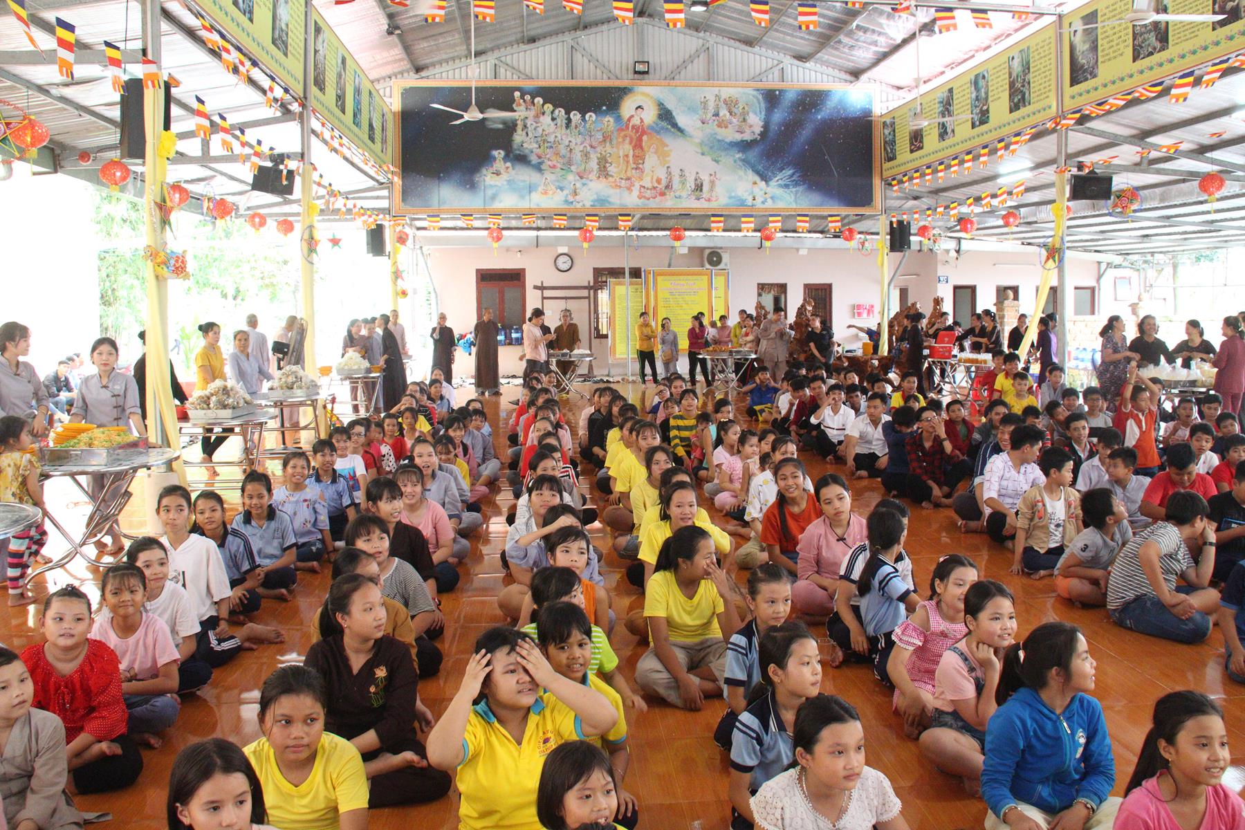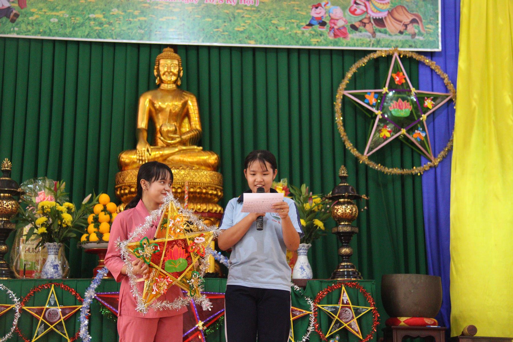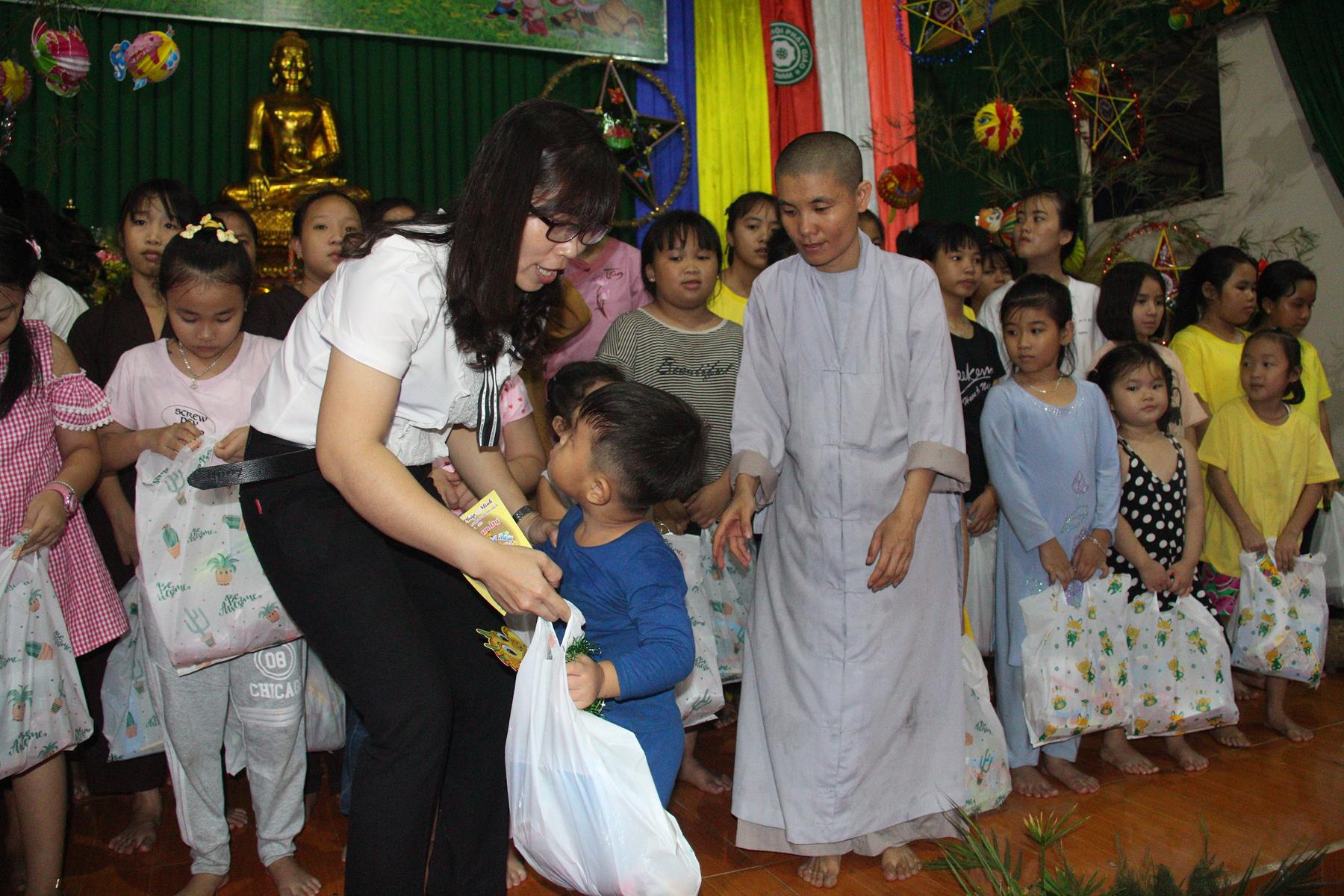 Buổi chiều các em được Đại đức Trưởng ban Tổ chức chia sẻ về Phật pháp và chơi các trò chơi dân gian hồn nhiên vô tư, được xem múa lân, được nghe kể chuyện về “Ông cuội chị Hằng” và biểu diễn văn nghệ do các em biểu diễn mang ý nghĩa ấm áp của sự đoàn viên và vui nhộn của trẻ thơ với những tràn pháo tay khích lệ, những tiếng cười rộn rã trong veo của các em tan vào hư không thật đáng được nâng niu, nuôi dưỡng và kết thúc ngày Hội trăng rằn là tiết mục vô cùng đặc sắc mà ai cũng mong đợi ăn buffet chay – nhận quà, chụp hình lưu niệm và ra về.
