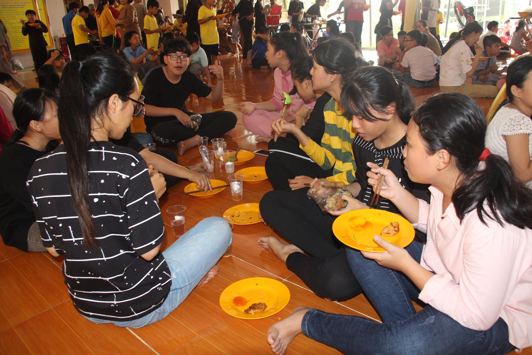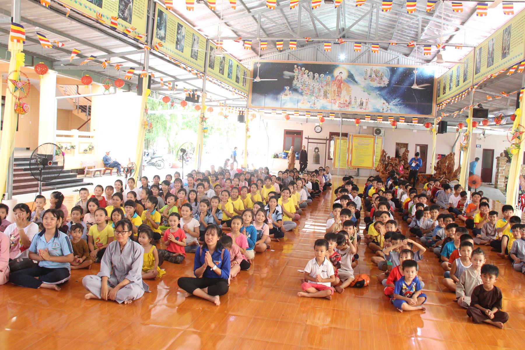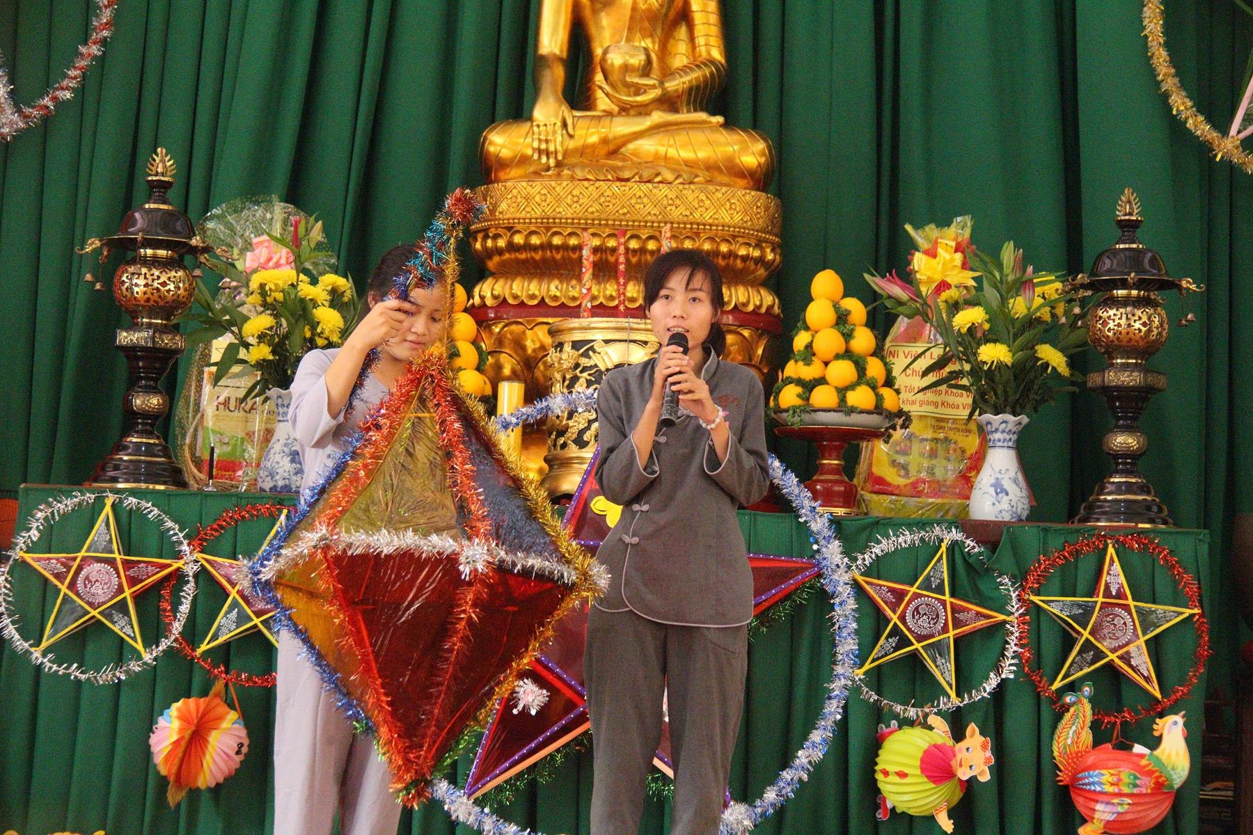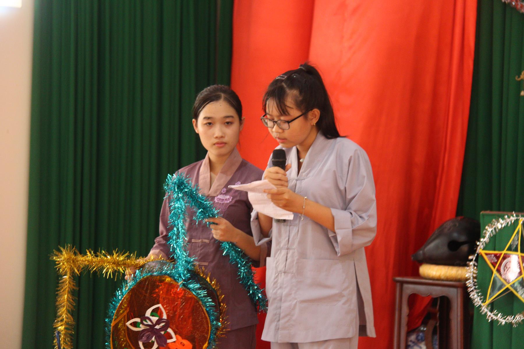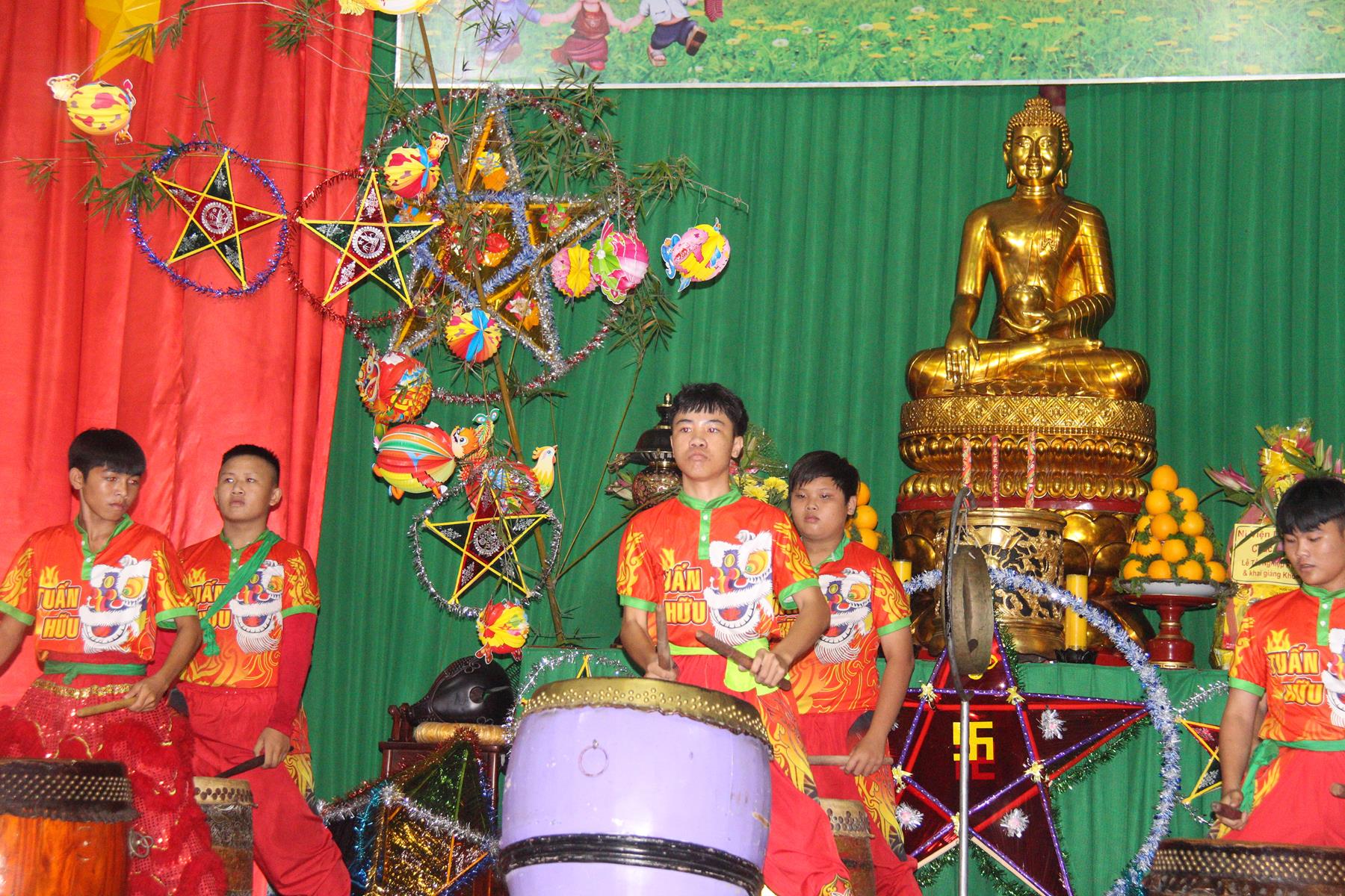 Buổi chiều các em được Đại đức Trưởng ban Tổ chức chia sẻ về Phật pháp và chơi các trò chơi dân gian hồn nhiên vô tư, được xem múa lân, được nghe kể chuyện về “Ông cuội chị Hằng” và biểu diễn văn nghệ do các em biểu diễn mang ý nghĩa ấm áp của sự đoàn viên và vui nhộn của trẻ thơ với những tràn pháo tay khích lệ, những tiếng cười rộn rã trong veo của các em tan vào hư không thật đáng được nâng niu, nuôi dưỡng và kết thúc ngày Hội trăng rằn là tiết mục vô cùng đặc sắc mà ai cũng mong đợi ăn buffet chay – nhận quà, chụp hình lưu niệm và ra về.