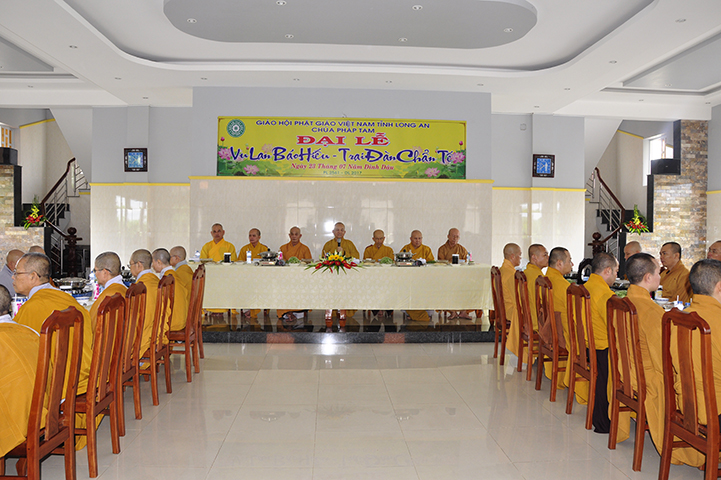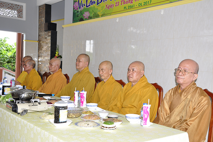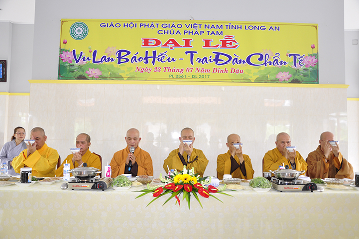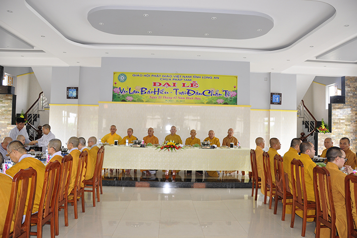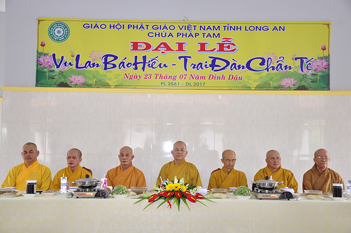 Chứng dự trai đường Vu Lan, Đạo tràng đặc biệt cung đón chư Tôn đức Giáo phẩm: HT. Thích Minh Thiện – Ủy viên HĐTS -Trưởng phó Ban hoằng pháp TW, Trưởng Ban Trị sự GHPGVN tỉnh Long An, Trụ trì chùa Thiên Châu; HT. Thích Chơn Đạo – Giáo thọ Trường Trung cấp PH tỉnh Long An; HT. Thích Tắc Phi – CM Ban Trị sự GHPGVN huyện Bến Lức – Trụ trì Tổ đình Tôn Thạnh; cùng chư Tôn đức các Ban, Ngành trực thuộc tỉnh Long An, chư Tôn đức nhị bộ Trụ trì các tự viện, cùng chư tôn thiền đức Tăng Ni khoảng 100 vị, và đông đảo nam nữ Phật tử gần xa đồng tụ hội về tham dự.