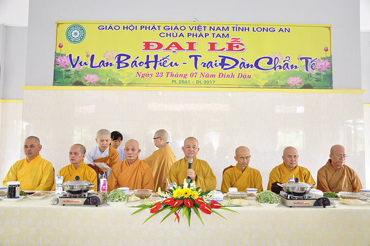 Lời đầu tiên Hòa Thượng gởi đến Ni Sư trụ trì, chư Ni cùng nam nữ Phật tử đạo tràng chùa Pháp Tam lời tán thán, lời tri ân và những lời chúc tốt đẹp trong mùa Vu Lan. HT tán dương tinh thần tổ chức lễ hội Vu Lan, tưởng nhớ tứ trọng ân của tất cả các tự viện trong địa bàn tỉnh Long An những năm qua, trong đó có chùa Pháp Tam, vì tinh thần ấy đã góp phần đào tạo nên những người Phật tử chân chánh. Mùa Vu Lan là mùa của hiếu hạnh, mùa mà chư Phật tử noi theo gương hiếu hạnh của Ngài đại hiếu Mục Kiền Liên để tác tạo công đức phước điền, thể hiện hiếu tâm hiếu hạnh của mình với tổ tiên ông bà cha mẹ, “tâm hiếu là tâm Phật hạnh hiếu là hạnh Phật” với tinh thần hiếu hạnh tri ân và báo ân như thế mới là đức hạnh của một người Phật tử chân chánh.