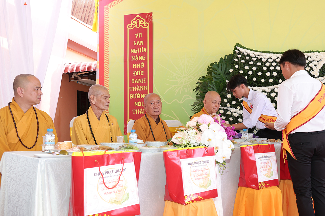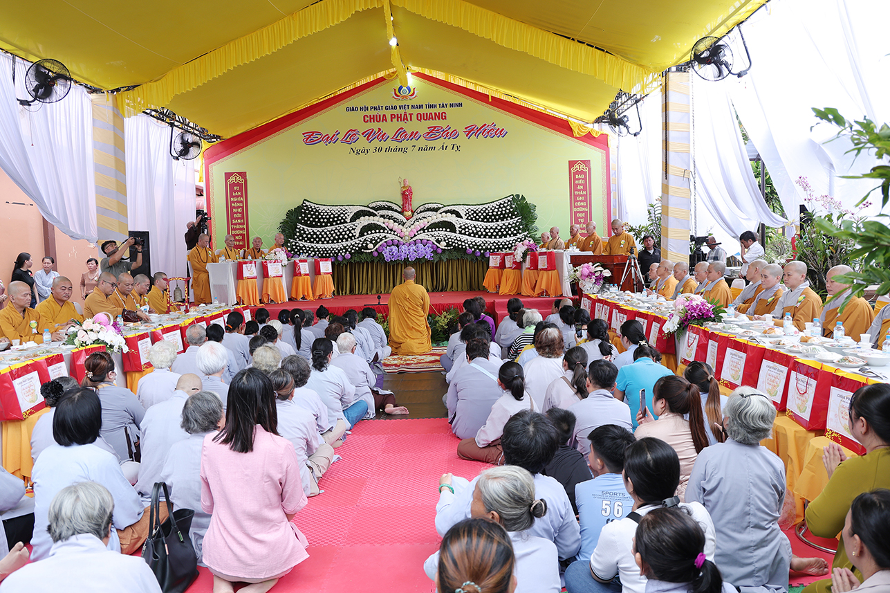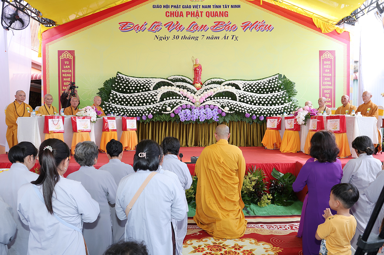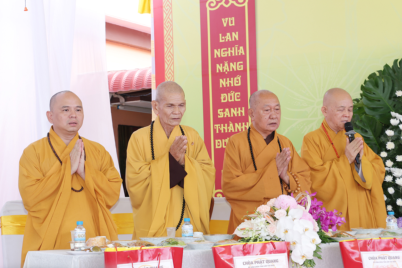 Chứng minh buổi lễ Hòa thượng Thích Minh Thiện – UV HĐTS, Phó Trưởng Ban Hoằng pháp TƯ, Cố vấn – Chứng Minh BTS GHPGVN tỉnh Tây Ninh, đã ban lời đạo từ sách tấn. Trong lời Đạo từ Hòa thượng đã lần nữa ôn lại giá trị cao đẹp của lễ Vu Lan Thắng Hội theo tinh thần Hiếu đạo mà Đức Phật đã dạy. Bên cạnh đó, Ngài đã nhắc nhở người con Phật cần cố gắng đền đáp ơn cha mẹ trong muộn một. Đặc biệt là khi cha mẹ còn tại thế, cần sớm thăm tối viếng, lo lắng, chăm sóc cho cha mẹ được an hưởng tuổi già. Cần tinh chuyên tu tập để hồi hướng cho ông bà cha mẹ nhiều đời nhiều kiếp quá vãng được siêu sinh tịnh độ với giá trị câu nói “ Nhất nhơn hành đạo cửu huyền thăng”, Ngài tán thán hiếu tâm, hiếu hạnh của ĐĐ. Thích Trí Minh – Uỷ viên Thường trực BTS GHPGVN tỉnh Tây Ninh, Trụ trì chùa Phật Quang qua việc báo hiếu phụ mẫu trong hiện đời, và tổ chức trai lễ hướng dẫn Phật tử hành trì pháp Vu Lan Bồn theo đúng lời Phật dạy.