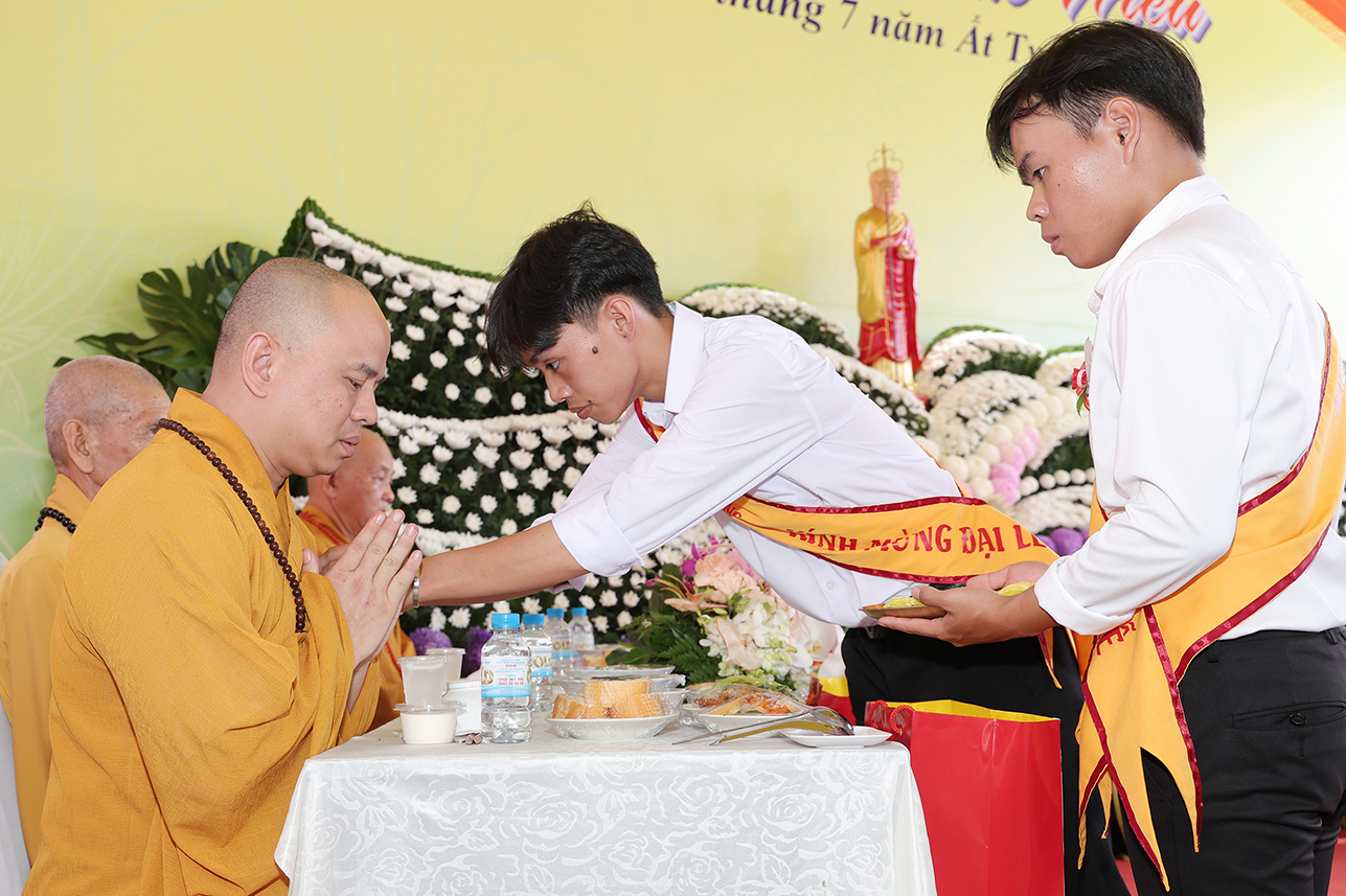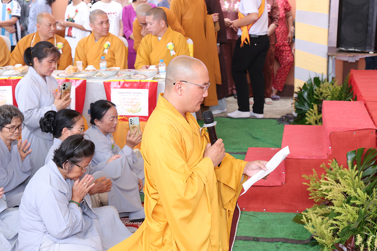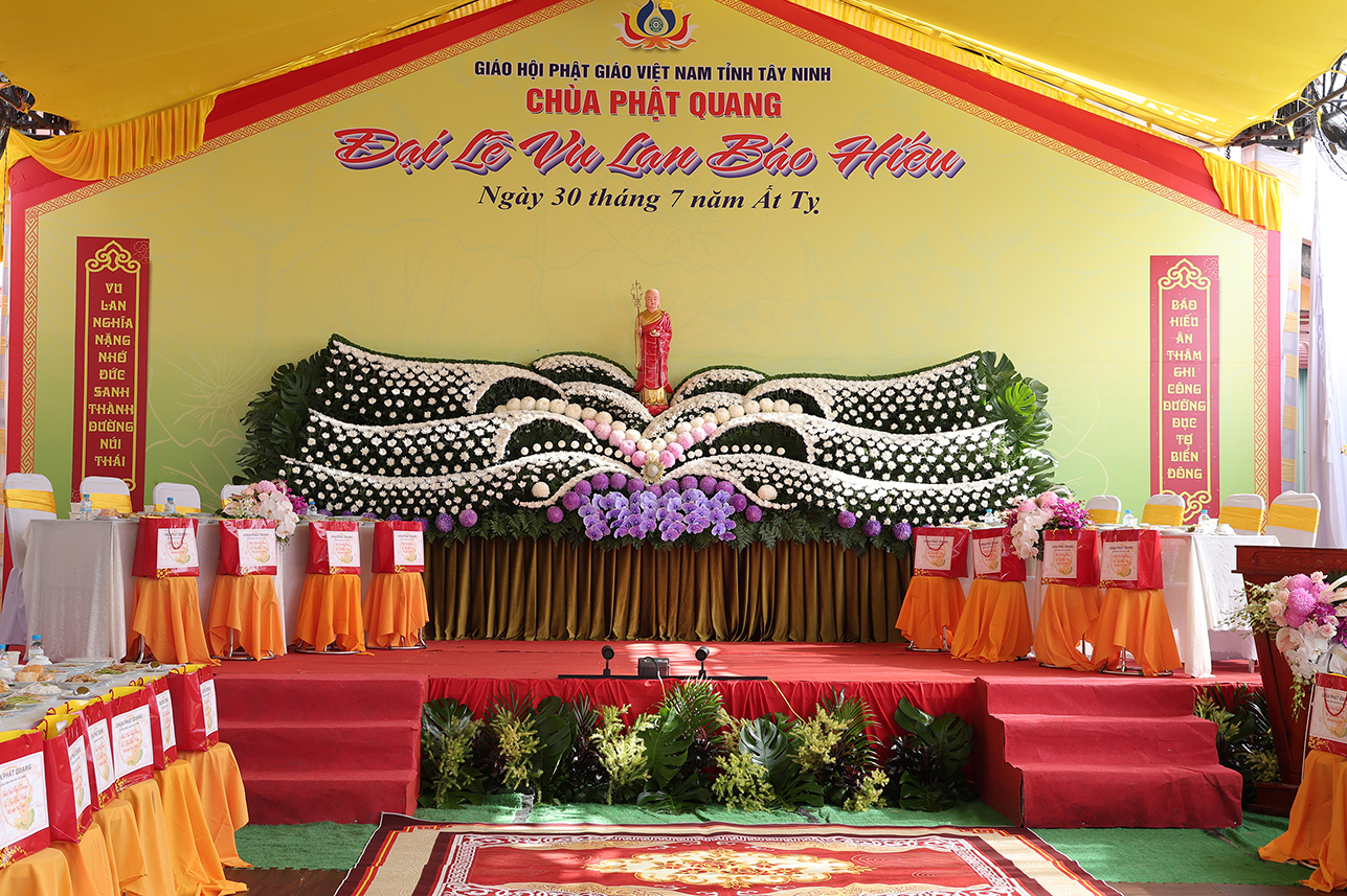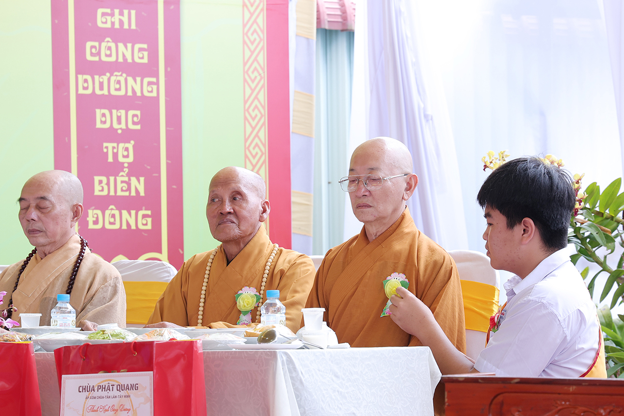 Chứng minh buổi lễ Hòa thượng Thích Minh Thiện – UV HĐTS, Phó Trưởng Ban Hoằng pháp TƯ, Cố vấn – Chứng Minh BTS GHPGVN tỉnh Tây Ninh, đã ban lời đạo từ sách tấn. Trong lời Đạo từ Hòa thượng đã lần nữa ôn lại giá trị cao đẹp của lễ Vu Lan Thắng Hội theo tinh thần Hiếu đạo mà Đức Phật đã dạy. Bên cạnh đó, Ngài đã nhắc nhở người con Phật cần cố gắng đền đáp ơn cha mẹ trong muộn một. Đặc biệt là khi cha mẹ còn tại thế, cần sớm thăm tối viếng, lo lắng, chăm sóc cho cha mẹ được an hưởng tuổi già. Cần tinh chuyên tu tập để hồi hướng cho ông bà cha mẹ nhiều đời nhiều kiếp quá vãng được siêu sinh tịnh độ với giá trị câu nói “ Nhất nhơn hành đạo cửu huyền thăng”, Ngài tán thán hiếu tâm, hiếu hạnh của ĐĐ. Thích Trí Minh – Uỷ viên Thường trực BTS GHPGVN tỉnh Tây Ninh, Trụ trì chùa Phật Quang qua việc báo hiếu phụ mẫu trong hiện đời, và tổ chức trai lễ hướng dẫn Phật tử hành trì pháp Vu Lan Bồn theo đúng lời Phật dạy.