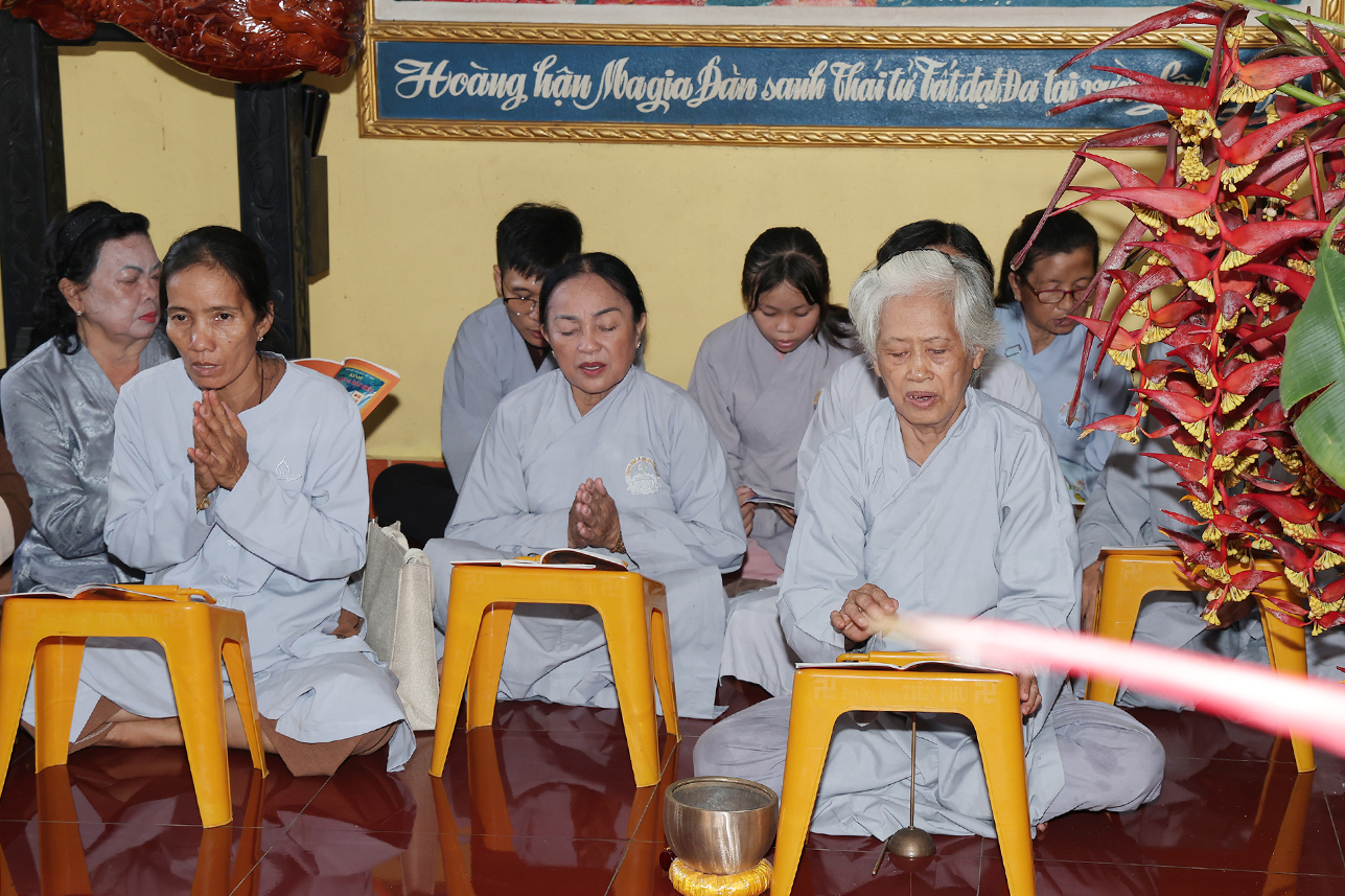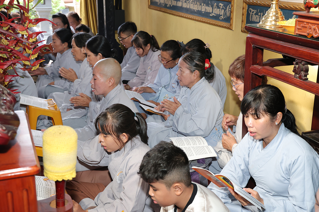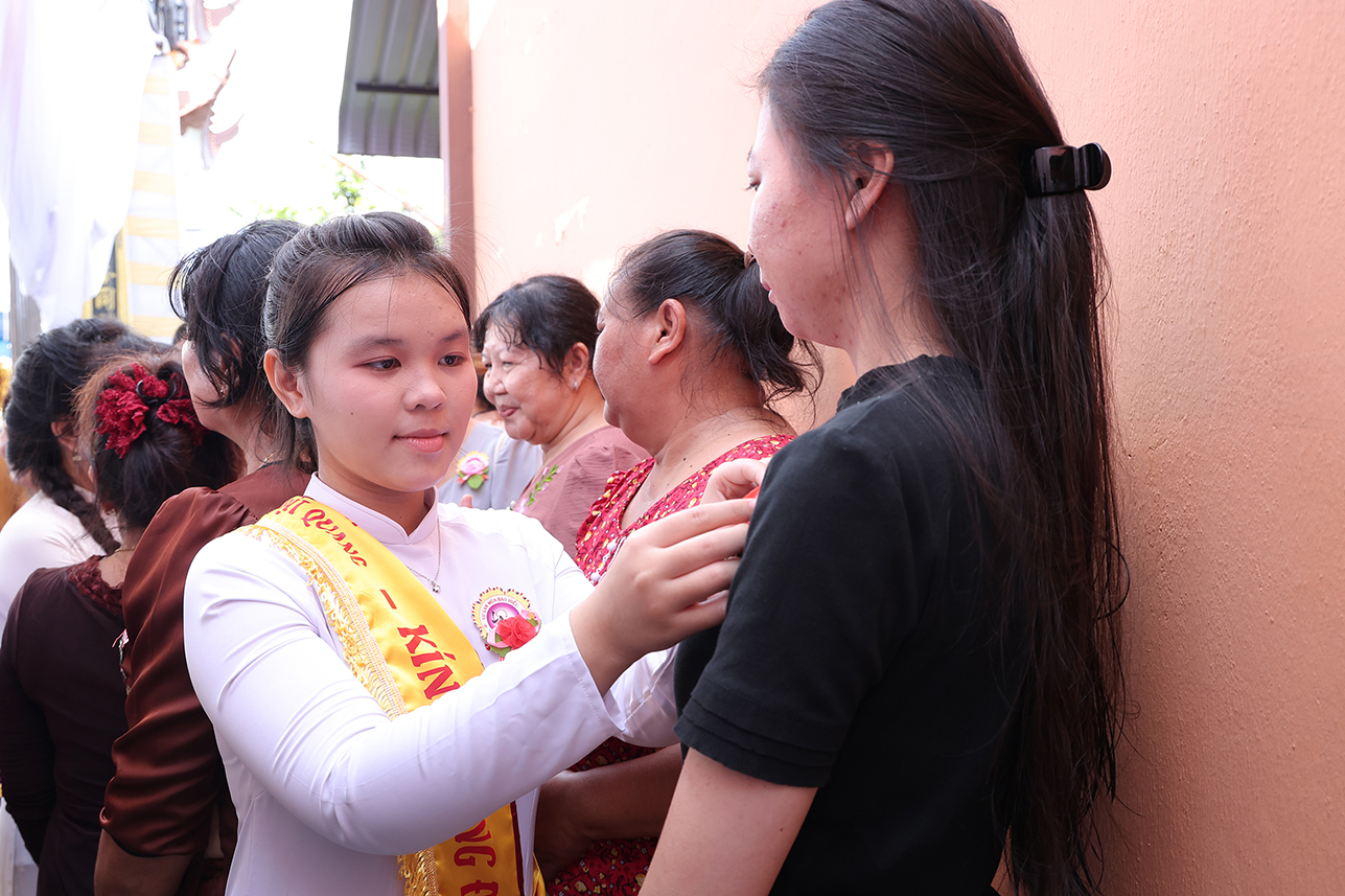 Đạo tràng đã cài hoa hồng vàng để mừng khánh tuế chư tôn đức, bên cạnh đó quý Phật tử cũng được cài Hoa Hồng tưởng nhớ công ơn cha mẹ, tất cả lắng đọng tâm tư qua nhạc khúc “ Bông Hồng cài áo”.