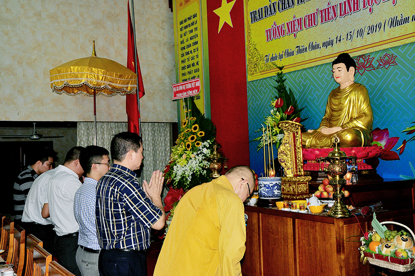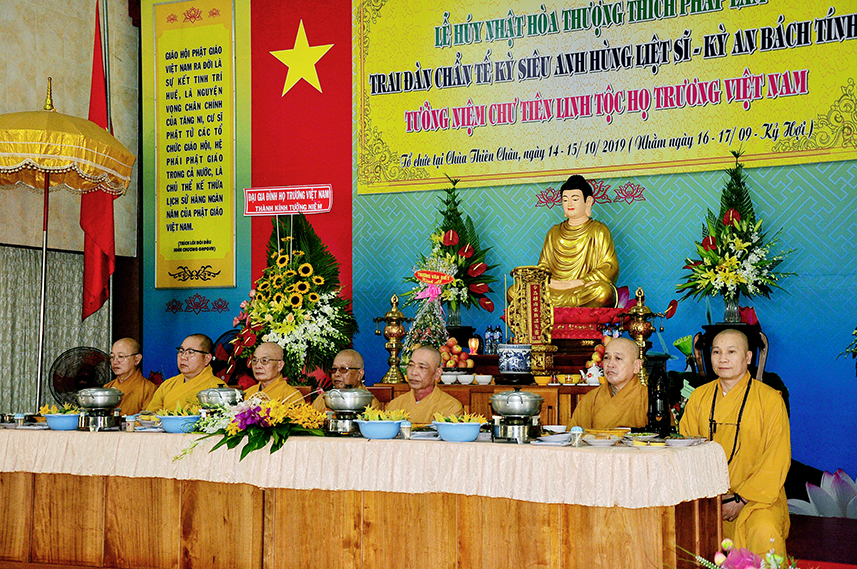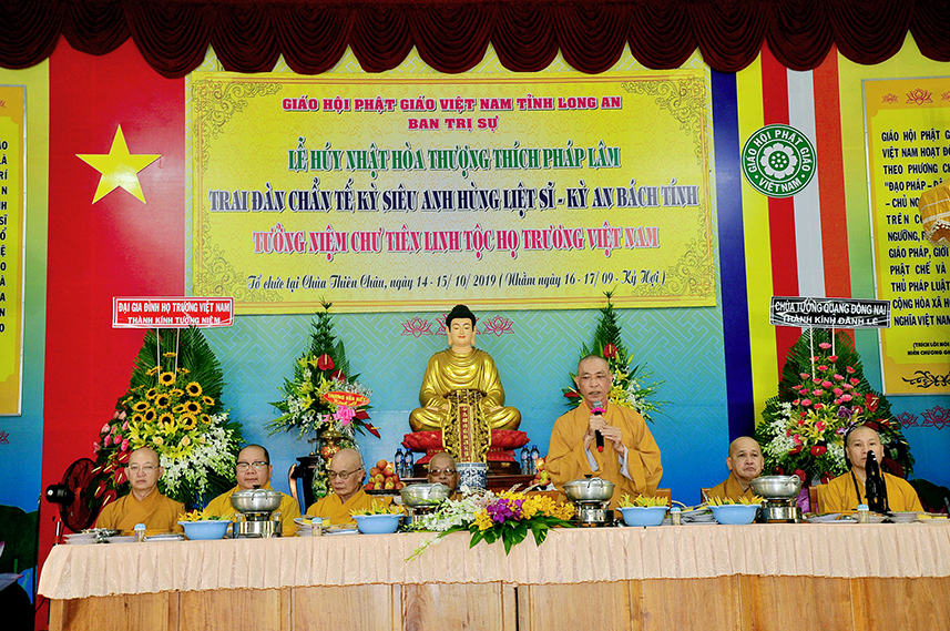 Nhân ngày húy kỵ cố Hòa thượng (HT) Thích Pháp Lâm và để tỏ lòng tri ân chư vị tiền bối hữu công với Đạo pháp – Dân tộc, những anh hùng liêt sĩ, đồng bào tử nạn, đồng thời tưởng niệm chư tiên linh và chúc phúc cho tộc họ Trương Việt Nam, Hòa thượng Thích Minh Thiện – Ủy viên Hội đồng Trị sự (HĐTS), Phó Trưởng ban Hoằng pháp Trung ương (TƯ) Giáo hội Phật giáo Việt Nam (GHPGVN), Trưởng ban Trị sự GHPGVN tỉnh Long An, Trưởng ban tổ chức Đại lễ cùng chư Tăng chùa Thiên Châu – 101 Huỳnh Văn Nhứt, phường 3, thành phố Tân An, tỉnh Long An đã long trọng tổ chức Trai đàn Chẩn tế – kỳ siêu bạt độ và kỳ an bách tính theo truyền thống Phật giáo vào ngày 16/17 tháng 9 năm Kỷ Hợi ( 14/15-10-2019).