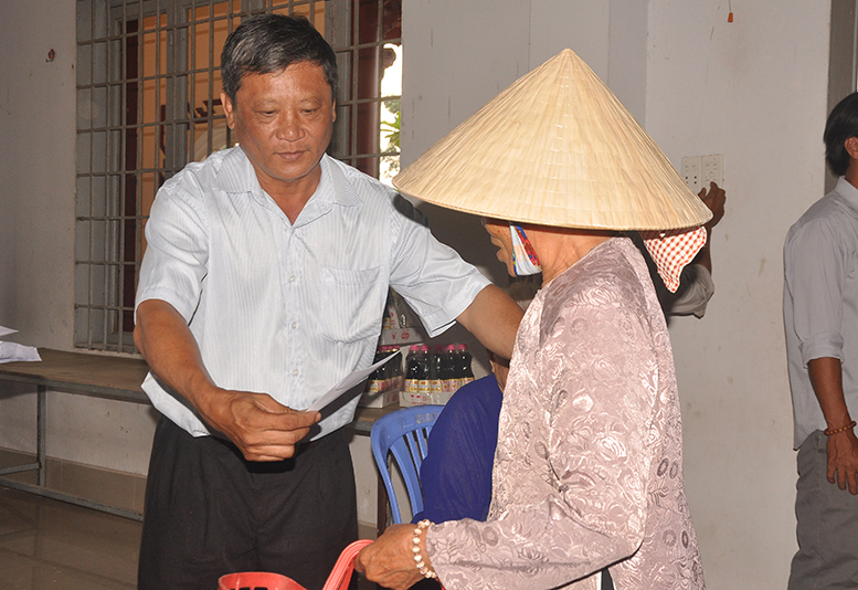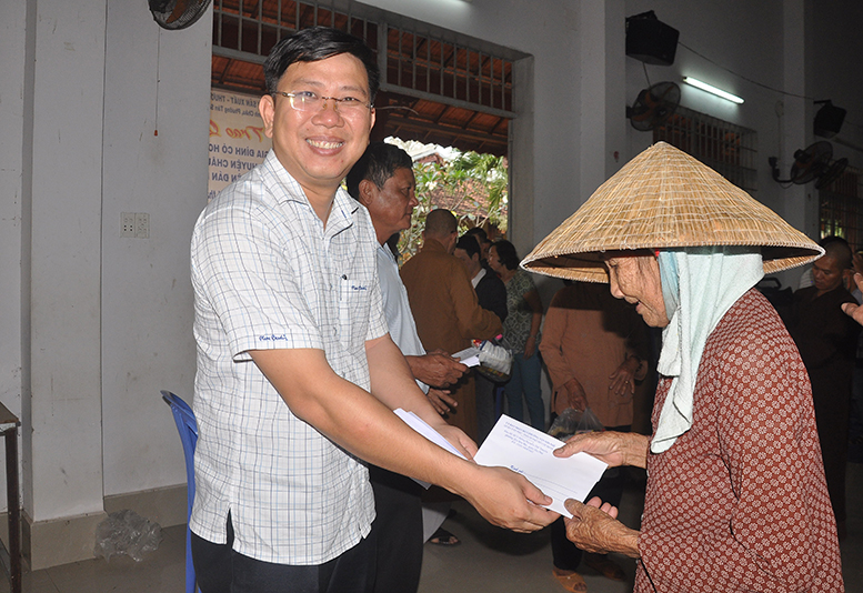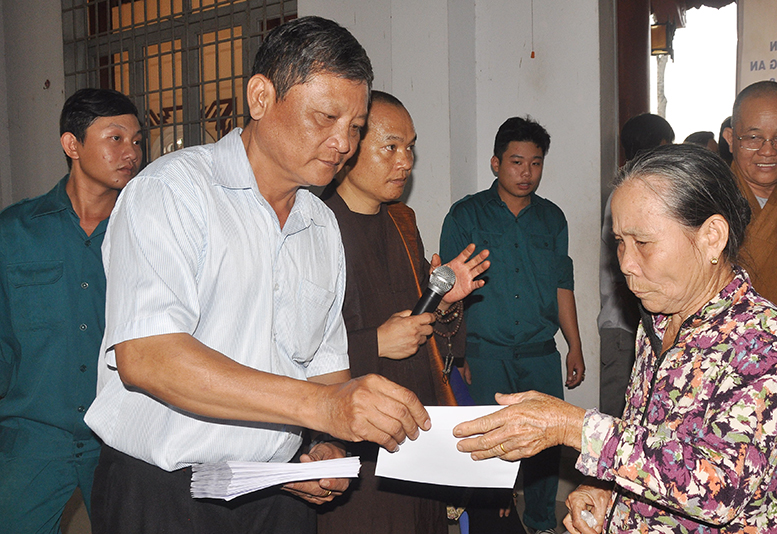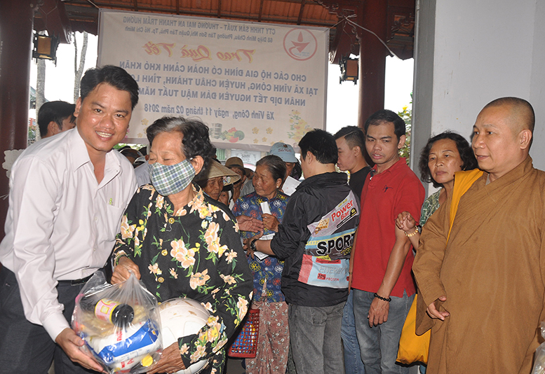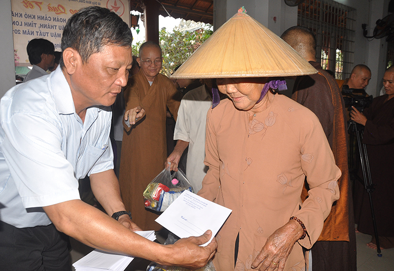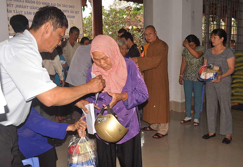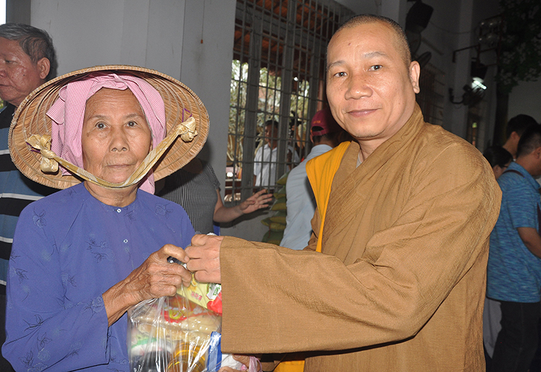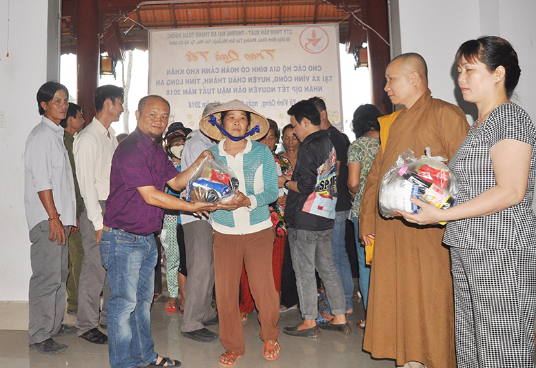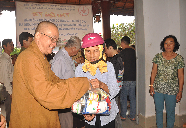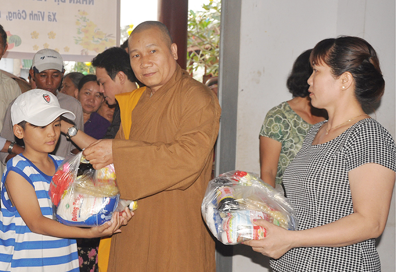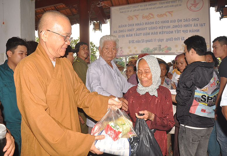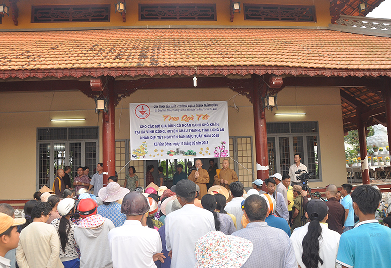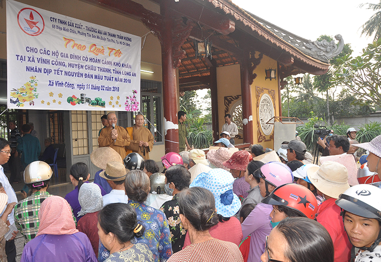 Buổi phát quà với sự chứng minh của HT. Thích Minh Thiện- Ủy viên HĐTSTƯ, Phó Ban Hoằng pháp trung ương, Trưởng Ban trị sự GHPGVN tỉnh Long An; HT. Thích Thiện Tâm- Phó Ban trị sự GHPGVN tỉnh Long An, Trưởng Ban trị sự GHPGVN huyện Châu Thành; ĐĐ. Thích Đức Hoàng- Phó Ban trị sự GHPGVN tỉnh Long An; ĐĐ. Thích Minh Phước – Trụ trì chùa Vĩnh Hưng cùng quý vị lãnh đạo ban nghành xã Vĩnh Công.