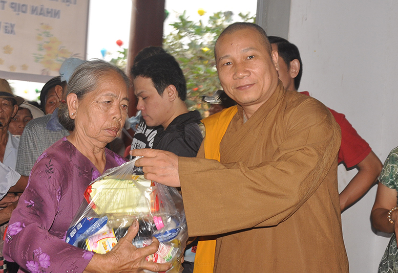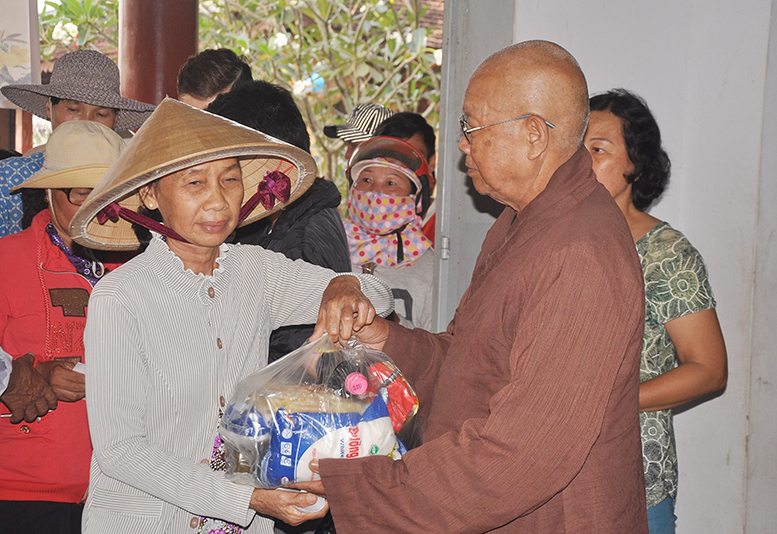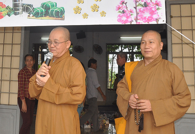 Tại buổi phát quà, HT Thích Minh Thiện gởi lời thăm sức khoẻ đến bà con và chúc bà con đón tết vui vẻ.