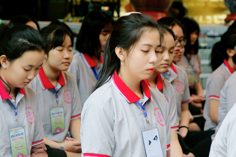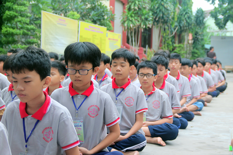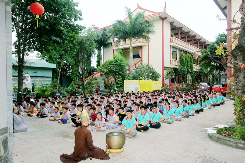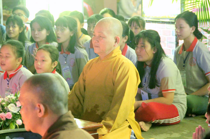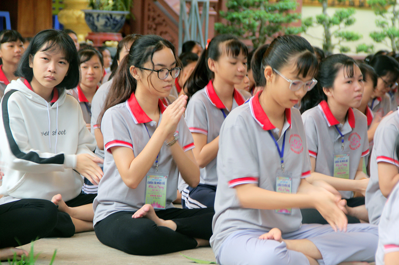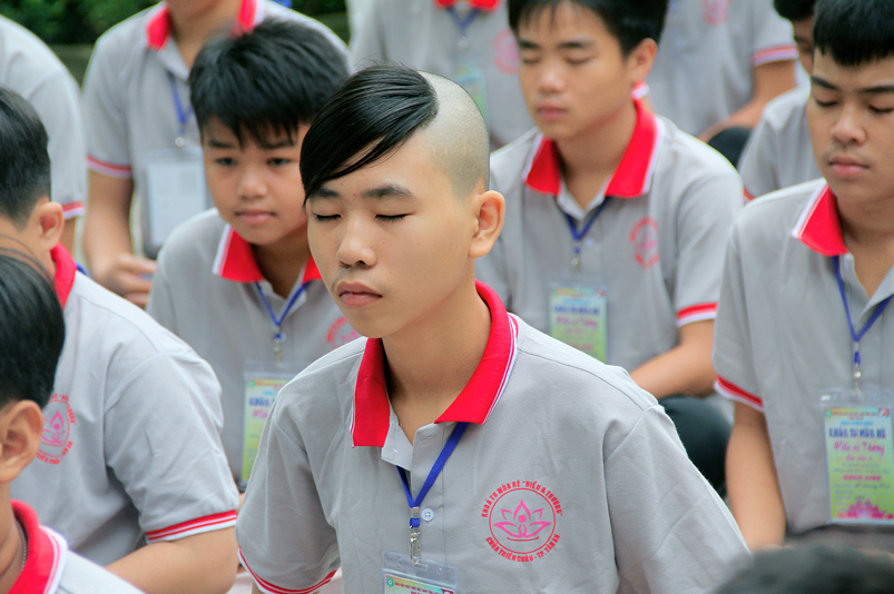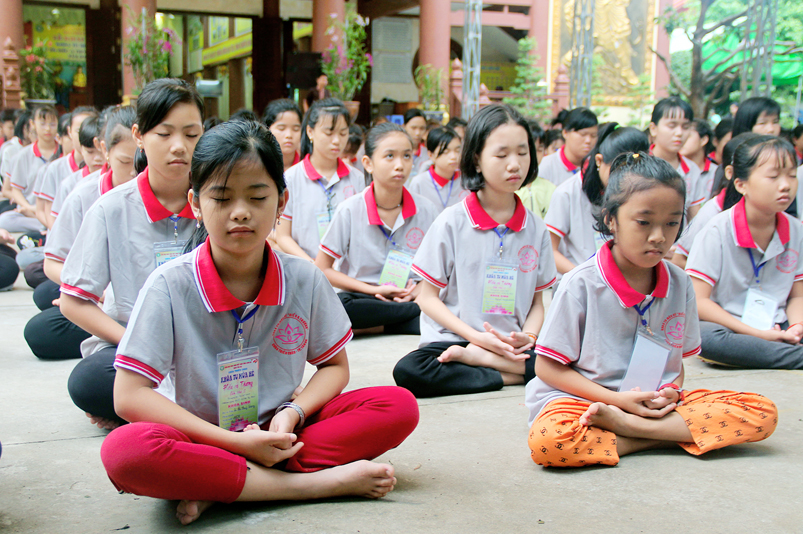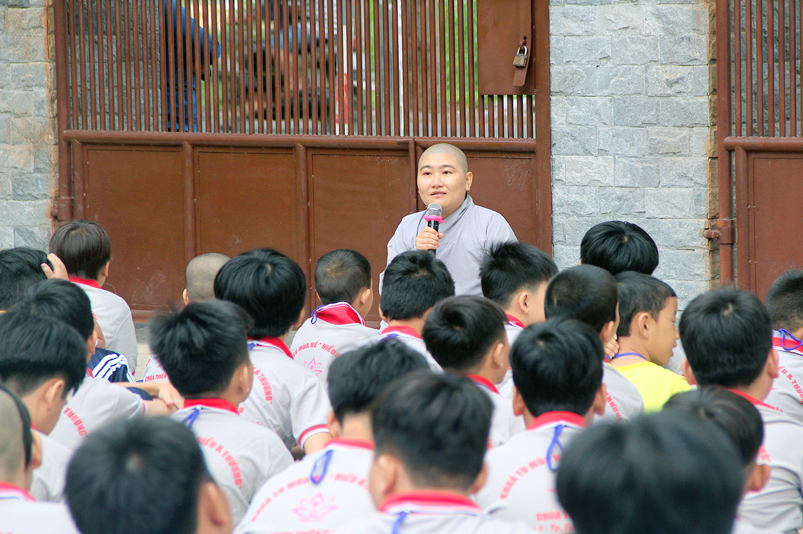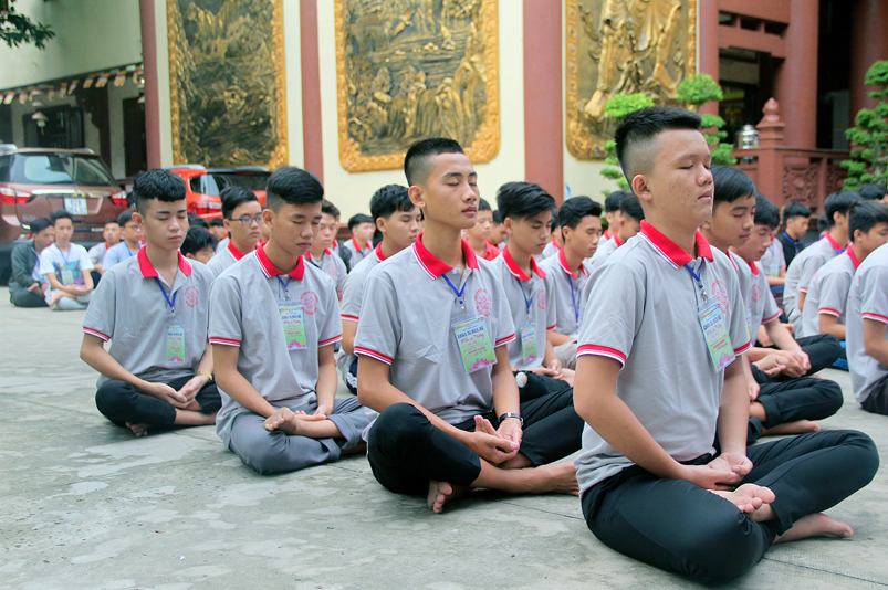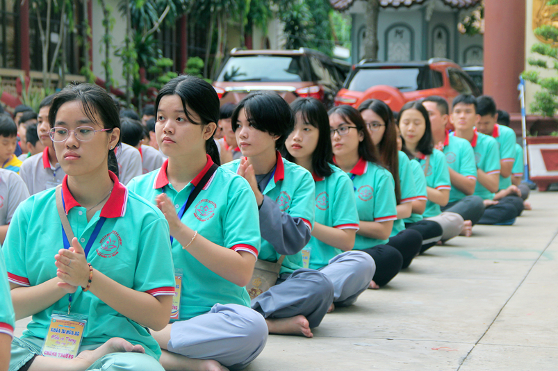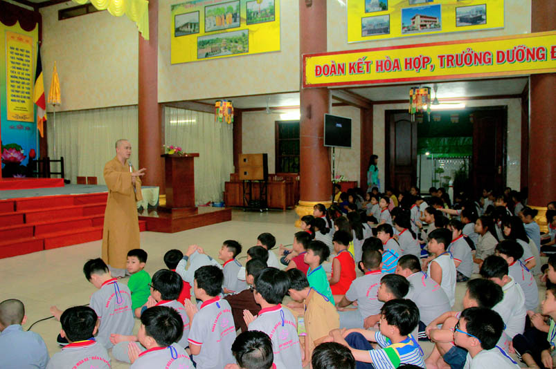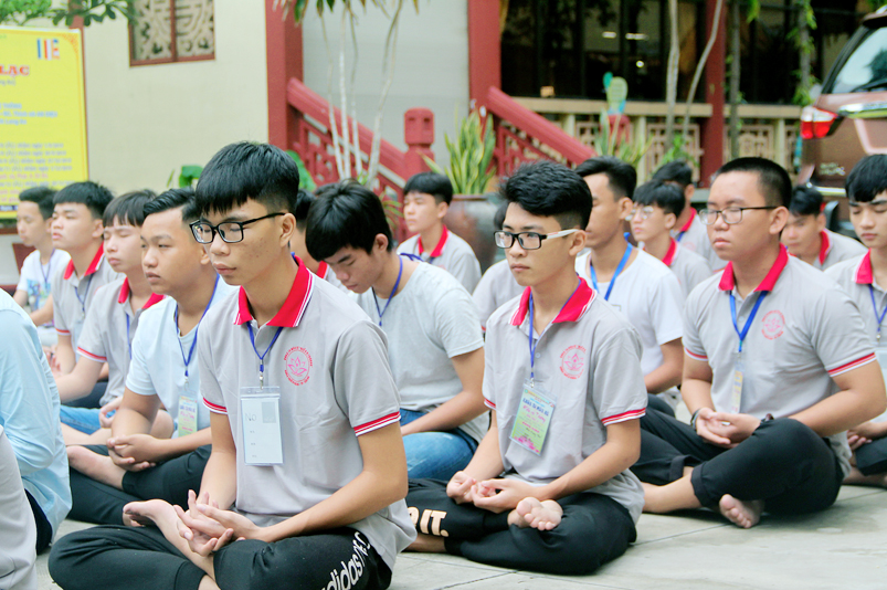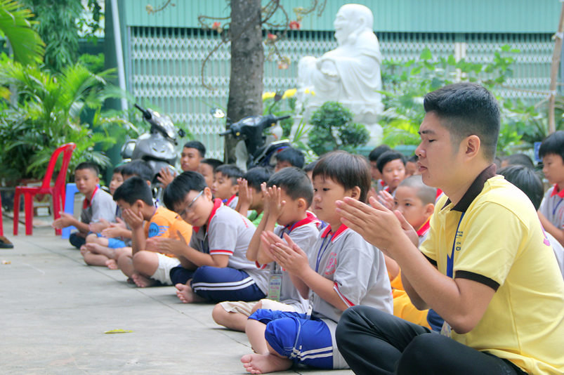 Khóa tu có sự liên kết hài hòa giữa học và chơi. Đến 8h, các em được Đại đức Thích Lệ Trí hướng dẫn tọa thiền, niệm Phật. Bài giảng của Đại đức có sự kết hợp giữa lí thuyết và thực hành kiến cho các em vô cùng phấn khởi. Đặc biệt, Đại đức còn tạo không khí sinh động tặng quà và cho các em thi niệm Phật.