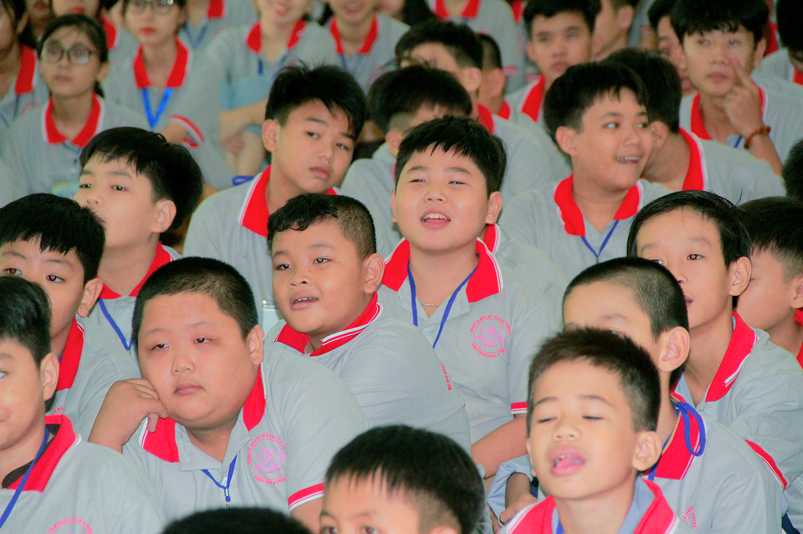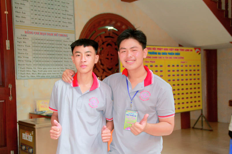 Đúng 6.30, buổi điểm tâm sáng bắt đầu, các em được quý thầy cô hướng dẫn niệm Phật và thực tập quán tưởng công ơn lao nhọc của người làm ra các thức ăn, để các em ý thức được tinh thần tri ân và báo ân.