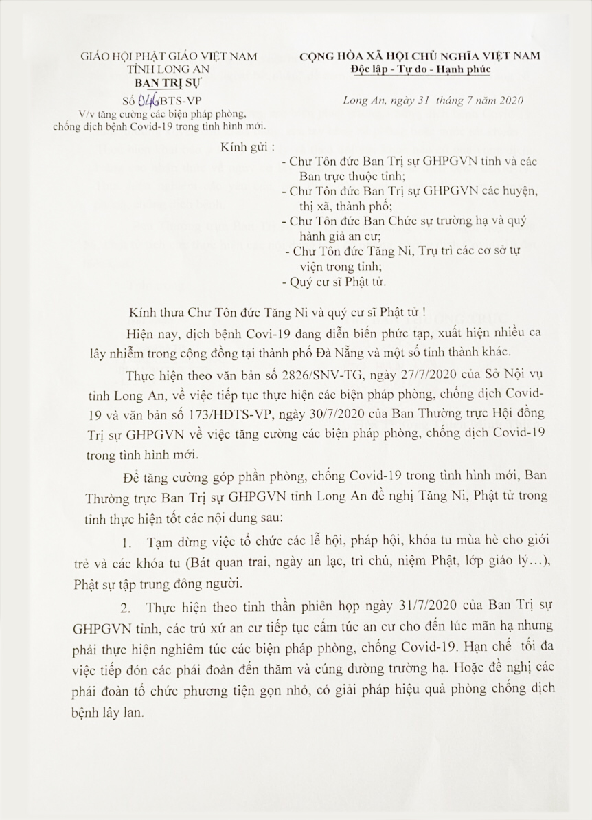 Thực hiện theo văn bản số 2826/SNV-TG, ngày 27/7/2020 của Sở Nội vụ tỉnh Long An, về việc tiếp tục thực hiện các biện pháp phòng, chống dịch Covid-19 và văn bản số 173/HĐTS-VP, ngày 30/7/2020 của Ban Thường trực Hội đồng Trị sự GHPGVN về việc tăng cường các biện pháp phòng, chống dịch Covid-19 trong tình hình mới.