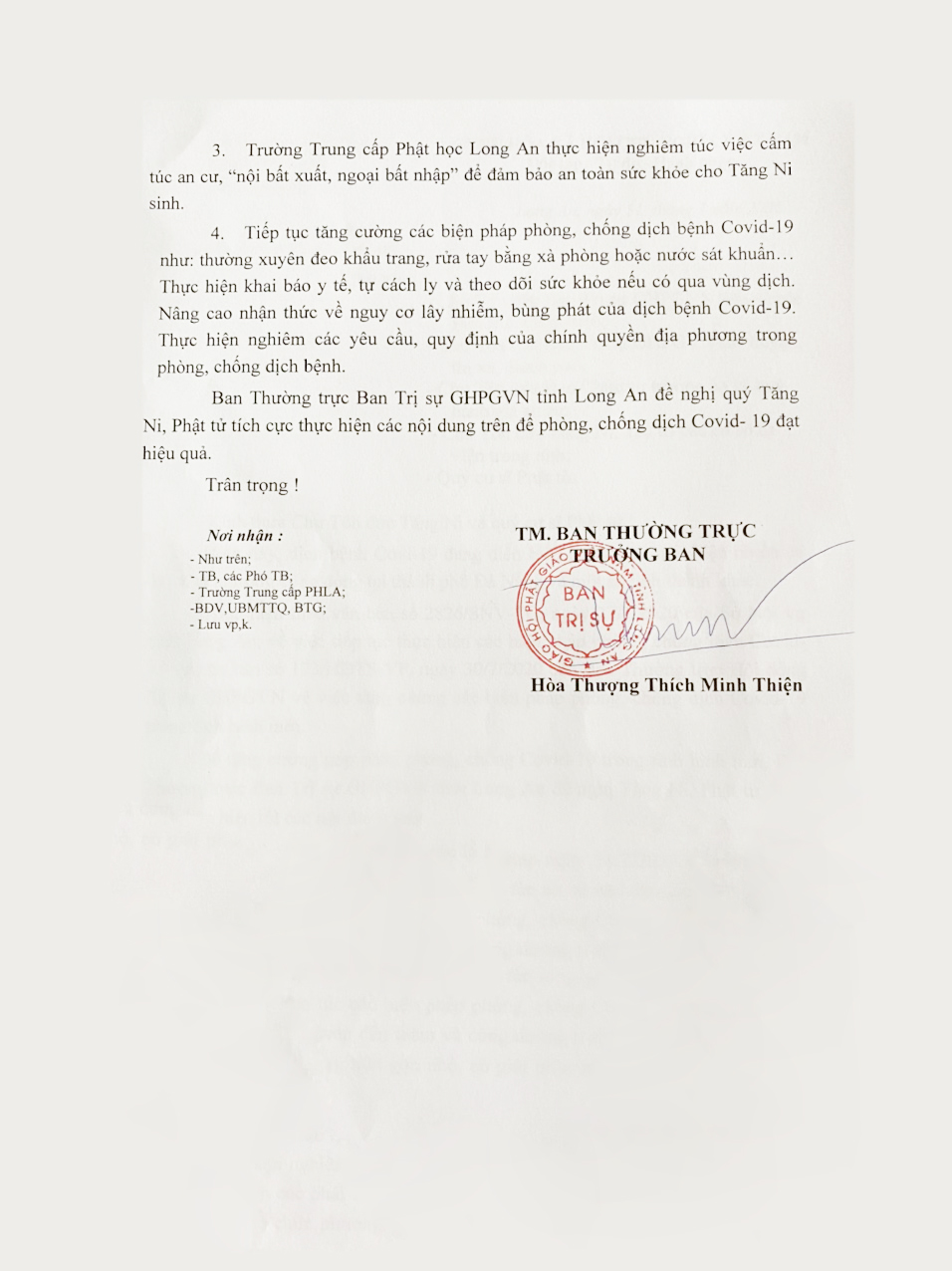 Ban Thường trực Ban Trị sự GHPGVN tỉnh Long An đề nghị quý Tăng Ni, Phật tử tích cực thực hiện các nội dung trên để phòng, chống dịch Covid- 19 đạt hiệu quả.
