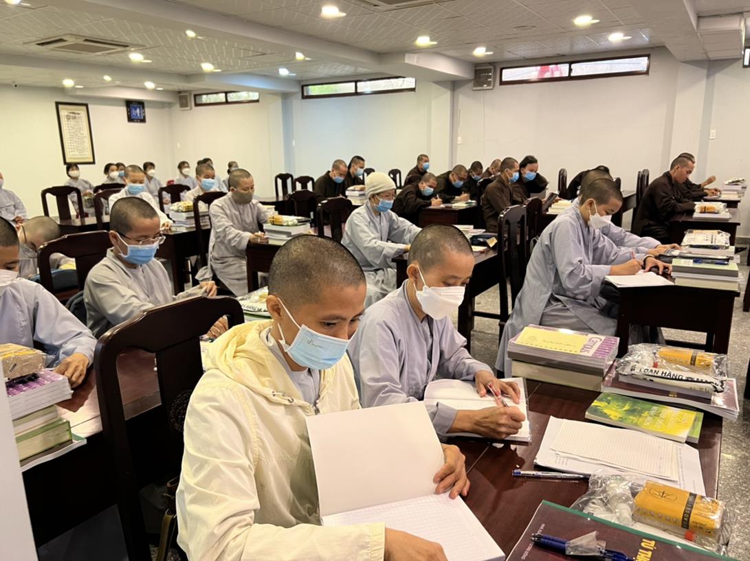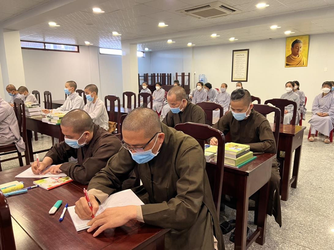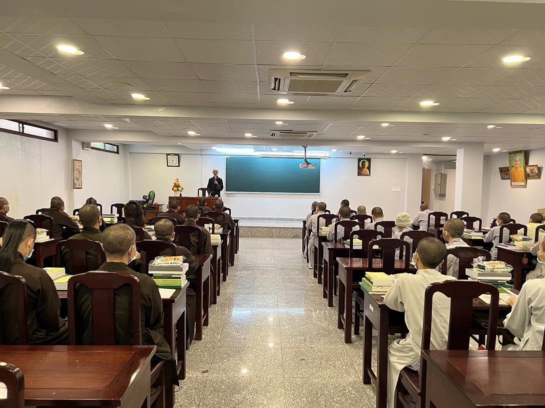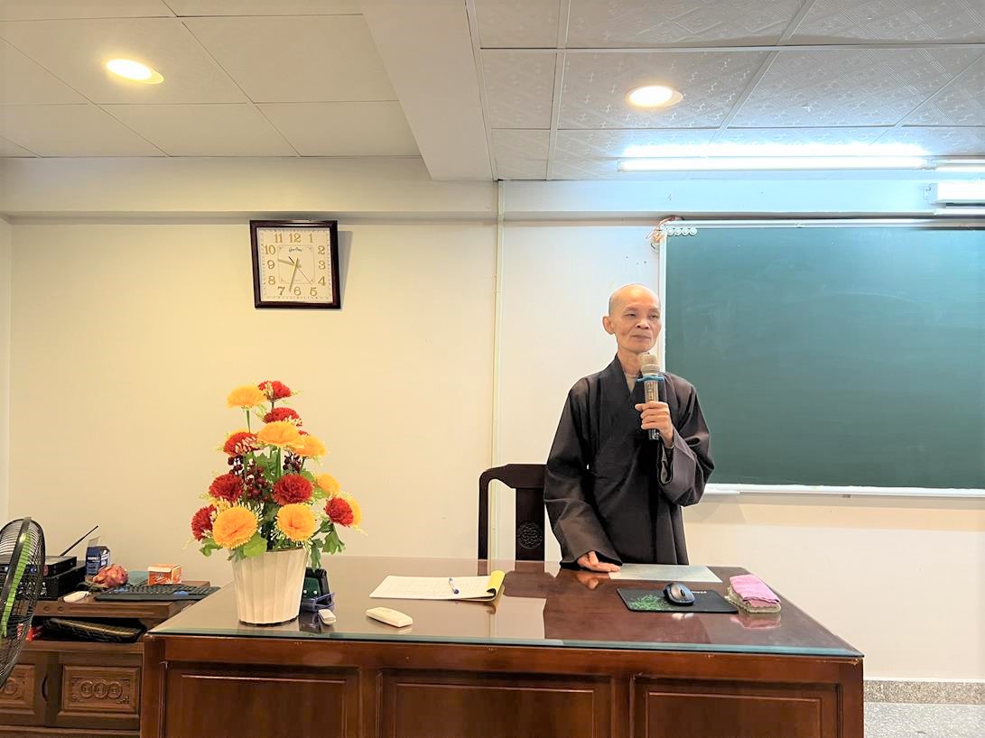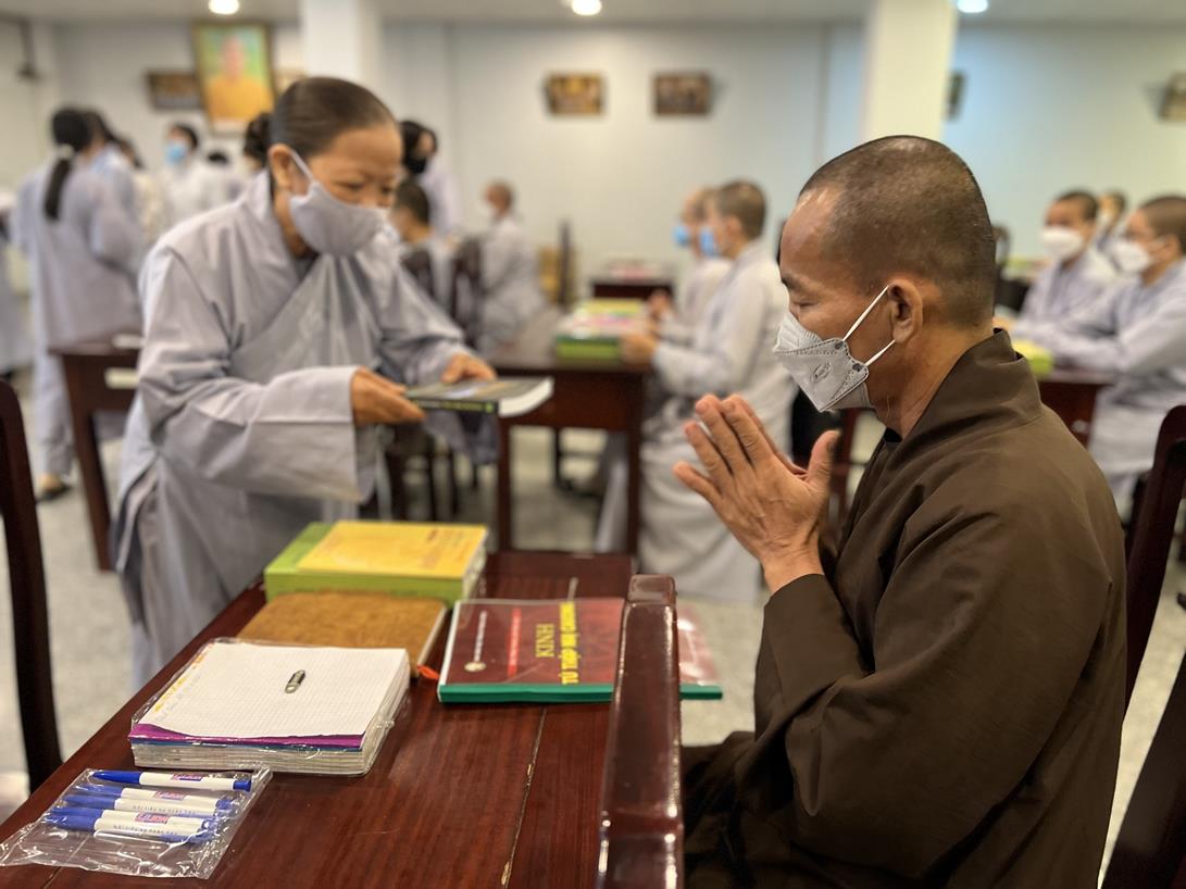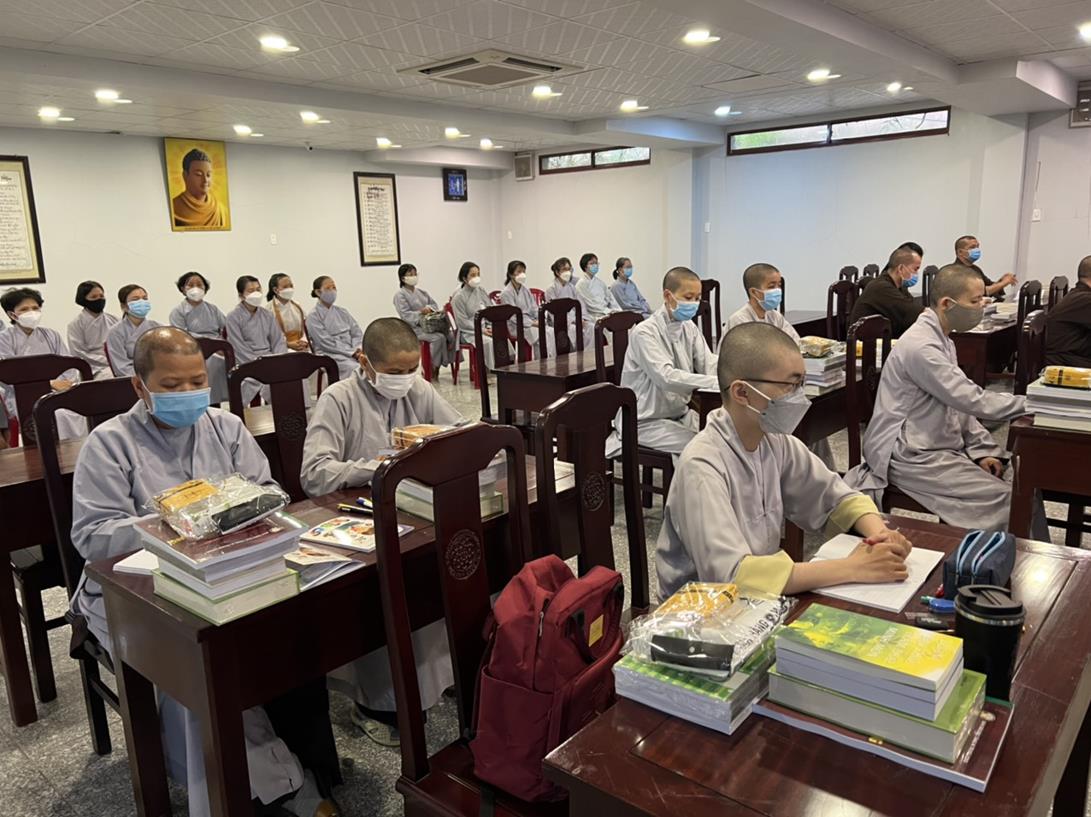 Sau khi hướng dẫn Phật tử cúng dường xong, Đại đức Thích Tắc Nguyên bắt đầu dạy môn Phật pháp căn bản cho Tăng Ni sinh khóa VIII.