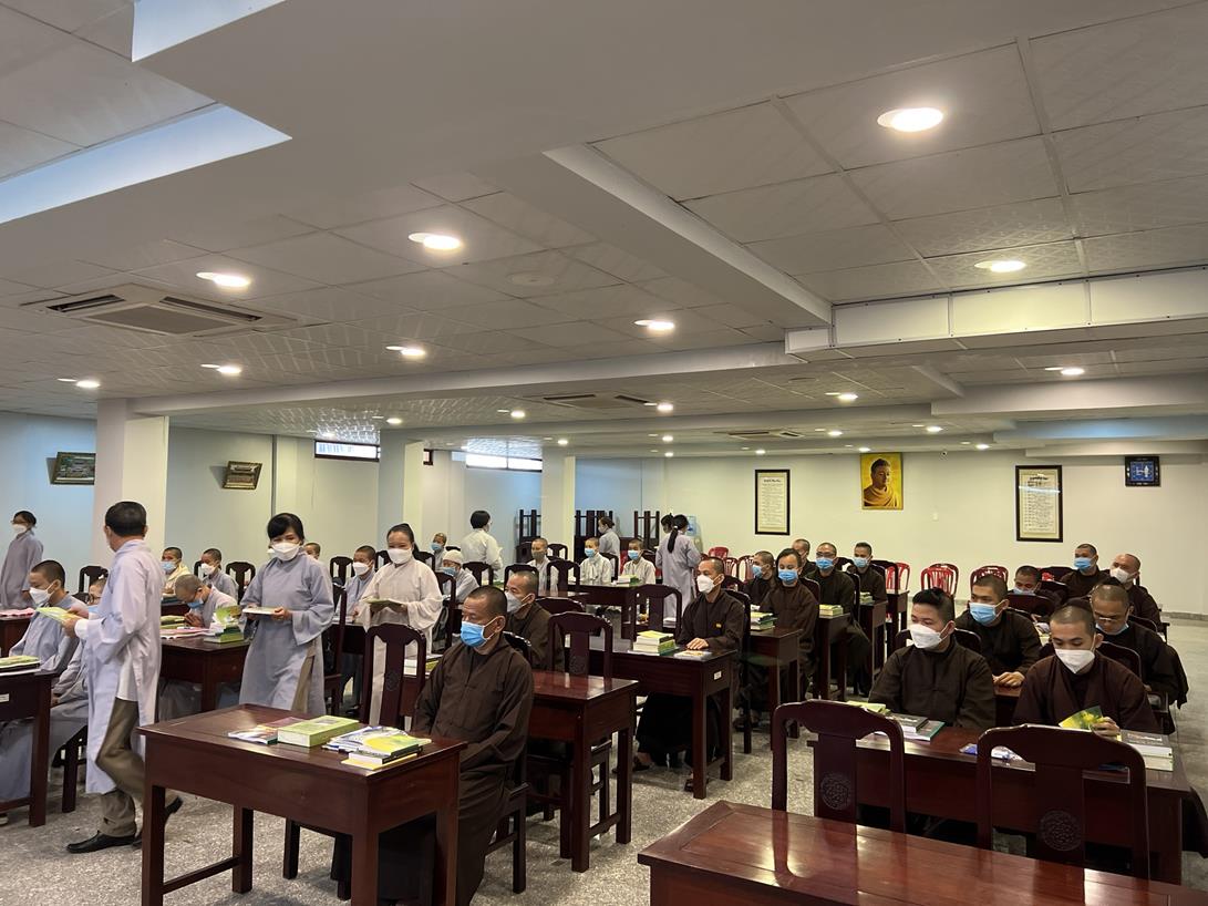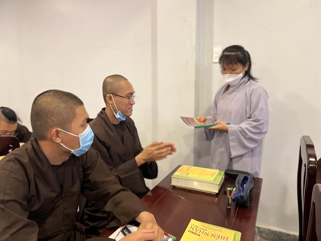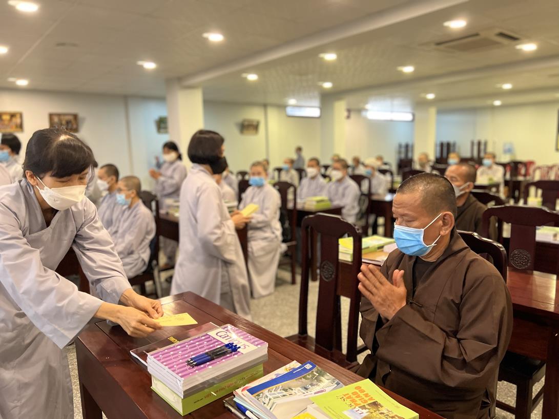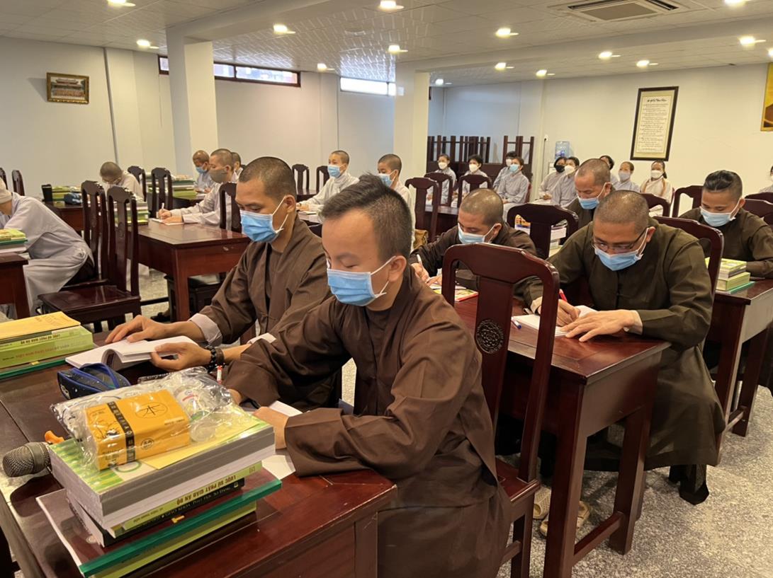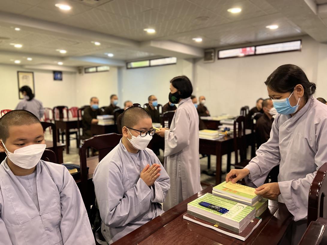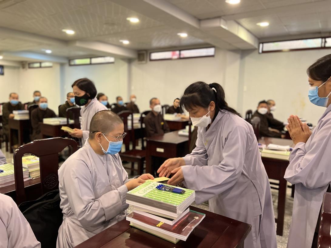 Sau khi hướng dẫn Phật tử cúng dường xong, Đại đức Thích Tắc Nguyên bắt đầu dạy môn Phật pháp căn bản cho Tăng Ni sinh khóa VIII.