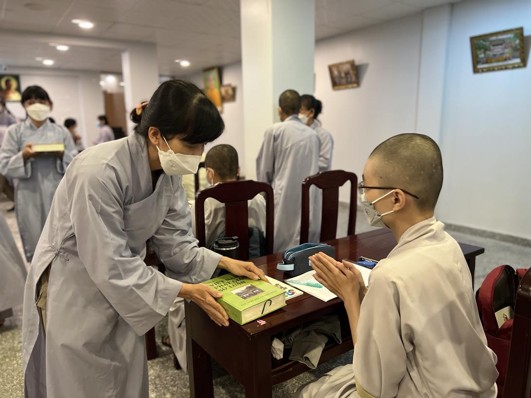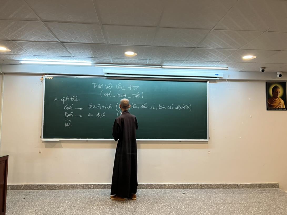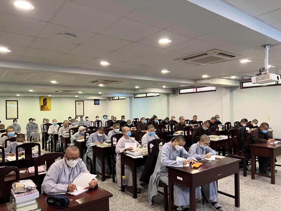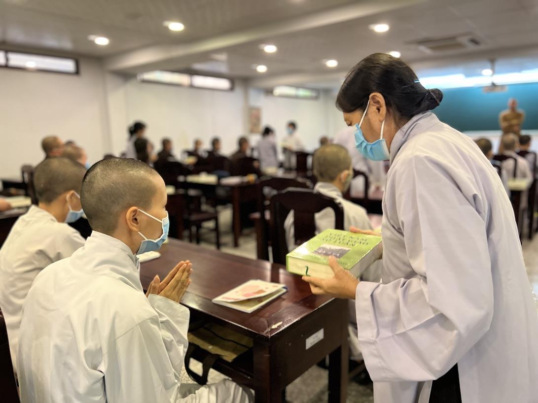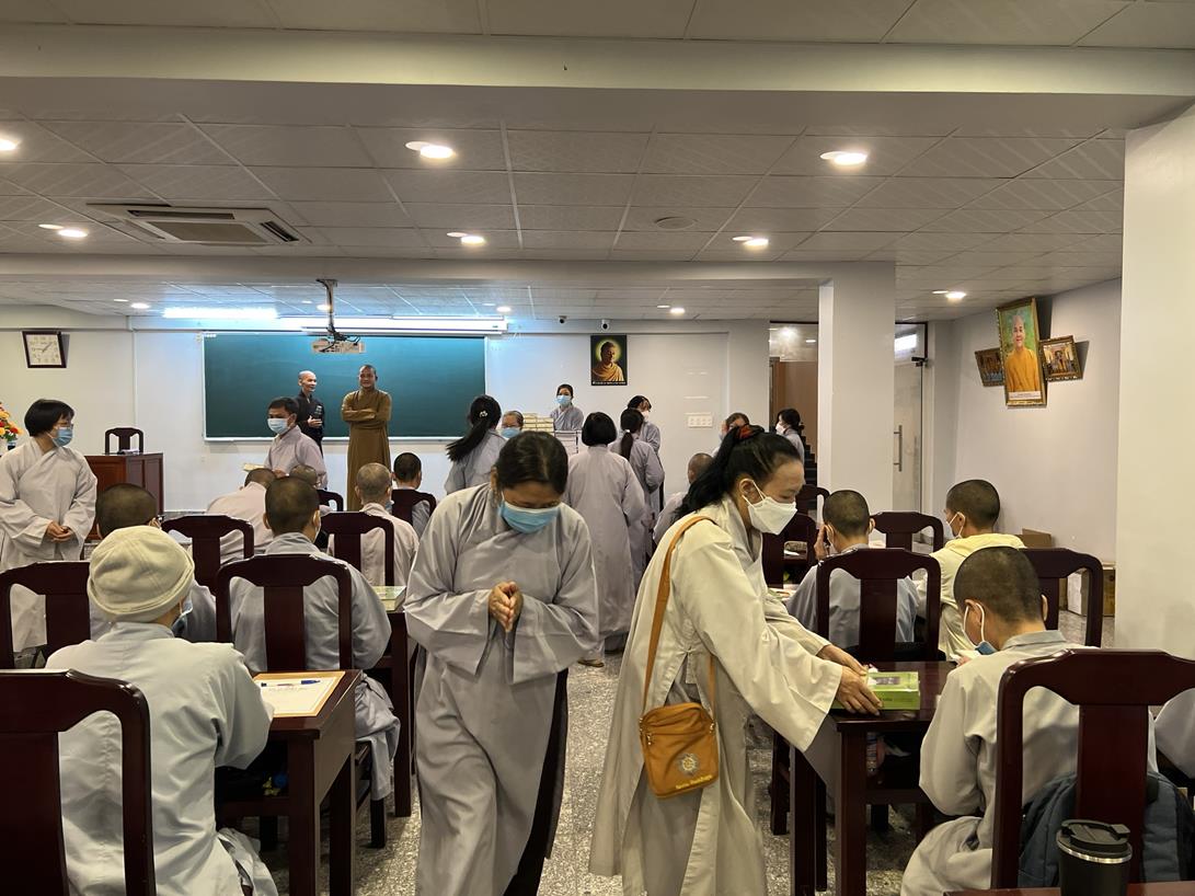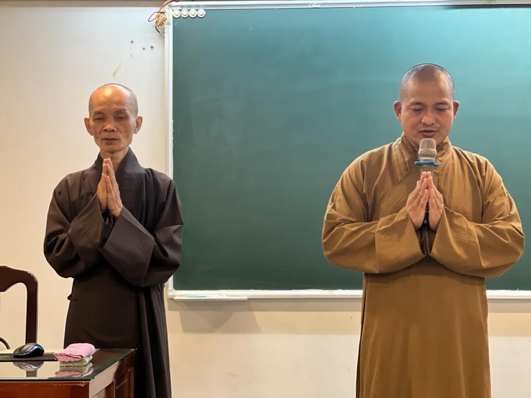 Sau khi hướng dẫn Phật tử cúng dường xong, Đại đức Thích Tắc Nguyên bắt đầu dạy môn Phật pháp căn bản cho Tăng Ni sinh khóa VIII.