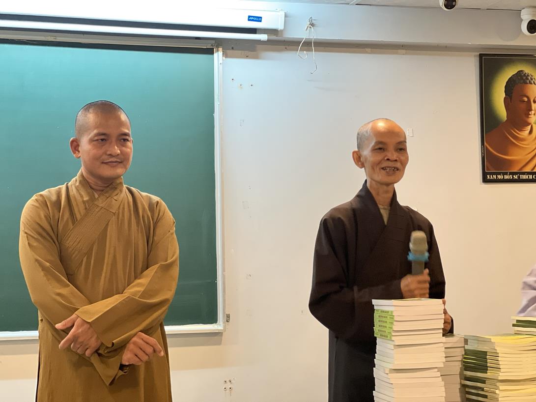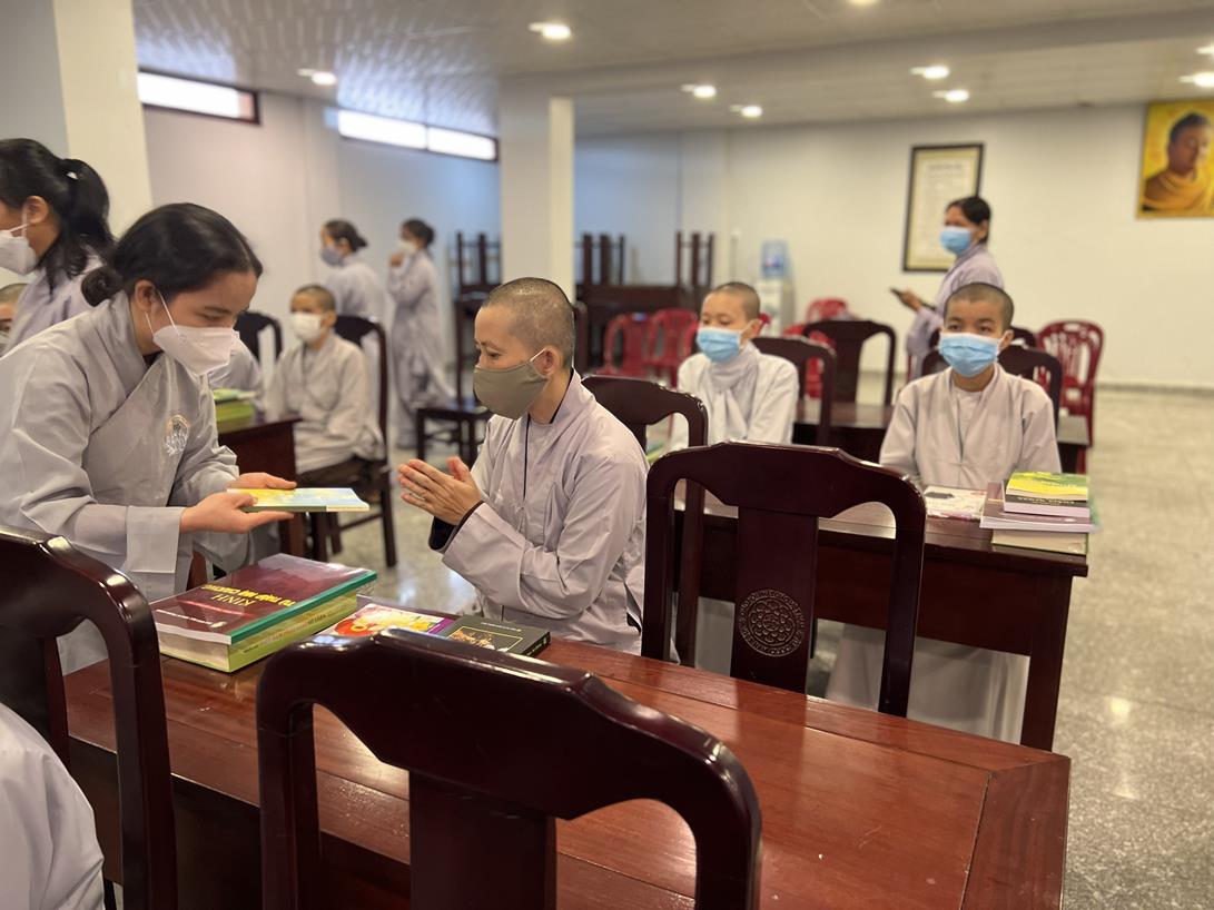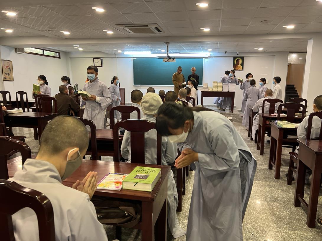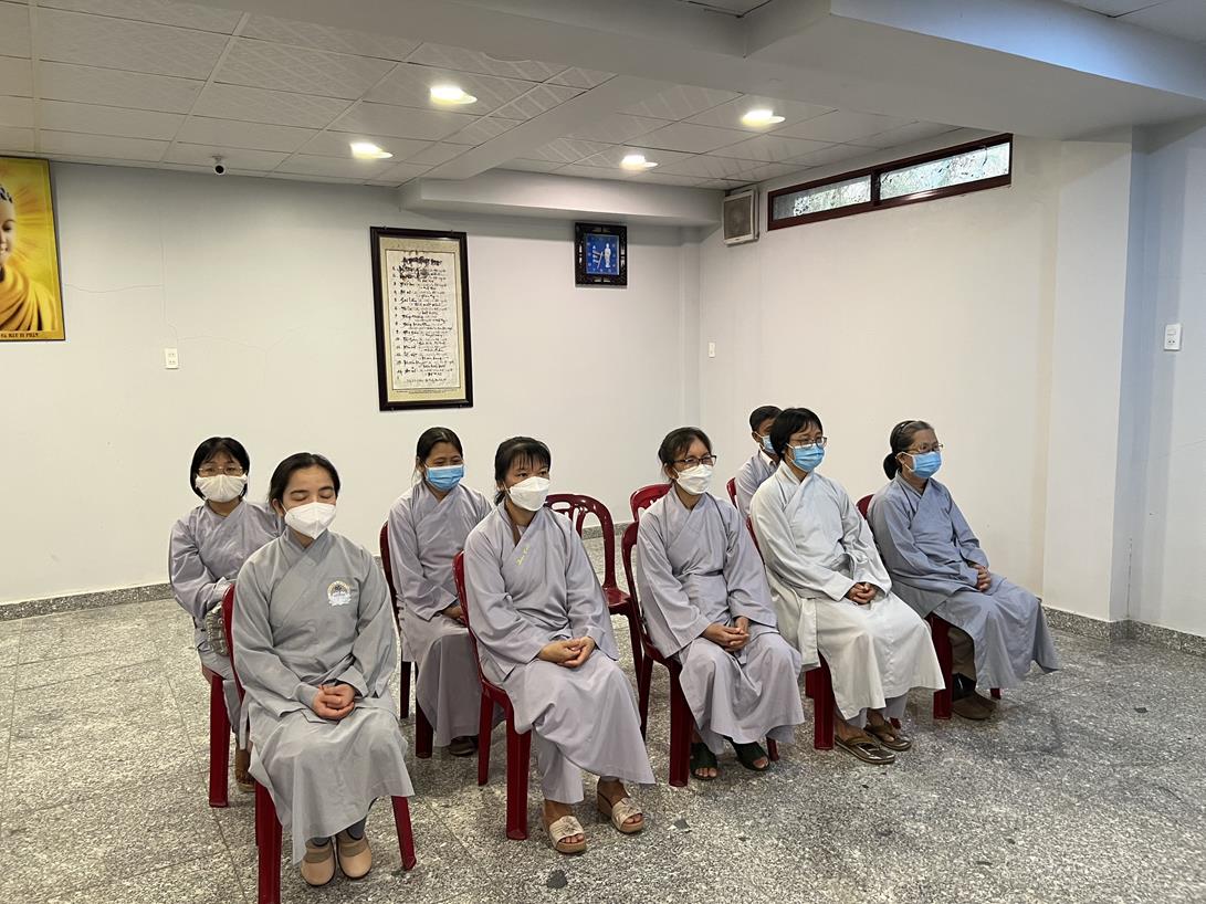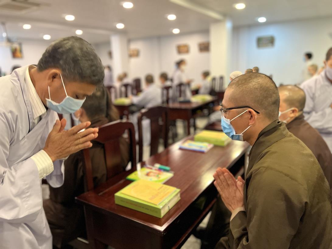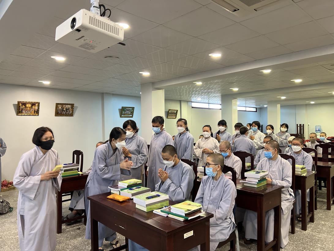 Sau khi hướng dẫn Phật tử cúng dường xong, Đại đức Thích Tắc Nguyên bắt đầu dạy môn Phật pháp căn bản cho Tăng Ni sinh khóa VIII.