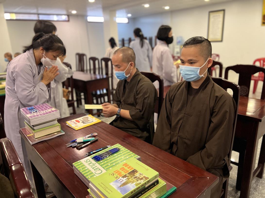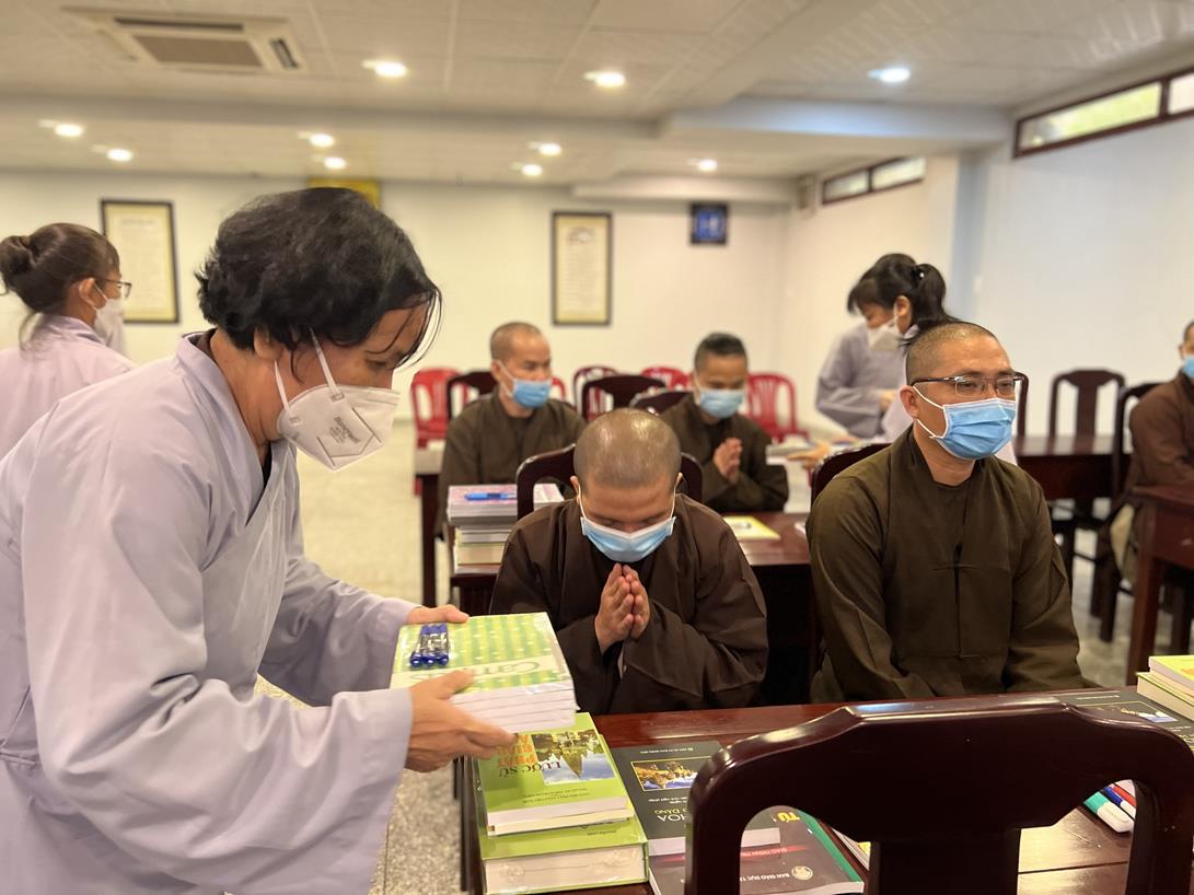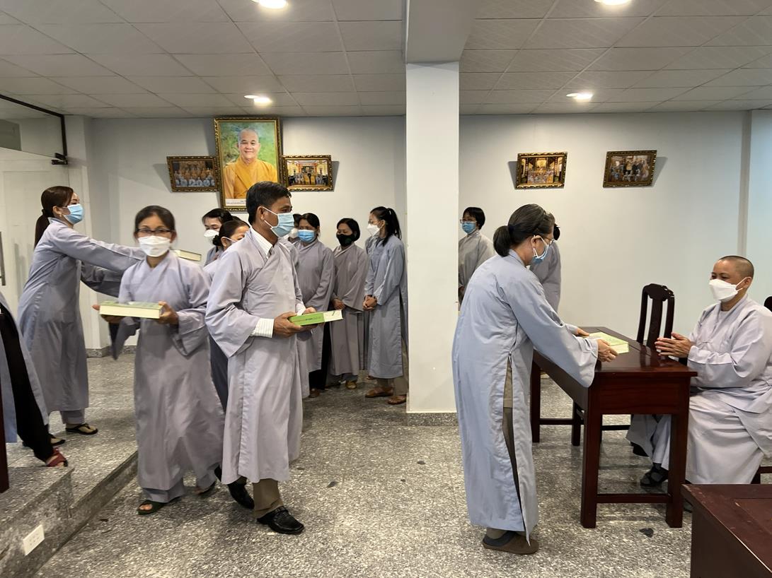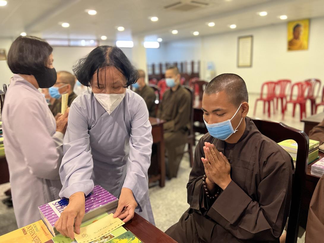 Đại đức Thích Tắc Nguyên và Phật tử chùa Tôn Thạnh cúng dường pháp bảo cho Tăng Ni sinh khóa VIII Trung cấp Phật học Long An