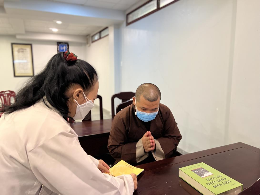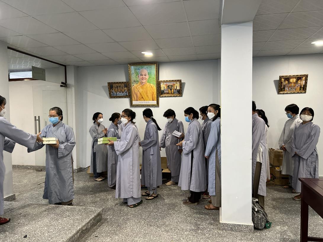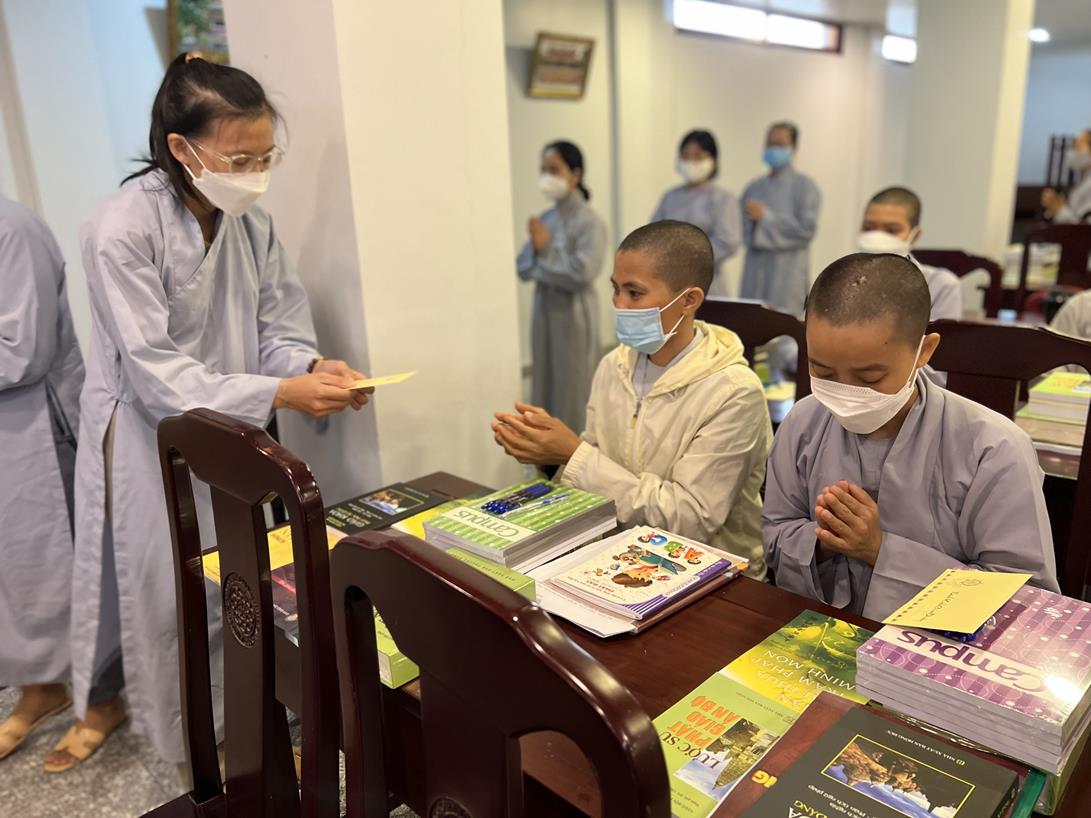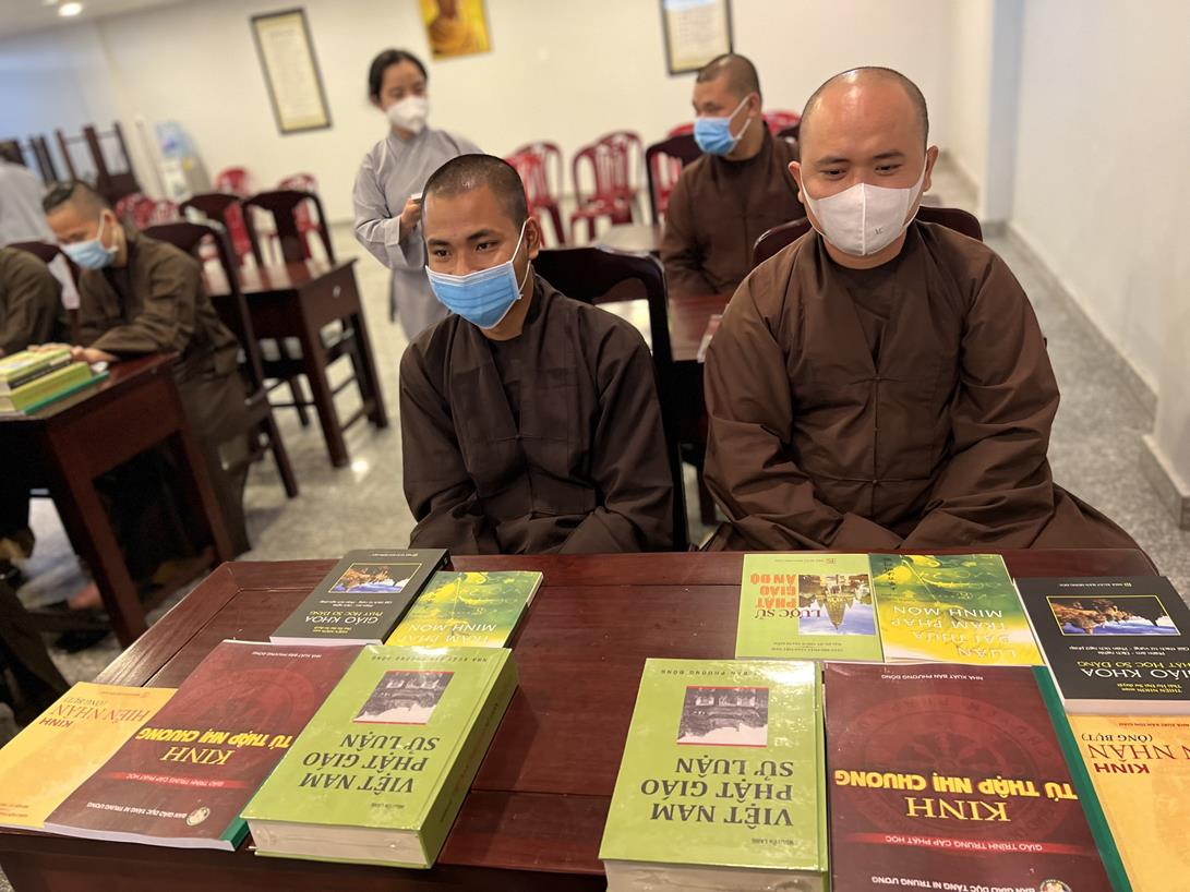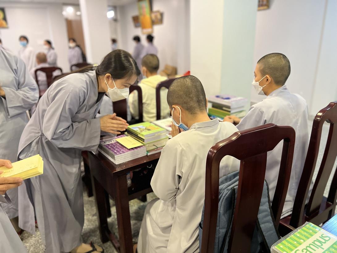 Đại đức Thích Tắc Nguyên và Phật tử chùa Tôn Thạnh cúng dường pháp bảo cho Tăng Ni sinh khóa VIII Trung cấp Phật học Long An