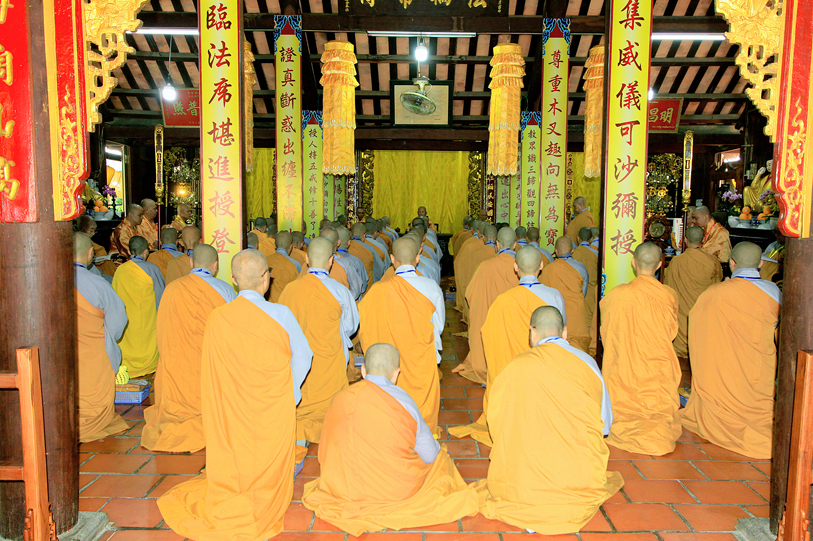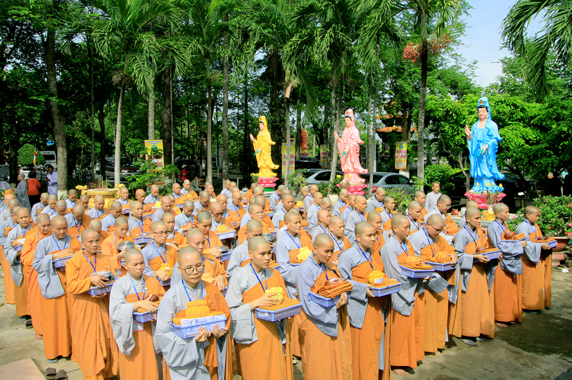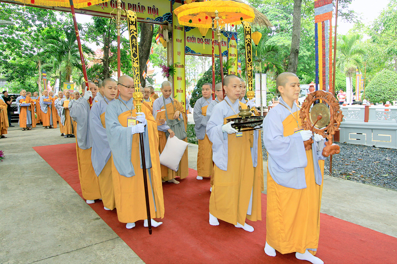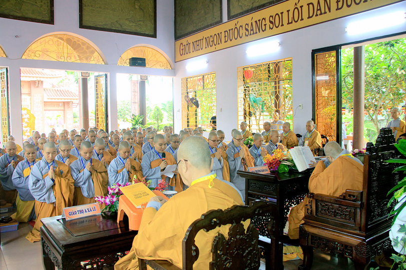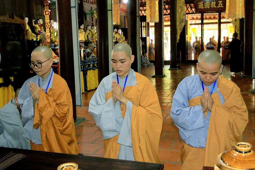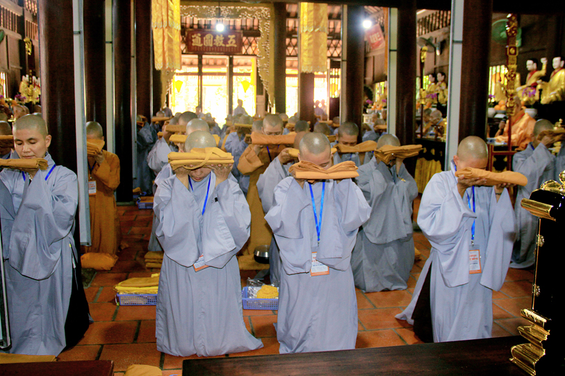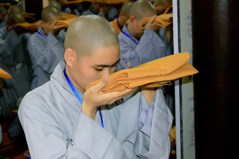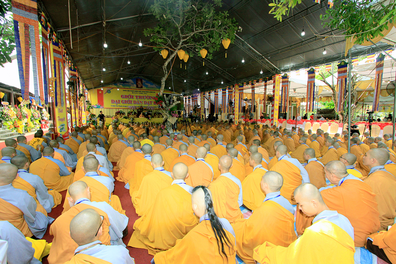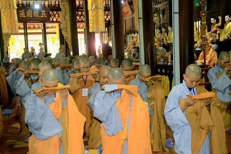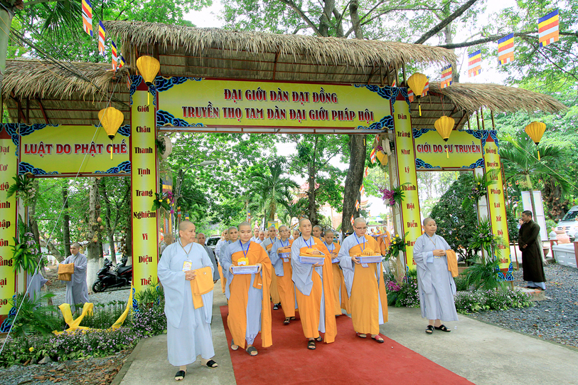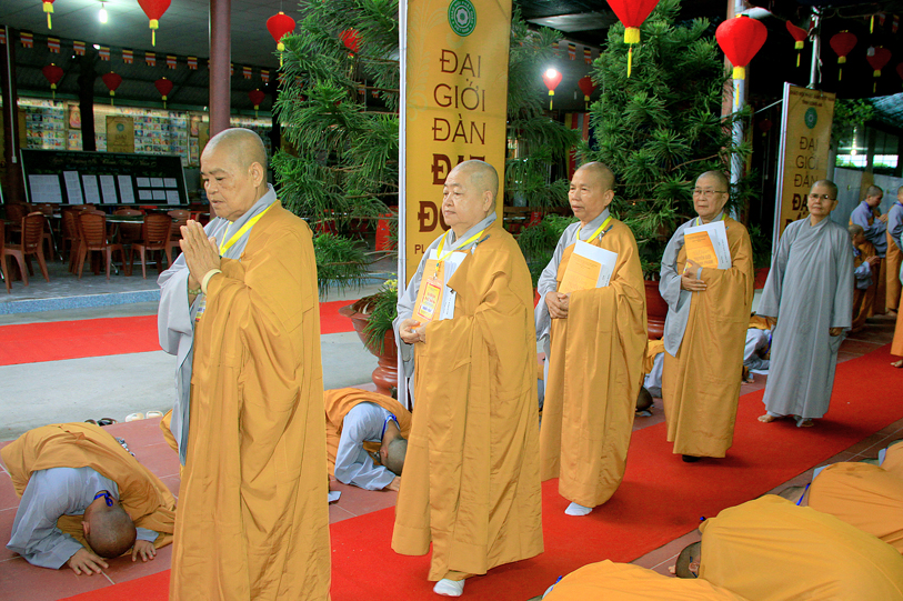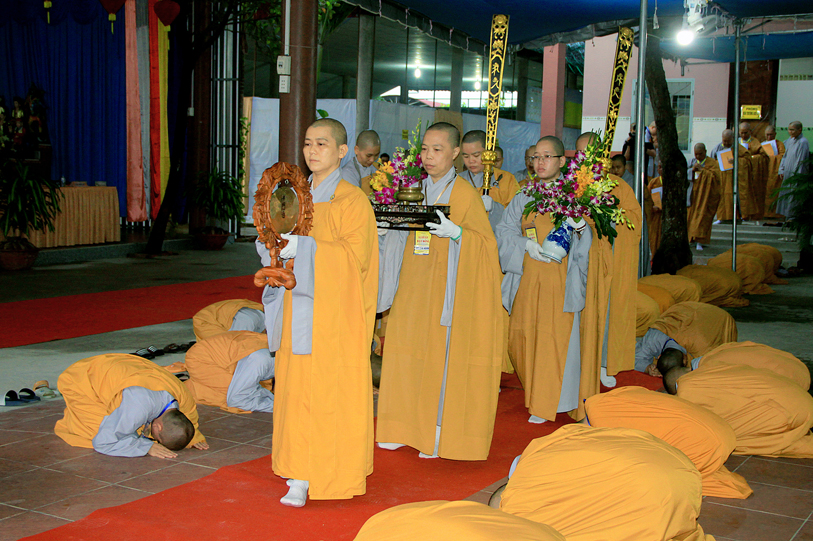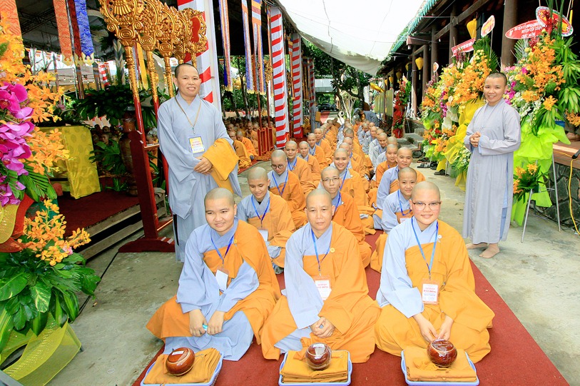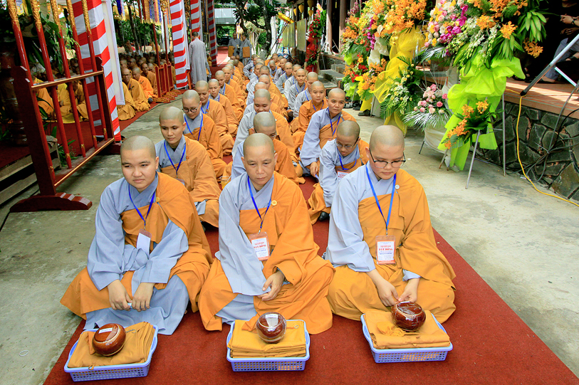 Từng hồi chuông trống trầm hùng đồng trỗi nhịp, các giới tử phủ phục hai hàng, nghi lễ trang nghiêm, tạo nên quang cảnh thiêng liêng vô cùng trang trọng. Lời điển lễ thanh tao, hòa nhịp trong tiếng thủ xích uy nghiêm, giới tử nhiếp phục sáu căn, trần tâm đoạn tuyệt. Ba y vừa đắp, đại nguyện tràn dâng, lối vào Phật đạo thênh thang rộng mở.