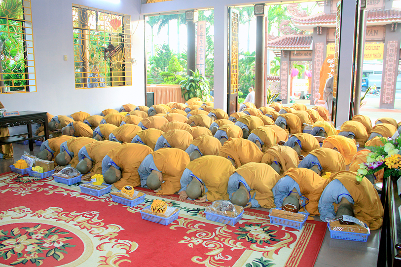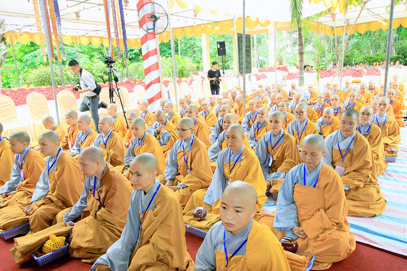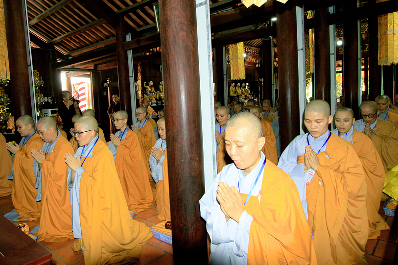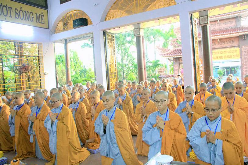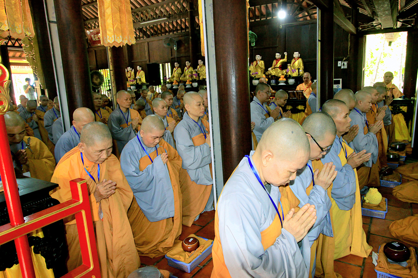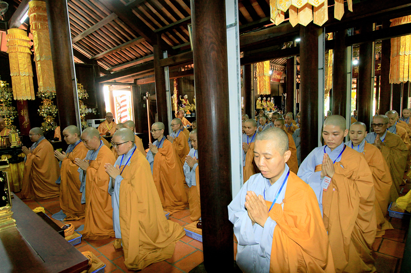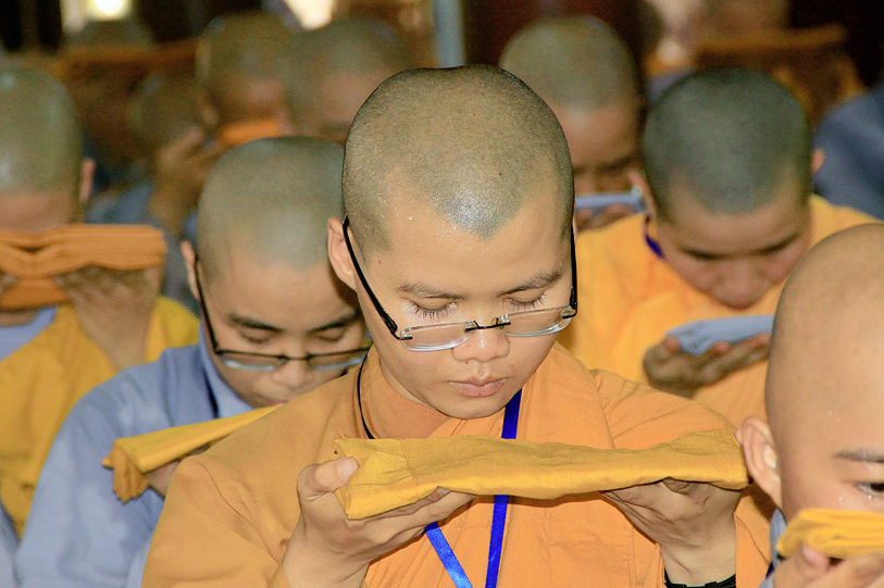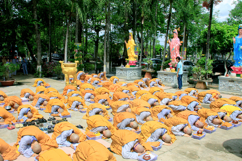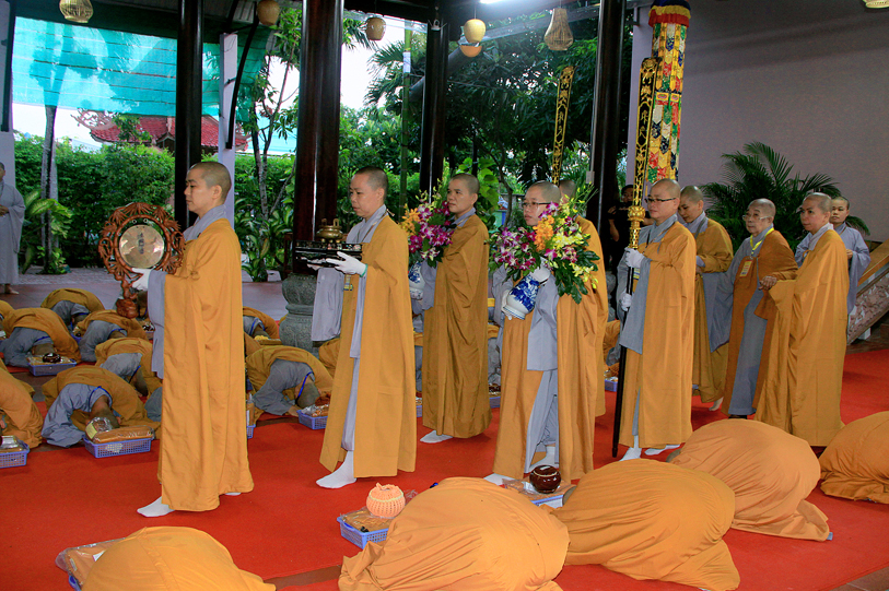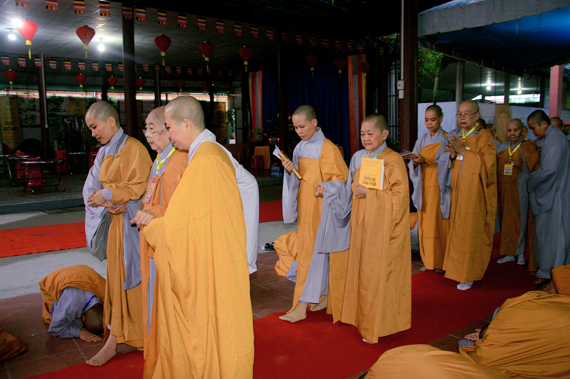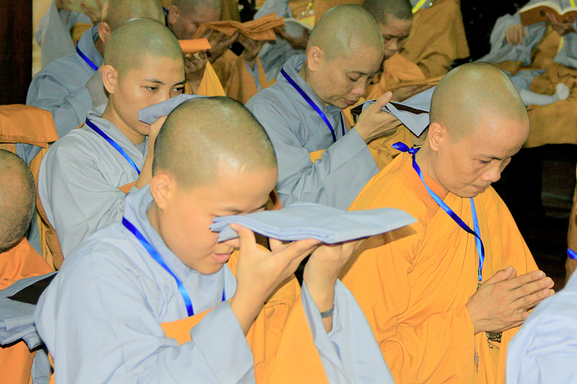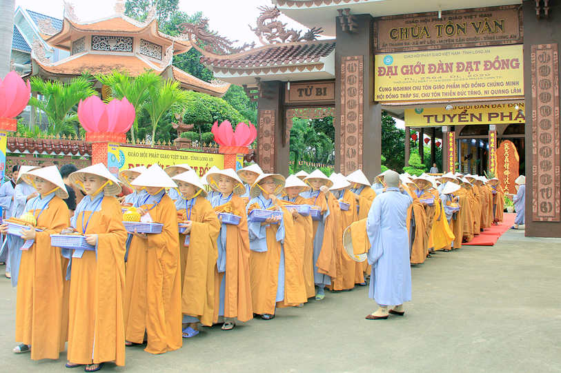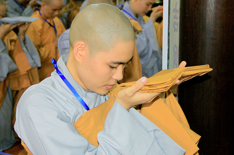 Từng hồi chuông trống trầm hùng đồng trỗi nhịp, các giới tử phủ phục hai hàng, nghi lễ trang nghiêm, tạo nên quang cảnh thiêng liêng vô cùng trang trọng. Lời điển lễ thanh tao, hòa nhịp trong tiếng thủ xích uy nghiêm, giới tử nhiếp phục sáu căn, trần tâm đoạn tuyệt. Ba y vừa đắp, đại nguyện tràn dâng, lối vào Phật đạo thênh thang rộng mở.