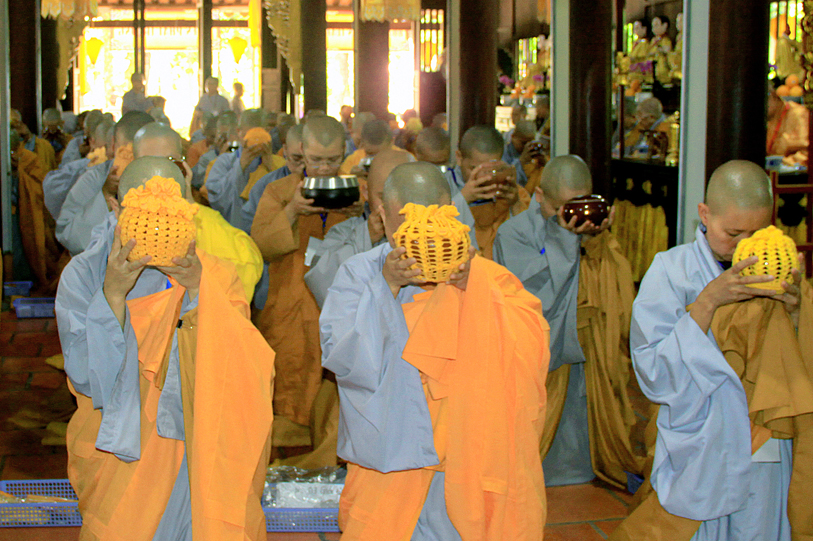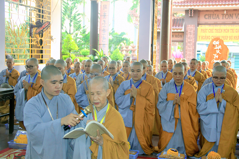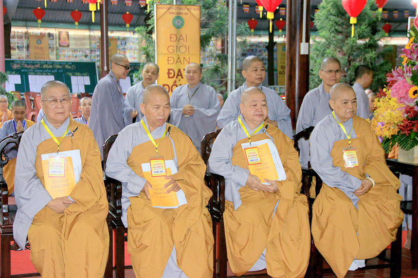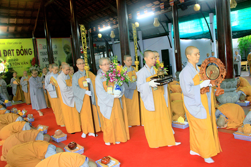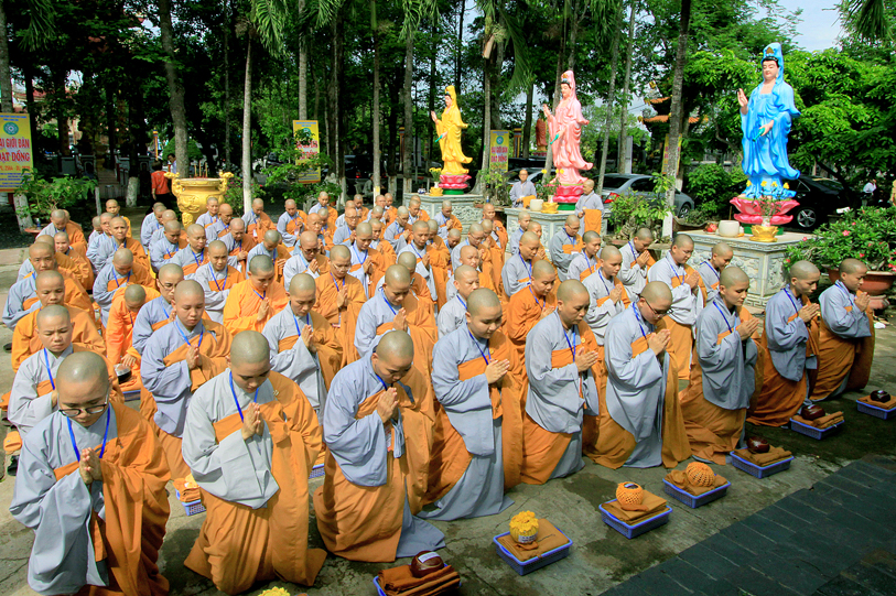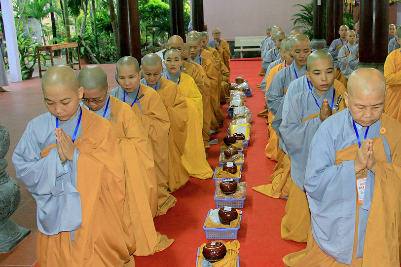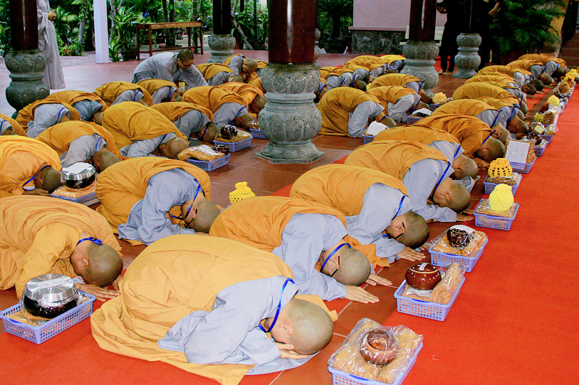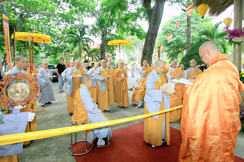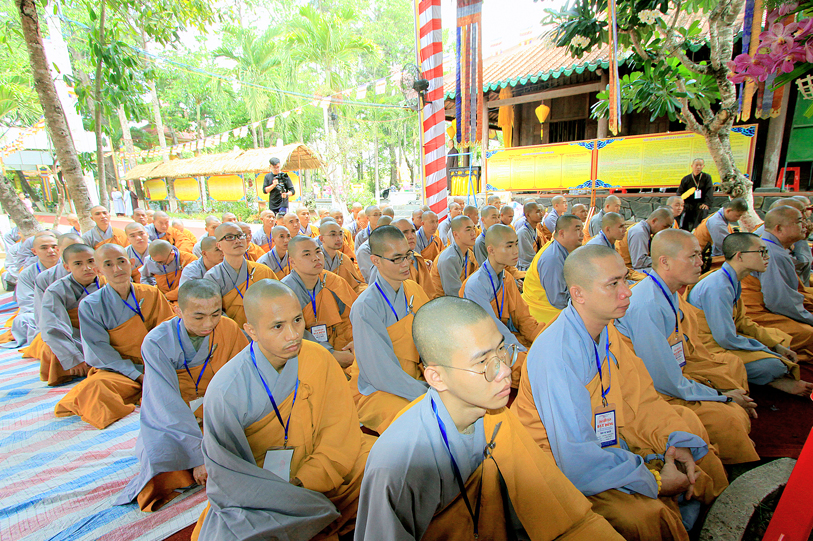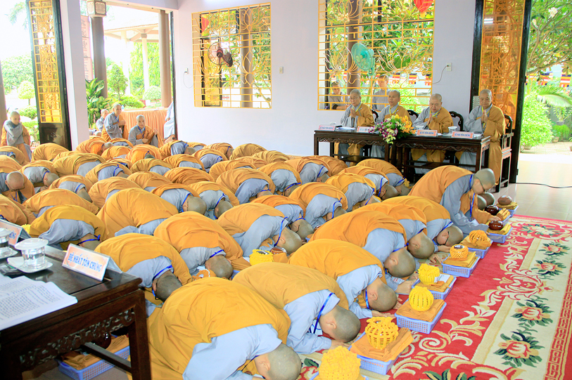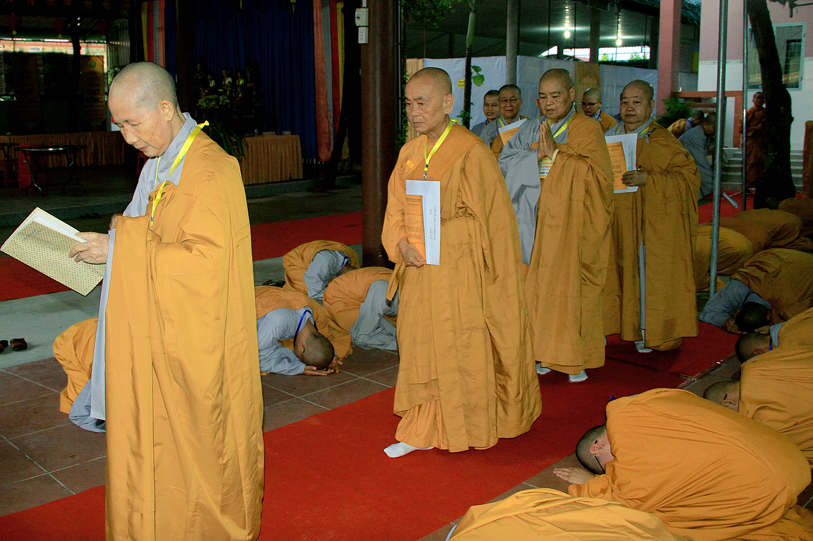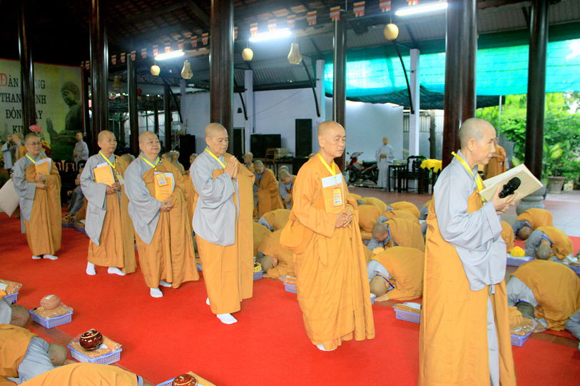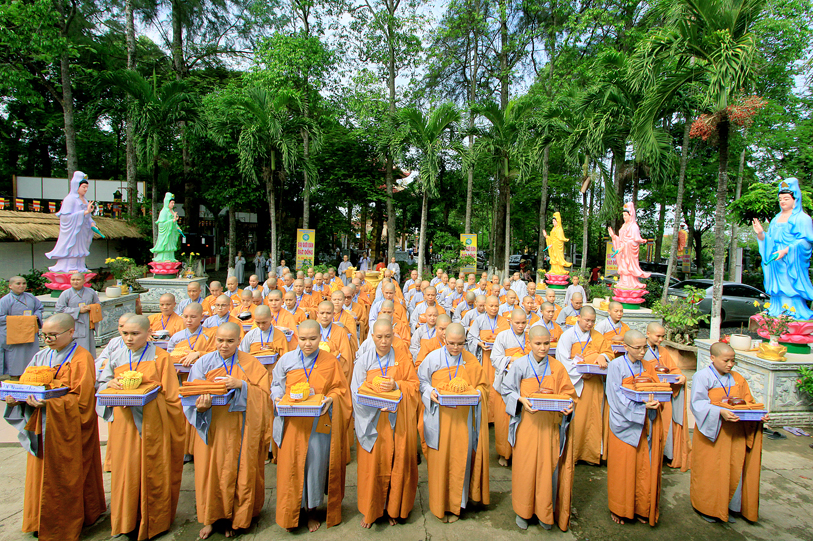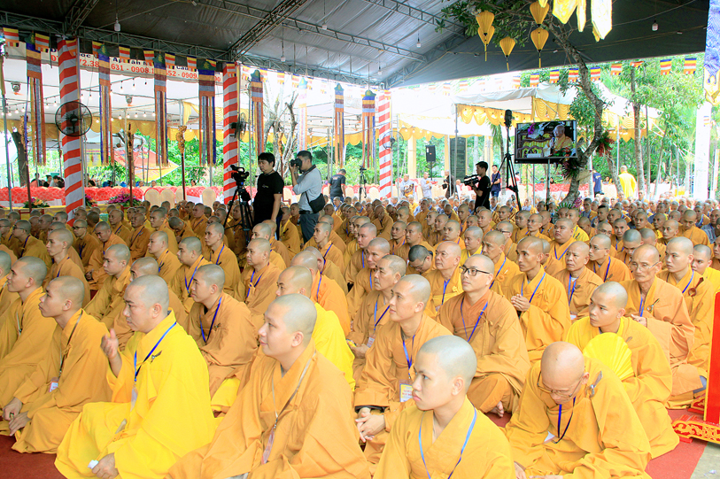 Từng hồi chuông trống trầm hùng đồng trỗi nhịp, các giới tử phủ phục hai hàng, nghi lễ trang nghiêm, tạo nên quang cảnh thiêng liêng vô cùng trang trọng. Lời điển lễ thanh tao, hòa nhịp trong tiếng thủ xích uy nghiêm, giới tử nhiếp phục sáu căn, trần tâm đoạn tuyệt. Ba y vừa đắp, đại nguyện tràn dâng, lối vào Phật đạo thênh thang rộng mở.